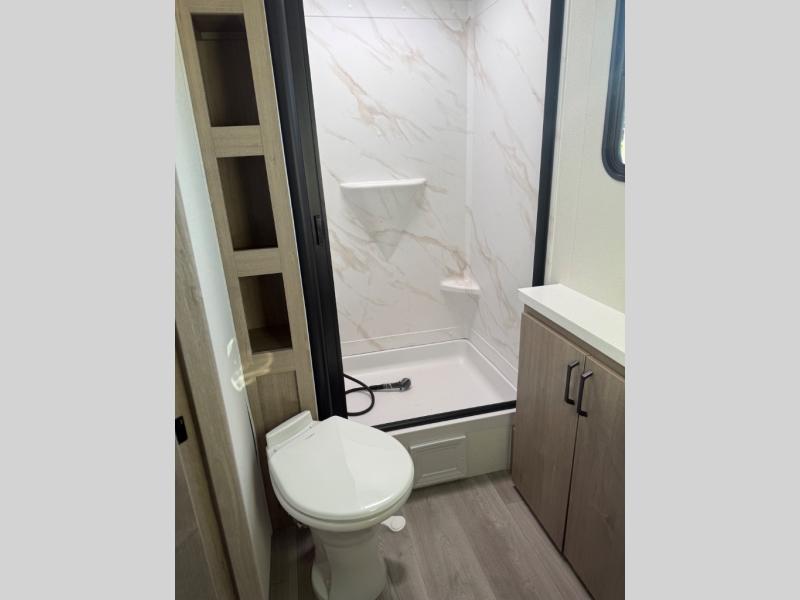 What I liked most: Bunk area area lifts up for additional storage which is very unique. Place for shoes. The bathroom shower surround has a brick molded design look.