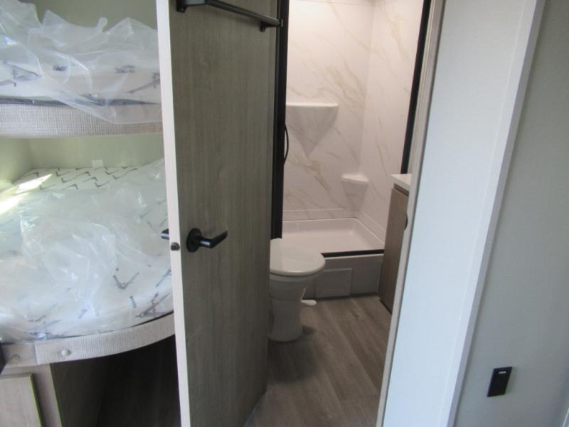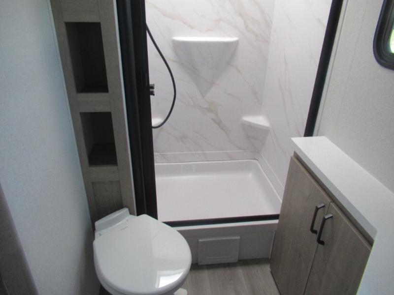 What I liked most: Bunk area area lifts up for additional storage which is very unique. Place for shoes. The bathroom shower surround has a brick molded design look.