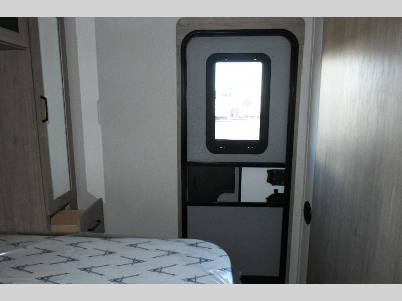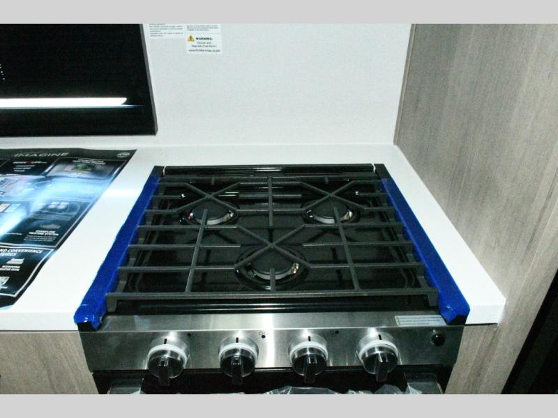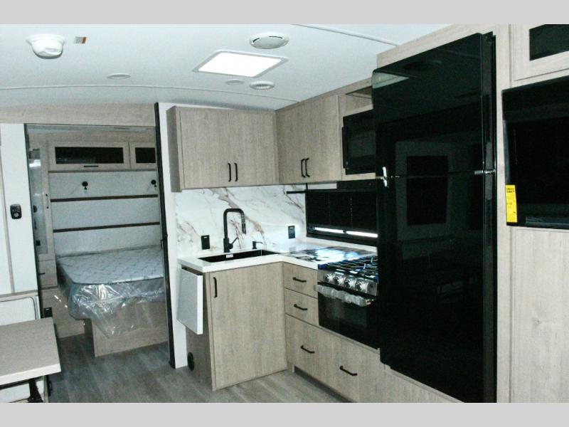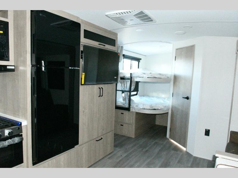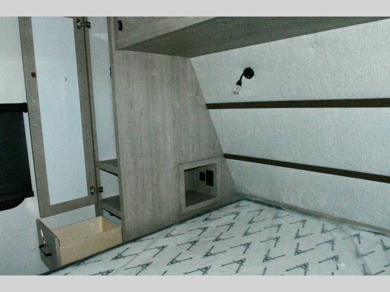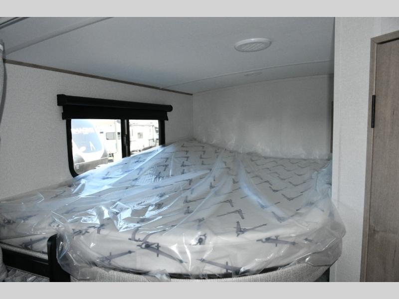 From sunrise hikes to sunset campfires, the Imagine 2800BH is ready to handle every part of your trip. Inside, you’ll find a private front bedroom with a residential 60" x 80" queen bed, wardrobe storage, and sliding doors for added privacy. The rear of the trailer features double-size bunk beds with privacy curtains and wide sleeping space perfect for kids or guests.