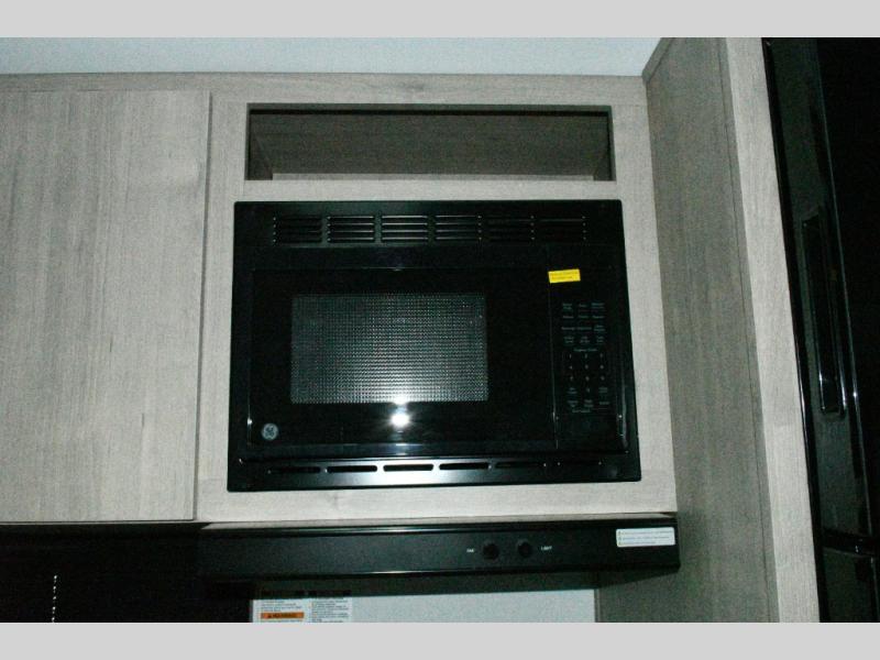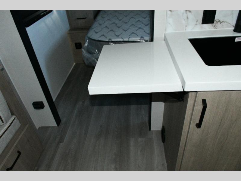 • Kitchen with flip-up countertop extension, microwave, fridge, and three-burner range