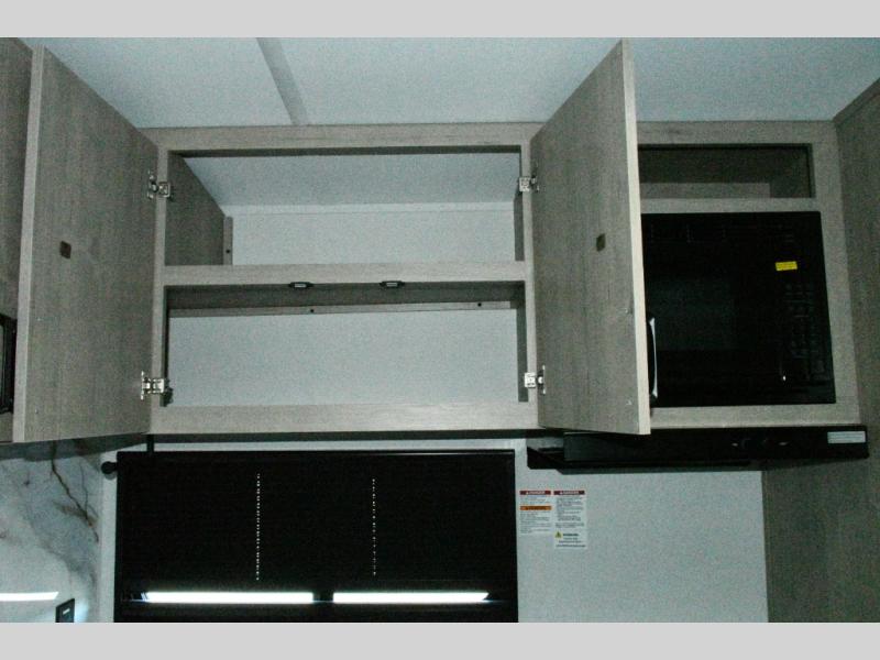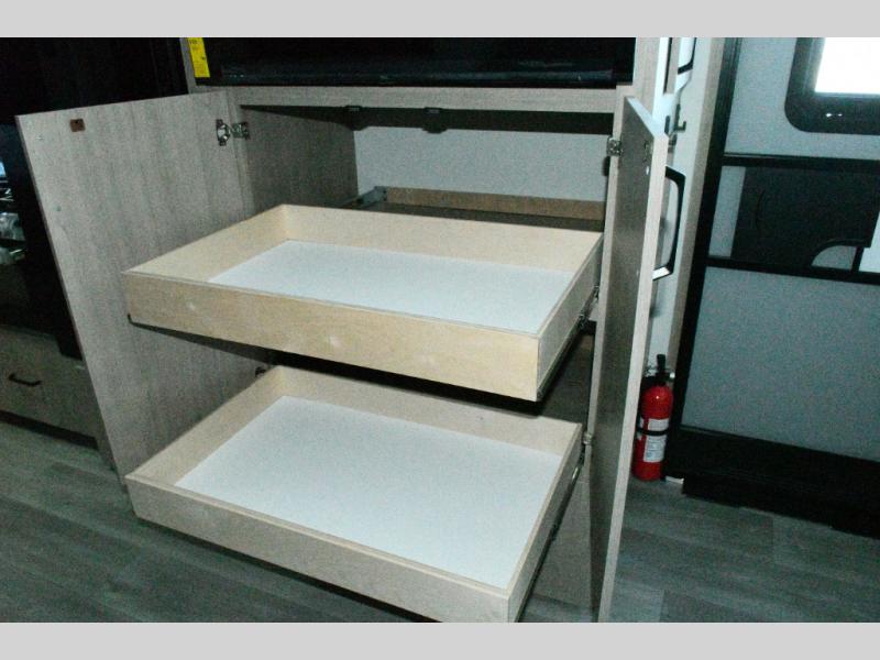 Love cooking on the road? You’ll appreciate the three-burner cooktop, microwave, large refrigerator, and pantry inside. When the weather’s right, head outside to the outdoor kitchen, complete with griddle and exterior mini refrigerator—perfect for flipping pancakes under the morning sun or grilling burgers at sunset.