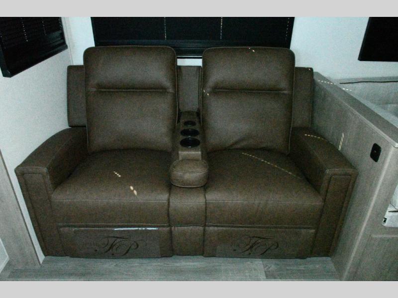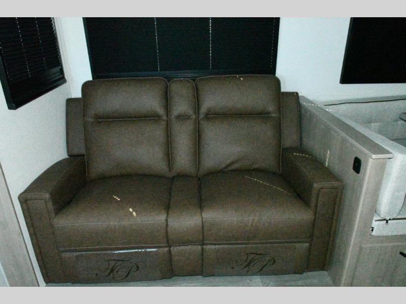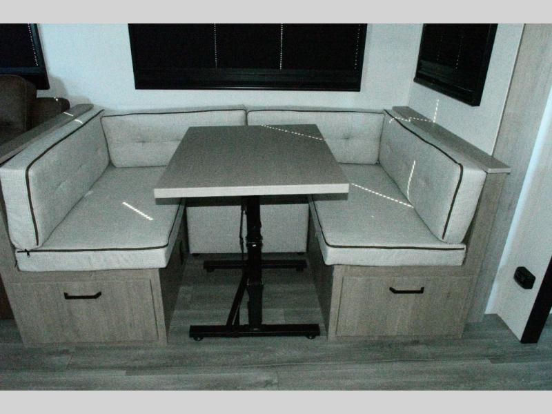 In the center of it all, the U-shaped dinette and tri-fold sofa create a welcoming space for meals, board games, or winding down with a good movie. Every inch is crafted for comfort, with panoramic windows bringing in plenty of light and scenic views.