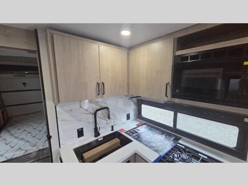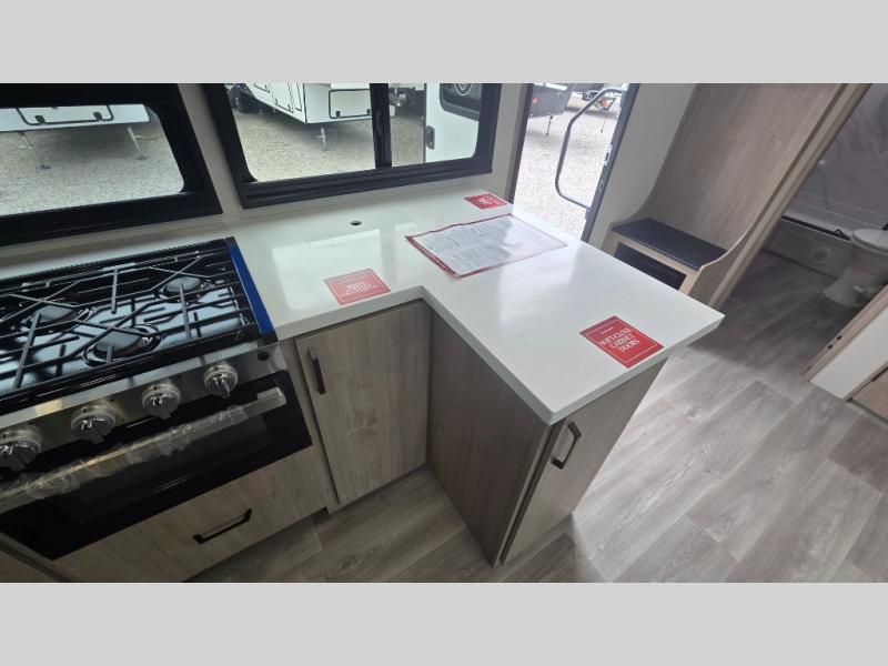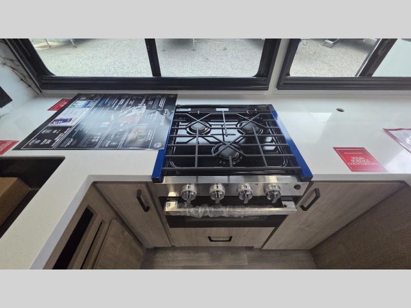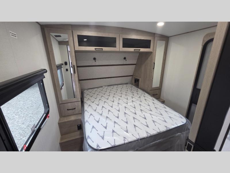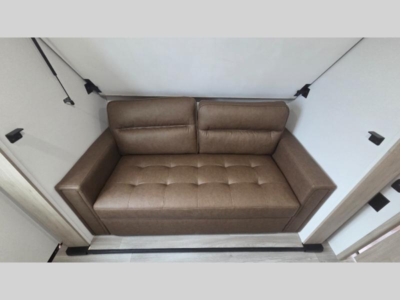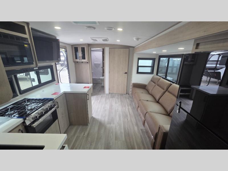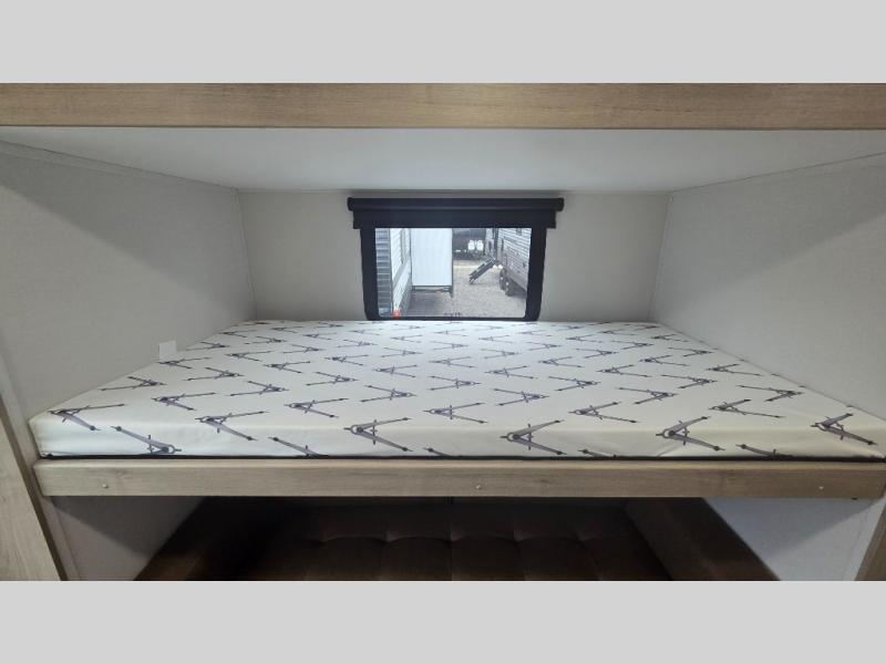 At the front of this 2810BH travel trailer, you’ll find a spacious full bedroom featuring a 60" x 80" queen bed, perfect for resting in comfort after a long day, along with dual wardrobes on each side to store your clothes and essentials. For added convenience, one of the two entry doors is located directly in the bedroom. Moving toward the center, the living area and kitchen create a welcoming space to relax and dine. The slide-out houses a quad theater seat, offering plenty of room to lounge, as well as a 10-cu. ft. refrigerator to keep your groceries fresh. Across from it, the U-shaped kitchen comes fully equipped with everything you need to cook comfortably, including a stainless-steel sink, three-burner range with oven, microwave, and solid surface countertops for meal prep. A bar top with stools provides a cozy dining spot, while a pull-out pantry keeps snacks organized. At the rear, the corner bathroom includes a 30" x 36" residential walk-in shower with skylight and a mirrored medicine cabinet, so you can skip the campsite facilities. Adjacent to it, the bunkhouse accommodates guests with a 36" flip-top bunk, tri-fold sofa, and even a flip-up desk, perfect for studying or remote work while on the road.