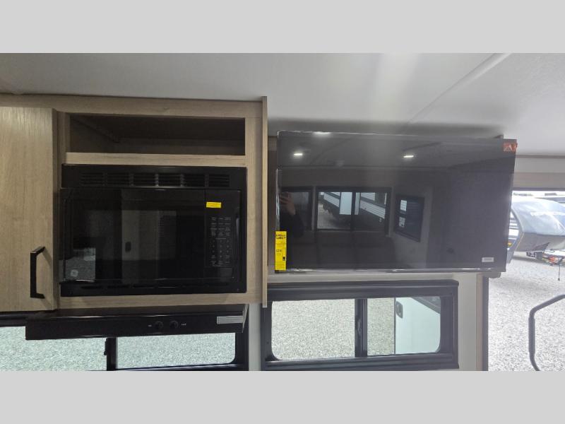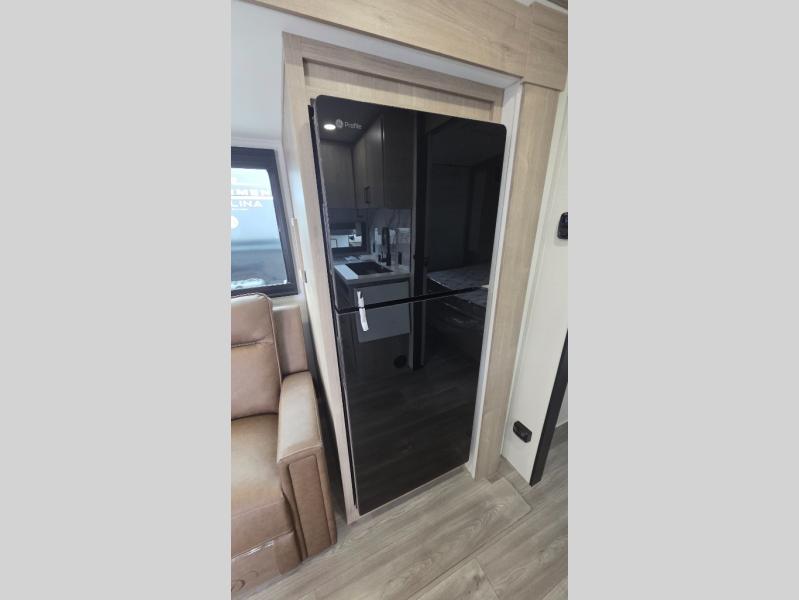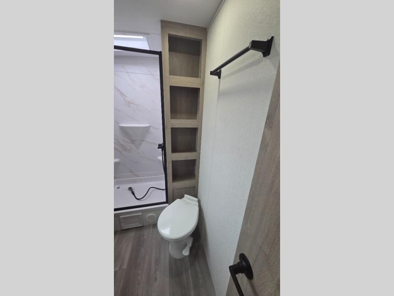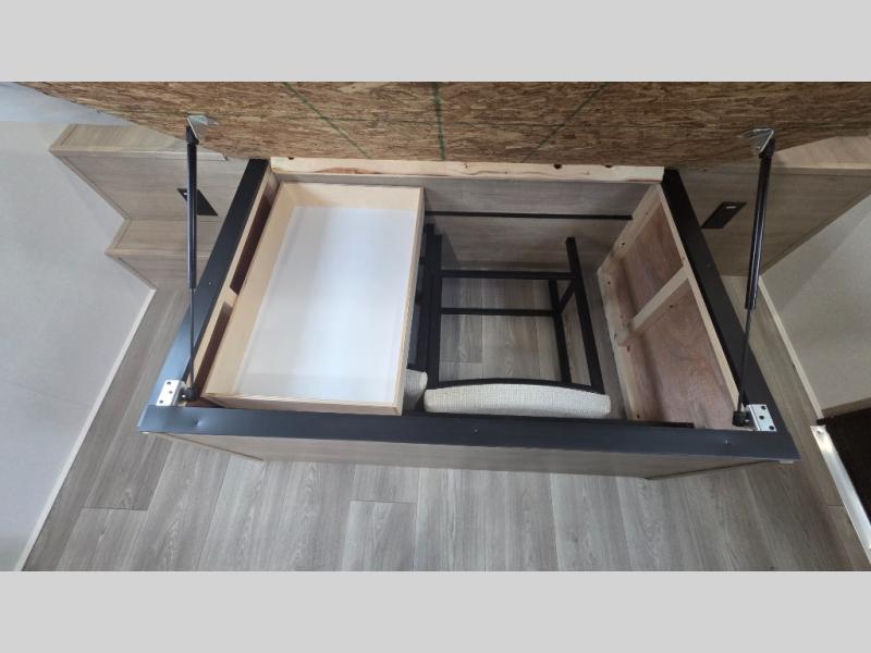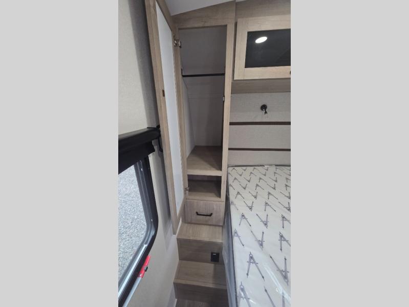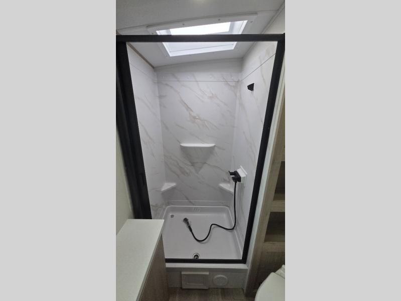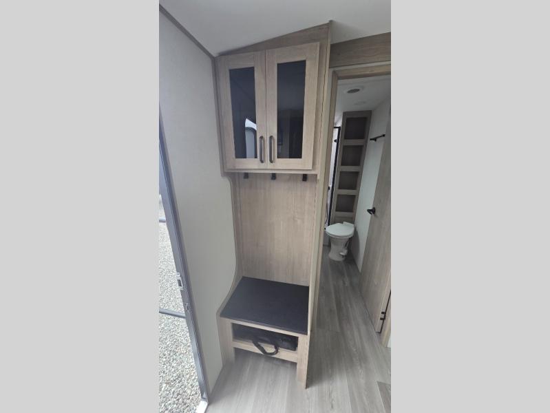 At the front of this 2810BH travel trailer, you’ll find a spacious full bedroom featuring a 60" x 80" queen bed, perfect for resting in comfort after a long day, along with dual wardrobes on each side to store your clothes and essentials. For added convenience, one of the two entry doors is located directly in the bedroom. Moving toward the center, the living area and kitchen create a welcoming space to relax and dine. The slide-out houses a quad theater seat, offering plenty of room to lounge, as well as a 10-cu. ft. refrigerator to keep your groceries fresh. Across from it, the U-shaped kitchen comes fully equipped with everything you need to cook comfortably, including a stainless-steel sink, three-burner range with oven, microwave, and solid surface countertops for meal prep. A bar top with stools provides a cozy dining spot, while a pull-out pantry keeps snacks organized. At the rear, the corner bathroom includes a 30" x 36" residential walk-in shower with skylight and a mirrored medicine cabinet, so you can skip the campsite facilities. Adjacent to it, the bunkhouse accommodates guests with a 36" flip-top bunk, tri-fold sofa, and even a flip-up desk, perfect for studying or remote work while on the road.