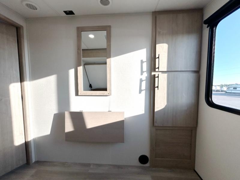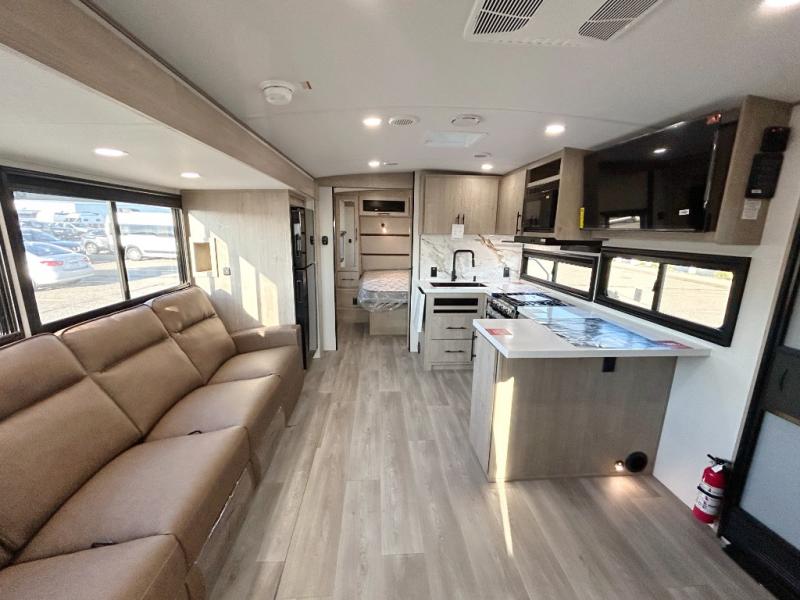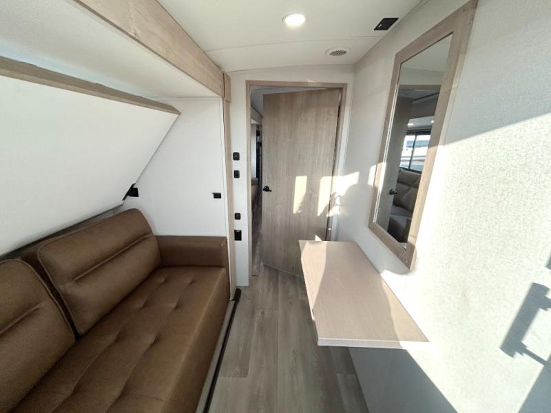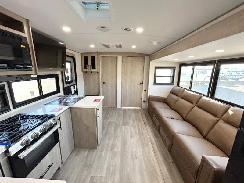 At the front of this 2810BH travel trailer, you’ll find a spacious full bedroom featuring a 60" x 80" queen bed, perfect for resting in comfort after a long day, along with dual wardrobes on each side to store your clothes and essentials. For added convenience, one of the two entry doors is located directly in the bedroom. Moving toward the center, the living area and kitchen create a welcoming space to relax and dine. The slide-out houses a quad theater seat, offering plenty of room to lounge, as well as a 10-cu. ft. refrigerator to keep your groceries fresh. Across from it, the U-shaped kitchen comes fully equipped with everything you need to cook comfortably, including a stainless-steel sink, three-burner range with oven, microwave, and solid surface countertops for meal prep. A bar top with stools provides a cozy dining spot, while a pull-out pantry keeps snacks organized. At the rear, the corner bathroom includes a 30" x 36" residential walk-in shower with skylight and a mirrored medicine cabinet, so you can skip the campsite facilities. Adjacent to it, the bunkhouse accommodates guests with a 36" flip-top bunk, tri-fold sofa, and even a flip-up desk, perfect for studying or remote work while on the road.