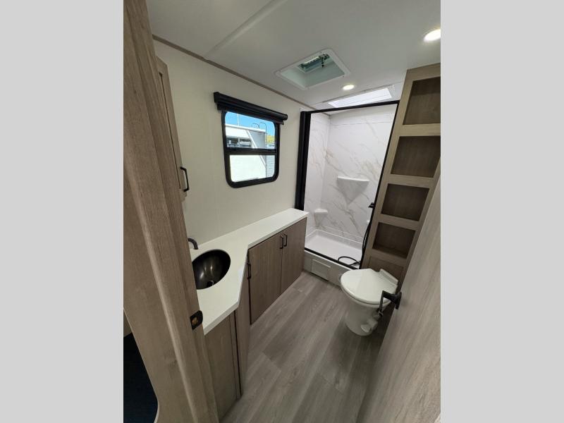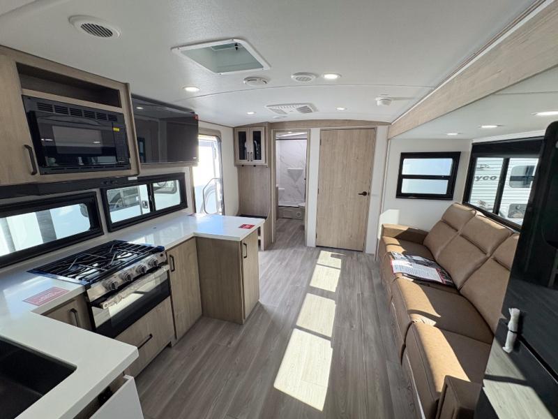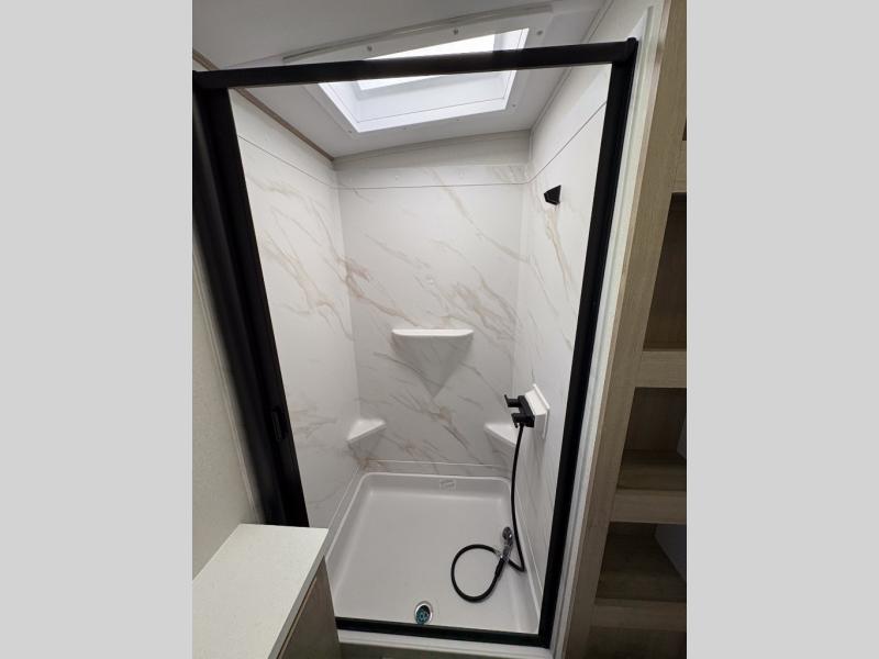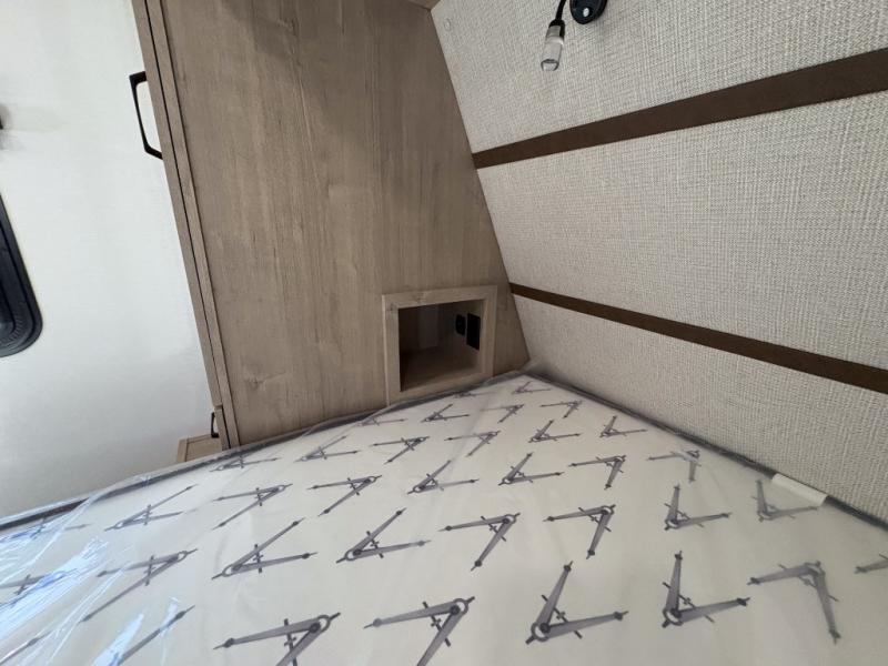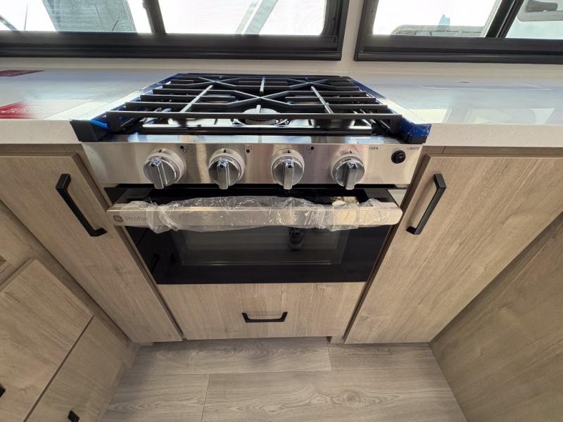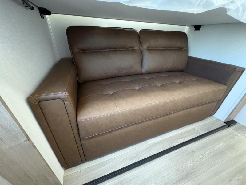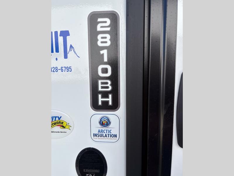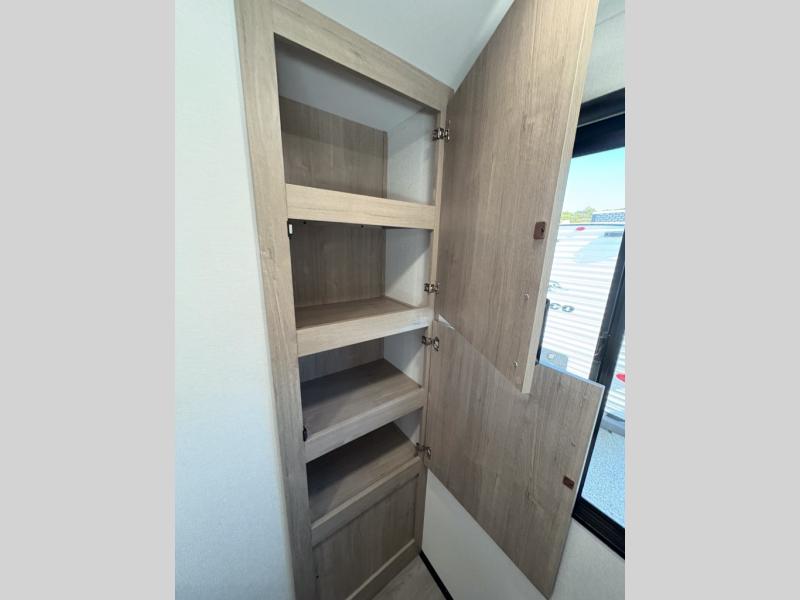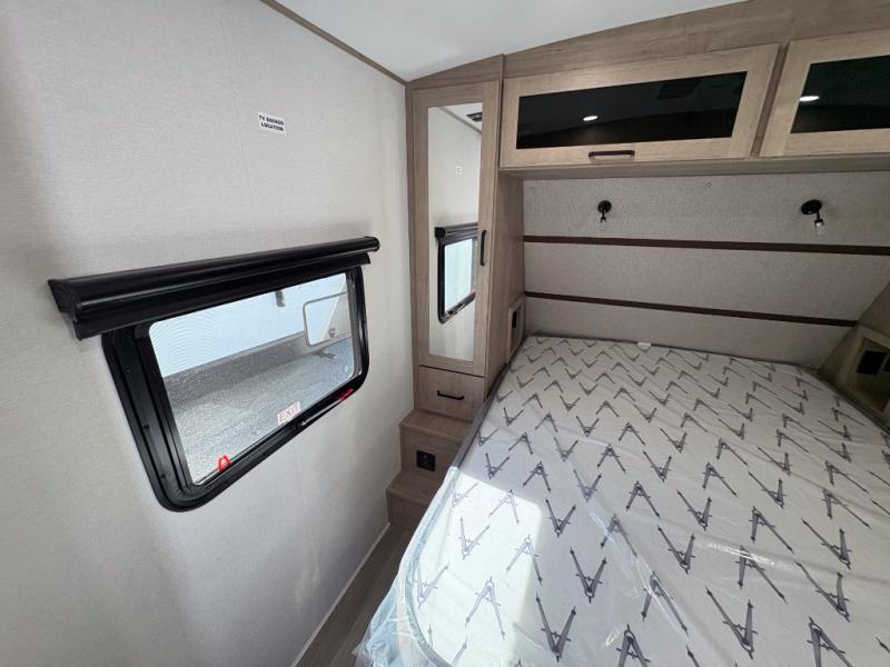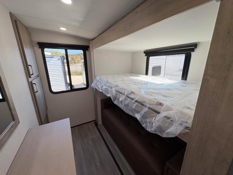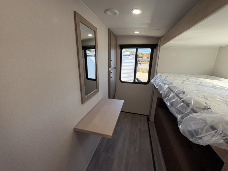 At the front of this 2810BH travel trailer, you’ll find a spacious full bedroom featuring a 60" x 80" queen bed, perfect for resting in comfort after a long day, along with dual wardrobes on each side to store your clothes and essentials. For added convenience, one of the two entry doors is located directly in the bedroom. Moving toward the center, the living area and kitchen create a welcoming space to relax and dine. The slide-out houses a quad theater seat, offering plenty of room to lounge, as well as a 10-cu. ft. refrigerator to keep your groceries fresh. Across from it, the U-shaped kitchen comes fully equipped with everything you need to cook comfortably, including a stainless-steel sink, three-burner range with oven, microwave, and solid surface countertops for meal prep. A bar top with stools provides a cozy dining spot, while a pull-out pantry keeps snacks organized. At the rear, the corner bathroom includes a 30" x 36" residential walk-in shower with skylight and a mirrored medicine cabinet, so you can skip the campsite facilities. Adjacent to it, the bunkhouse accommodates guests with a 36" flip-top bunk, tri-fold sofa, and even a flip-up desk, perfect for studying or remote work while on the road.