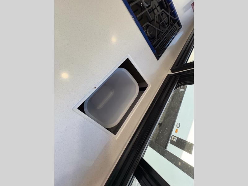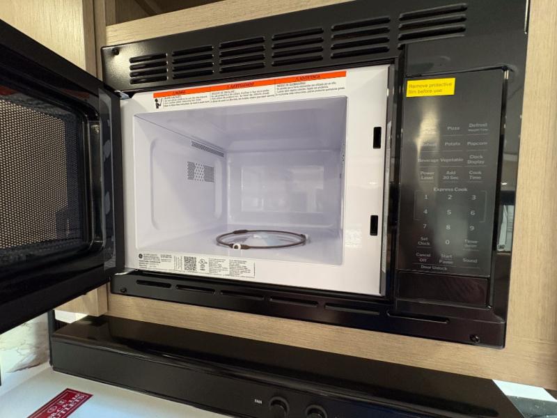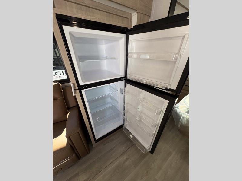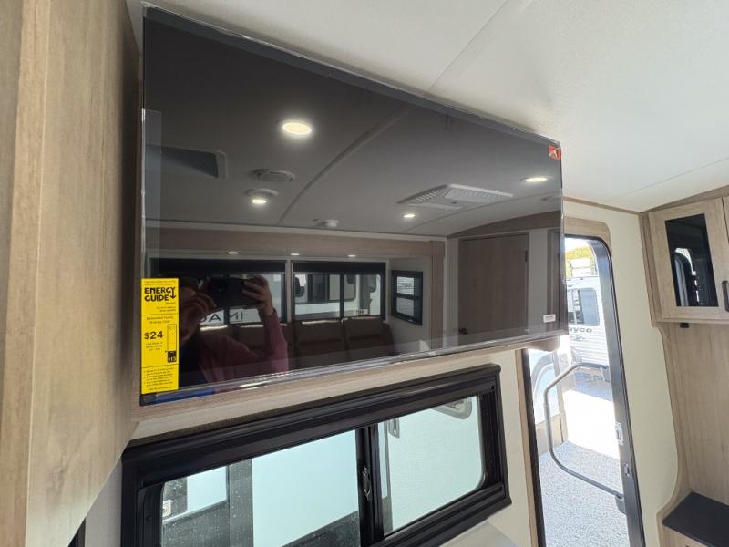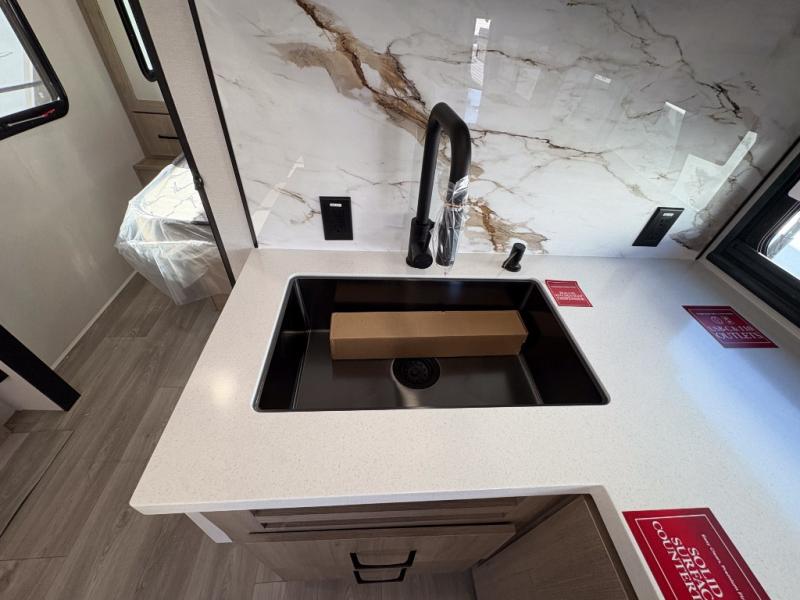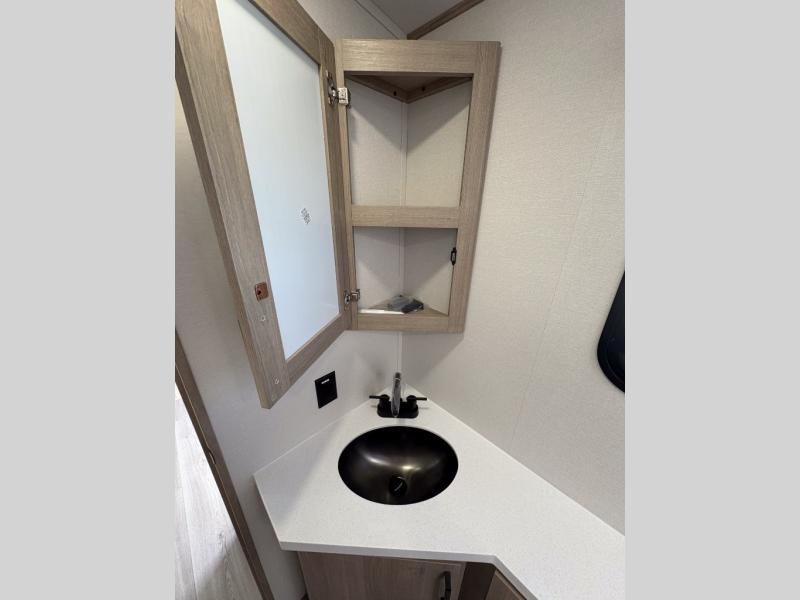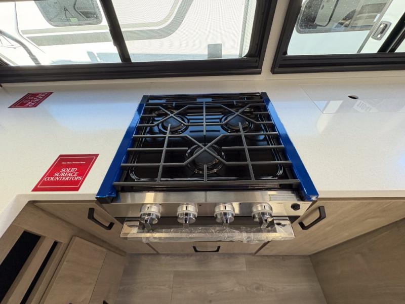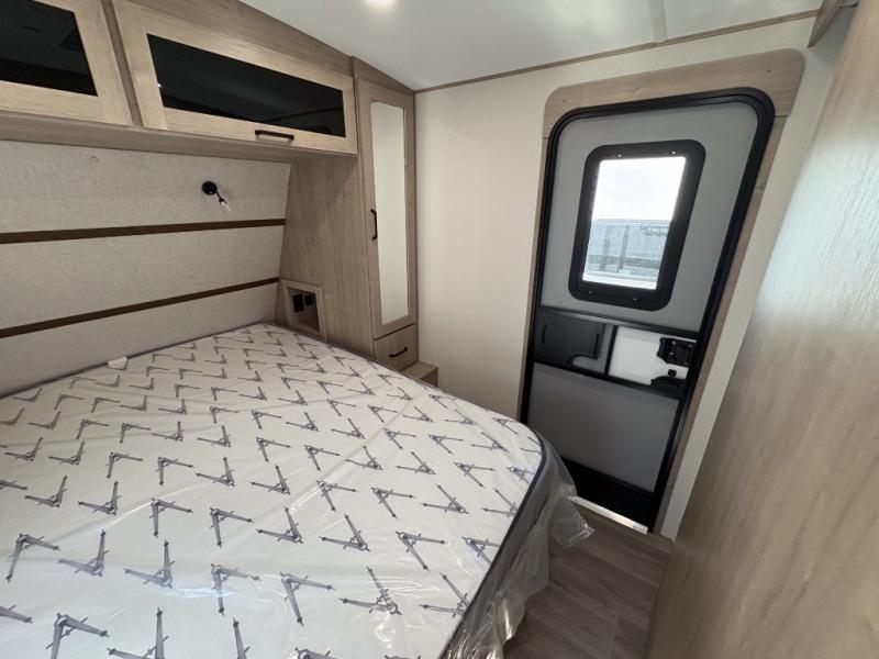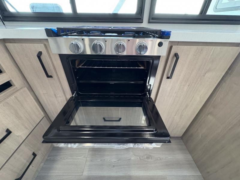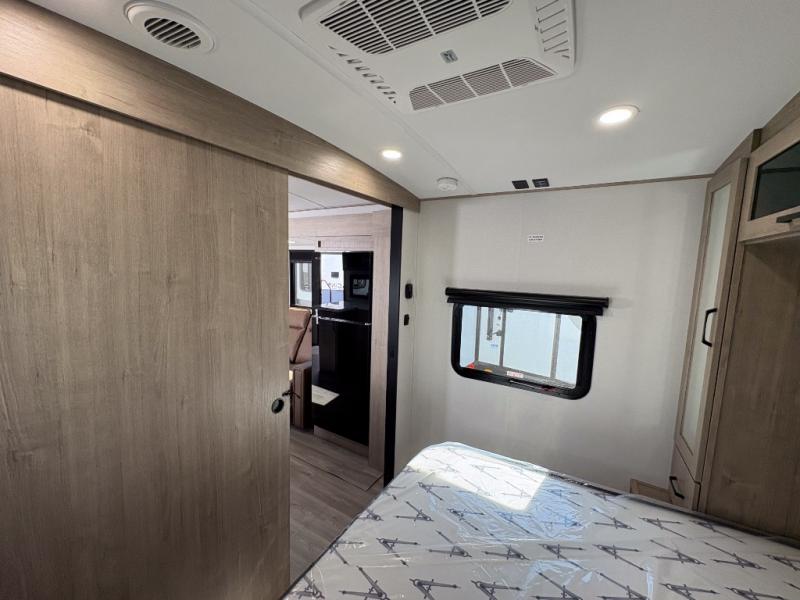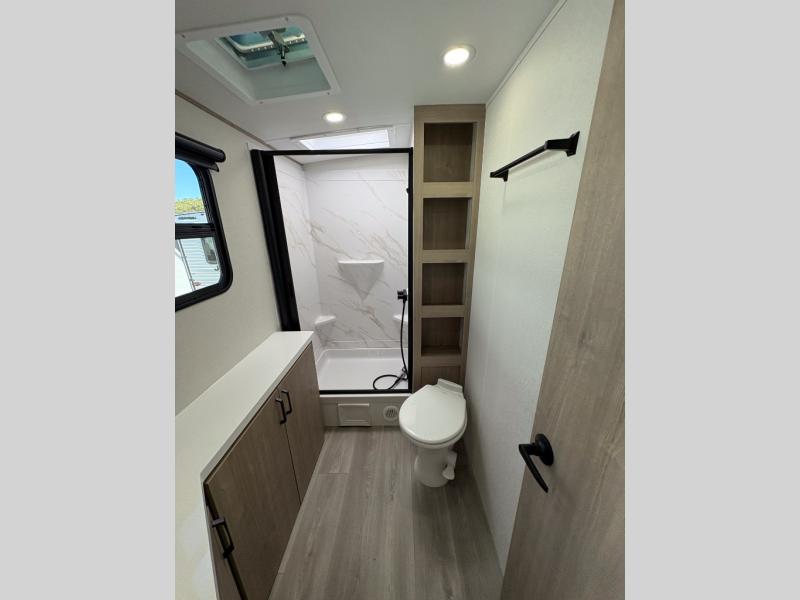 At the front of this 2810BH travel trailer, you’ll find a spacious full bedroom featuring a 60" x 80" queen bed, perfect for resting in comfort after a long day, along with dual wardrobes on each side to store your clothes and essentials. For added convenience, one of the two entry doors is located directly in the bedroom. Moving toward the center, the living area and kitchen create a welcoming space to relax and dine. The slide-out houses a quad theater seat, offering plenty of room to lounge, as well as a 10-cu. ft. refrigerator to keep your groceries fresh. Across from it, the U-shaped kitchen comes fully equipped with everything you need to cook comfortably, including a stainless-steel sink, three-burner range with oven, microwave, and solid surface countertops for meal prep. A bar top with stools provides a cozy dining spot, while a pull-out pantry keeps snacks organized. At the rear, the corner bathroom includes a 30" x 36" residential walk-in shower with skylight and a mirrored medicine cabinet, so you can skip the campsite facilities. Adjacent to it, the bunkhouse accommodates guests with a 36" flip-top bunk, tri-fold sofa, and even a flip-up desk, perfect for studying or remote work while on the road.