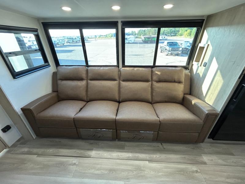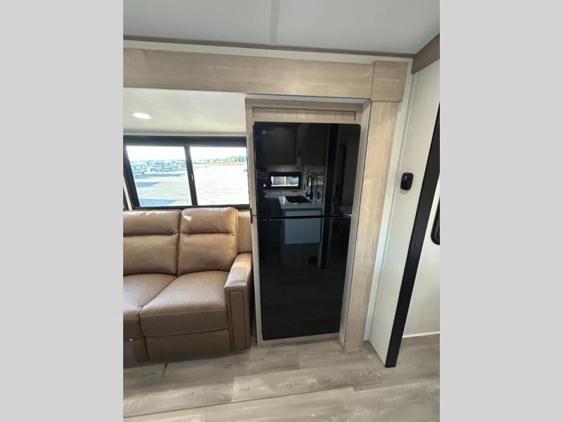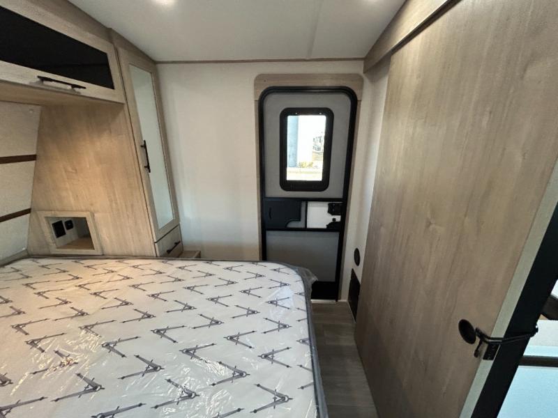 At the front of this 2810BH travel trailer, you’ll find a spacious full bedroom featuring a 60" x 80" queen bed, perfect for resting in comfort after a long day, along with dual wardrobes on each side to store your clothes and essentials. For added convenience, one of the two entry doors is located directly in the bedroom. Moving toward the center, the living area and kitchen create a welcoming space to relax and dine. The slide-out houses a quad theater seat, offering plenty of room to lounge, as well as a 10-cu. ft. refrigerator to keep your groceries fresh. Across from it, the U-shaped kitchen comes fully equipped with everything you need to cook comfortably, including a stainless-steel sink, three-burner range with oven, microwave, and solid surface countertops for meal prep. A bar top with stools provides a cozy dining spot, while a pull-out pantry keeps snacks organized. At the rear, the corner bathroom includes a 30" x 36" residential walk-in shower with skylight and a mirrored medicine cabinet, so you can skip the campsite facilities. Adjacent to it, the bunkhouse accommodates guests with a 36" flip-top bunk, tri-fold sofa, and even a flip-up desk, perfect for studying or remote work while on the road.