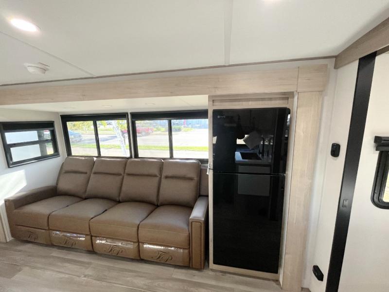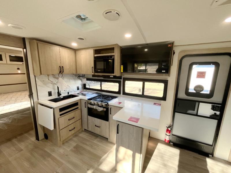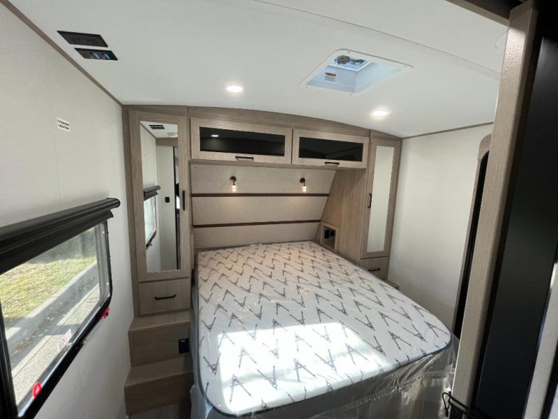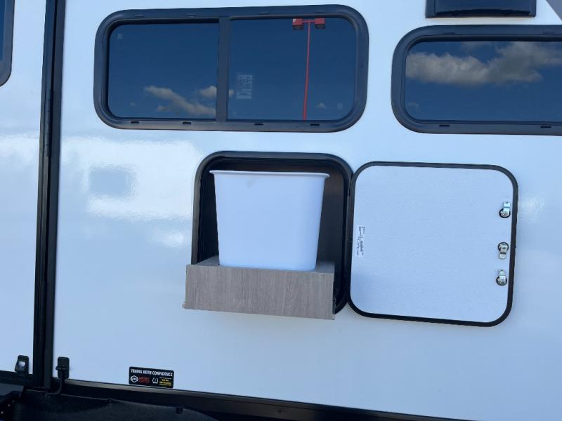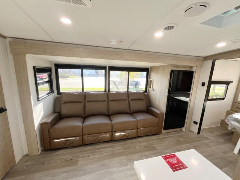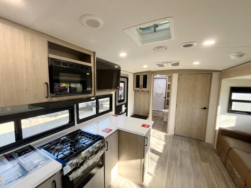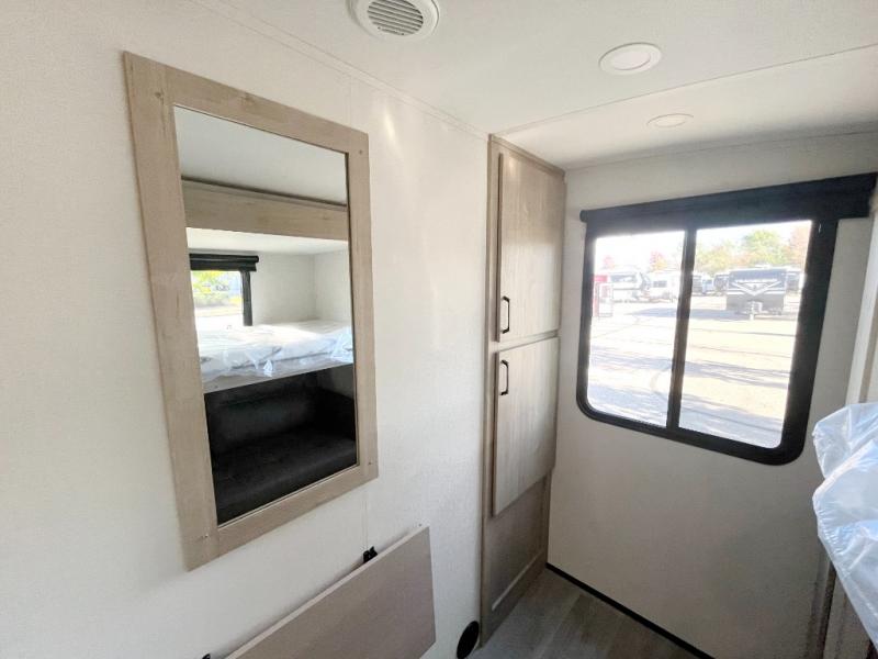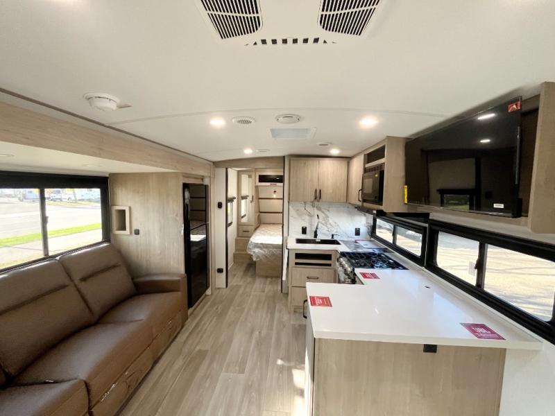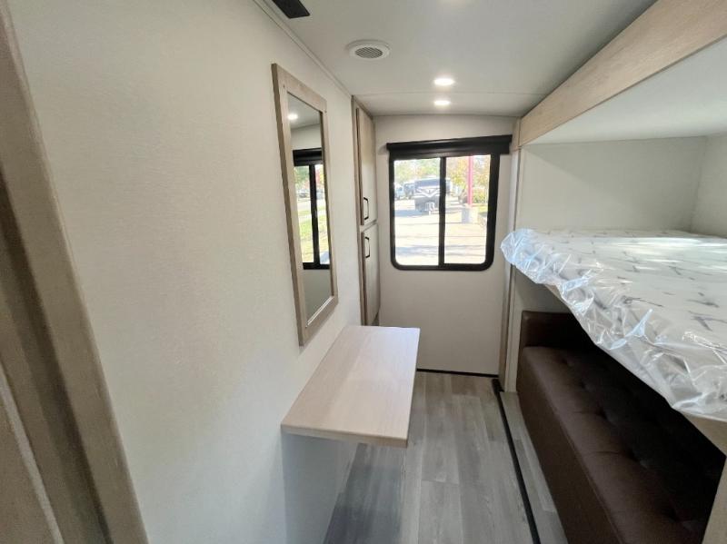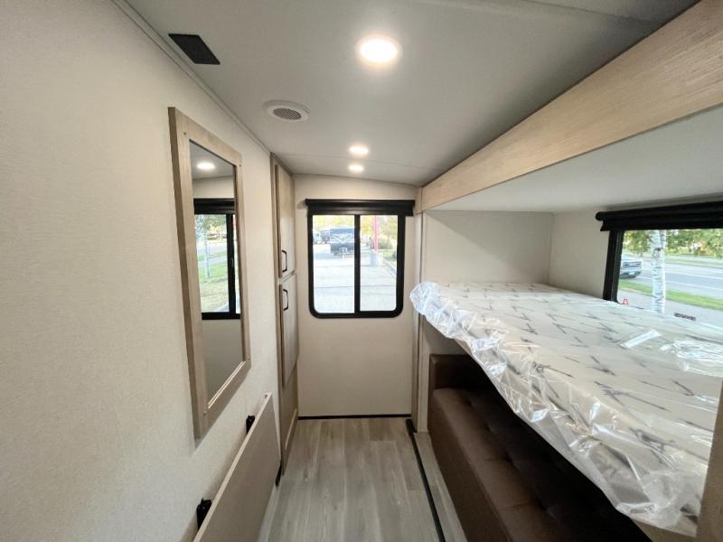 At the front of this 2810BH travel trailer, you’ll find a spacious full bedroom featuring a 60" x 80" queen bed, perfect for resting in comfort after a long day, along with dual wardrobes on each side to store your clothes and essentials. For added convenience, one of the two entry doors is located directly in the bedroom. Moving toward the center, the living area and kitchen create a welcoming space to relax and dine. The slide-out houses a quad theater seat, offering plenty of room to lounge, as well as a 10-cu. ft. refrigerator to keep your groceries fresh. Across from it, the U-shaped kitchen comes fully equipped with everything you need to cook comfortably, including a stainless-steel sink, three-burner range with oven, microwave, and solid surface countertops for meal prep. A bar top with stools provides a cozy dining spot, while a pull-out pantry keeps snacks organized. At the rear, the corner bathroom includes a 30" x 36" residential walk-in shower with skylight and a mirrored medicine cabinet, so you can skip the campsite facilities. Adjacent to it, the bunkhouse accommodates guests with a 36" flip-top bunk, tri-fold sofa, and even a flip-up desk, perfect for studying or remote work while on the road.