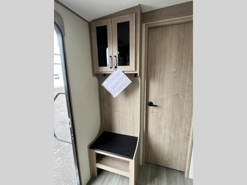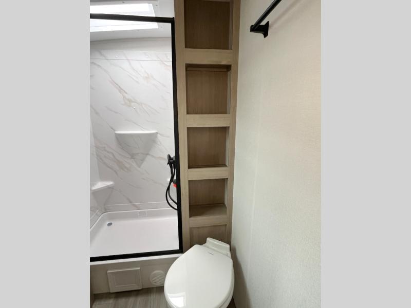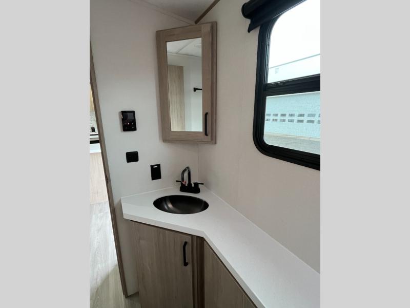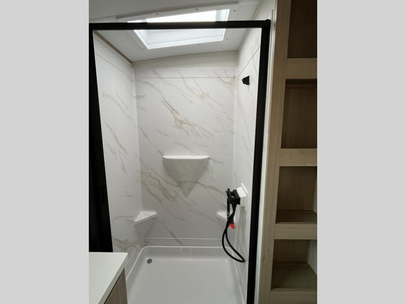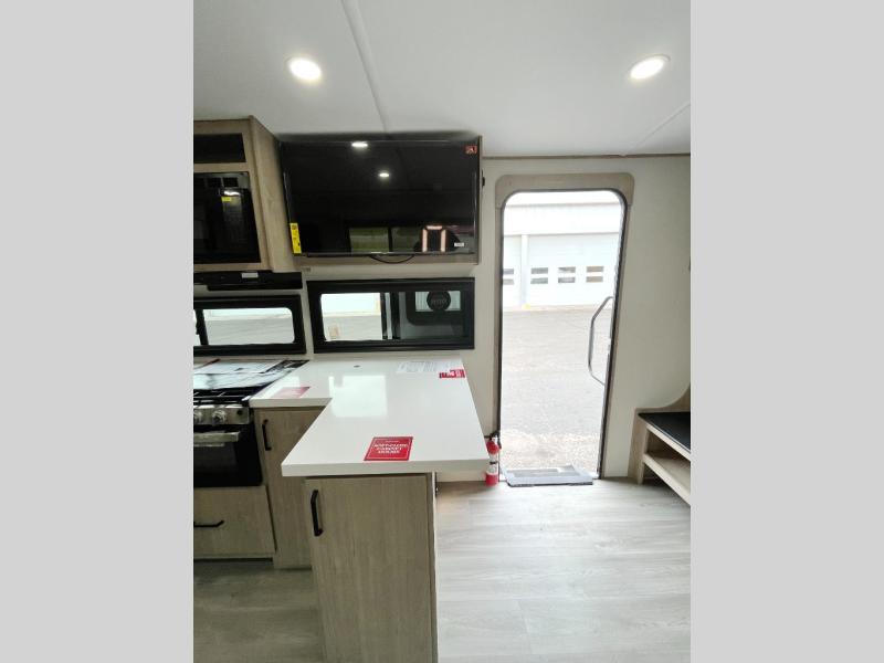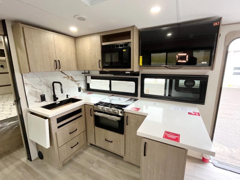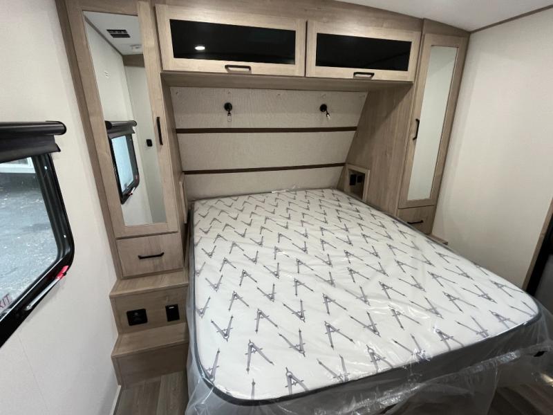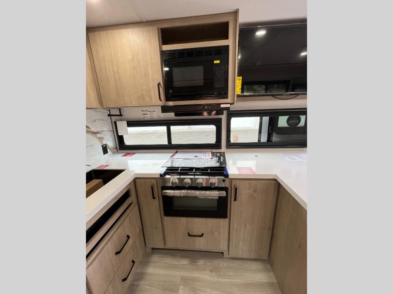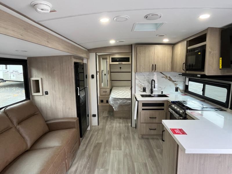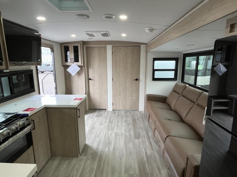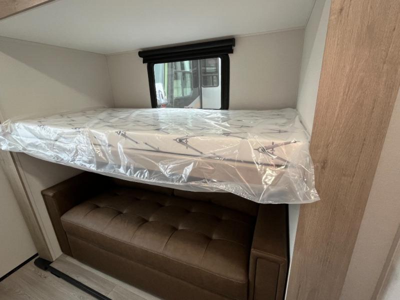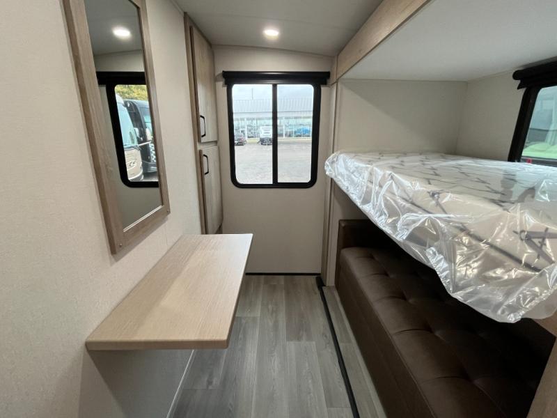 At the front of this 2810BH travel trailer, you’ll find a spacious full bedroom featuring a 60" x 80" queen bed, perfect for resting in comfort after a long day, along with dual wardrobes on each side to store your clothes and essentials. For added convenience, one of the two entry doors is located directly in the bedroom. Moving toward the center, the living area and kitchen create a welcoming space to relax and dine. The slide-out houses a quad theater seat, offering plenty of room to lounge, as well as a 10-cu. ft. refrigerator to keep your groceries fresh. Across from it, the U-shaped kitchen comes fully equipped with everything you need to cook comfortably, including a stainless-steel sink, three-burner range with oven, microwave, and solid surface countertops for meal prep. A bar top with stools provides a cozy dining spot, while a pull-out pantry keeps snacks organized. At the rear, the corner bathroom includes a 30" x 36" residential walk-in shower with skylight and a mirrored medicine cabinet, so you can skip the campsite facilities. Adjacent to it, the bunkhouse accommodates guests with a 36" flip-top bunk, tri-fold sofa, and even a flip-up desk, perfect for studying or remote work while on the road.