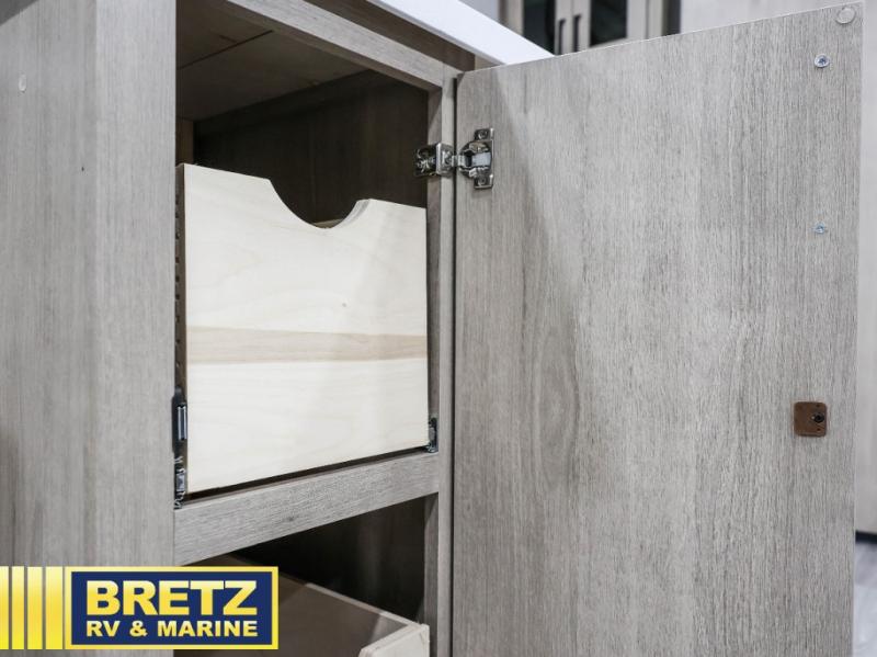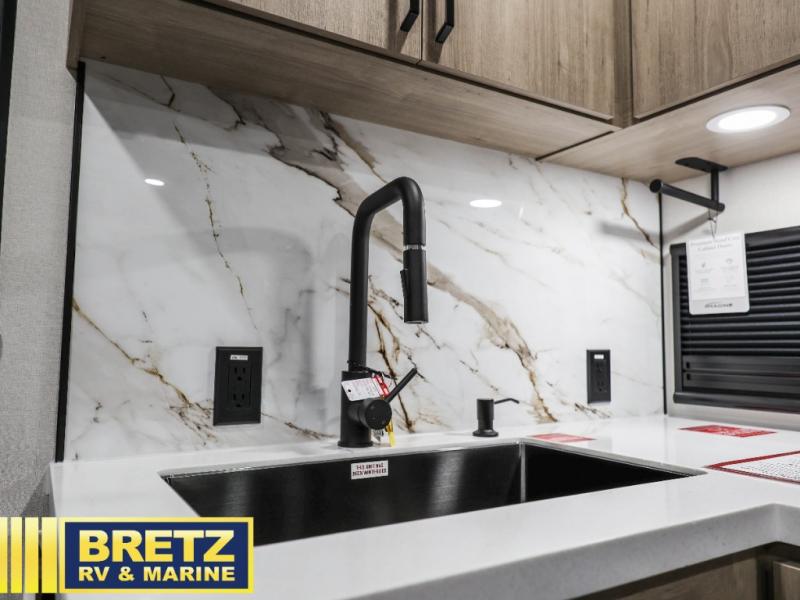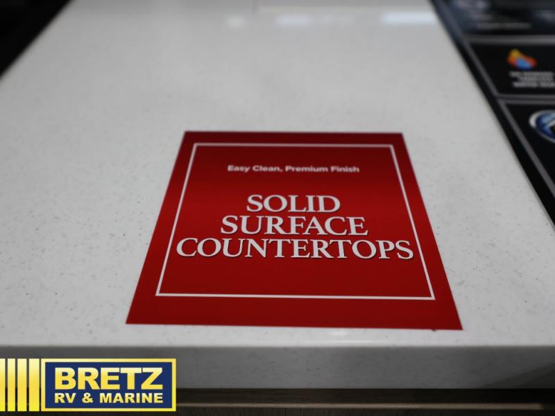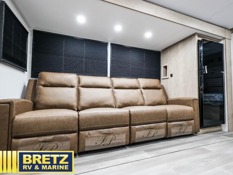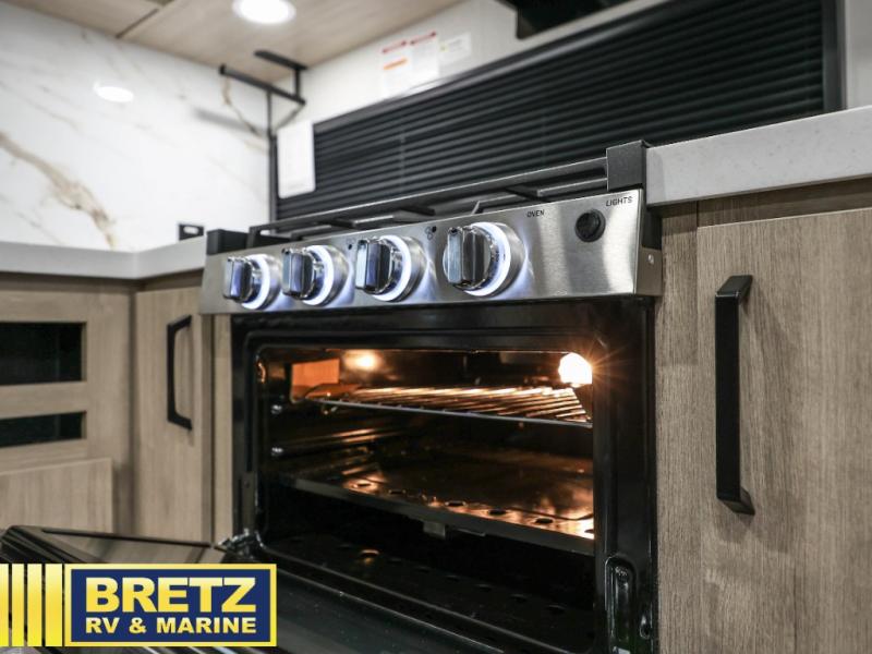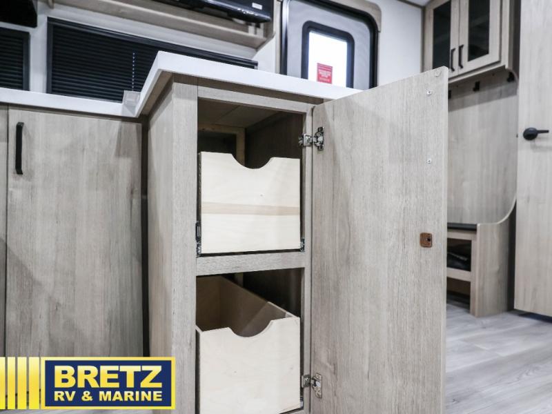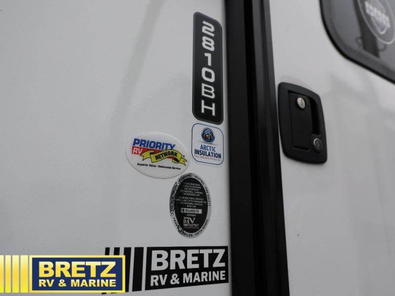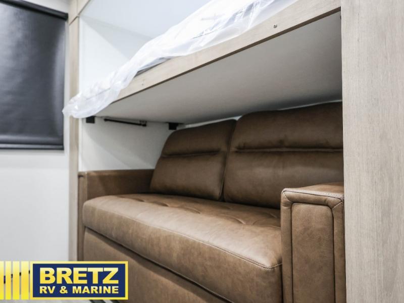 At the front of this 2810BH travel trailer, you’ll find a spacious full bedroom featuring a 60" x 80" queen bed, perfect for resting in comfort after a long day, along with dual wardrobes on each side to store your clothes and essentials. For added convenience, one of the two entry doors is located directly in the bedroom. Moving toward the center, the living area and kitchen create a welcoming space to relax and dine. The slide-out houses a quad theater seat, offering plenty of room to lounge, as well as a 10-cu. ft. refrigerator to keep your groceries fresh. Across from it, the U-shaped kitchen comes fully equipped with everything you need to cook comfortably, including a stainless-steel sink, three-burner range with oven, microwave, and solid surface countertops for meal prep. A bar top with stools provides a cozy dining spot, while a pull-out pantry keeps snacks organized. At the rear, the corner bathroom includes a 30" x 36" residential walk-in shower with skylight and a mirrored medicine cabinet, so you can skip the campsite facilities. Adjacent to it, the bunkhouse accommodates guests with a 36" flip-top bunk, tri-fold sofa, and even a flip-up desk, perfect for studying or remote work while on the road.
