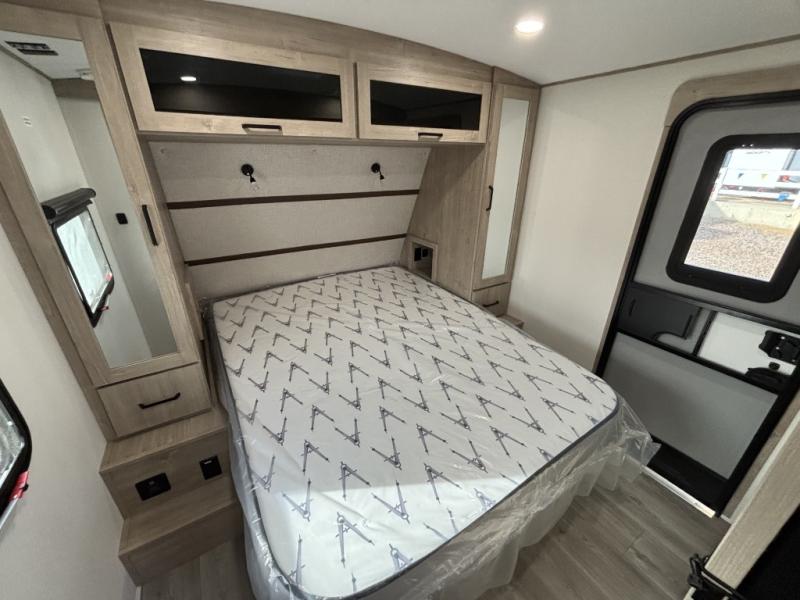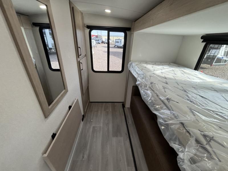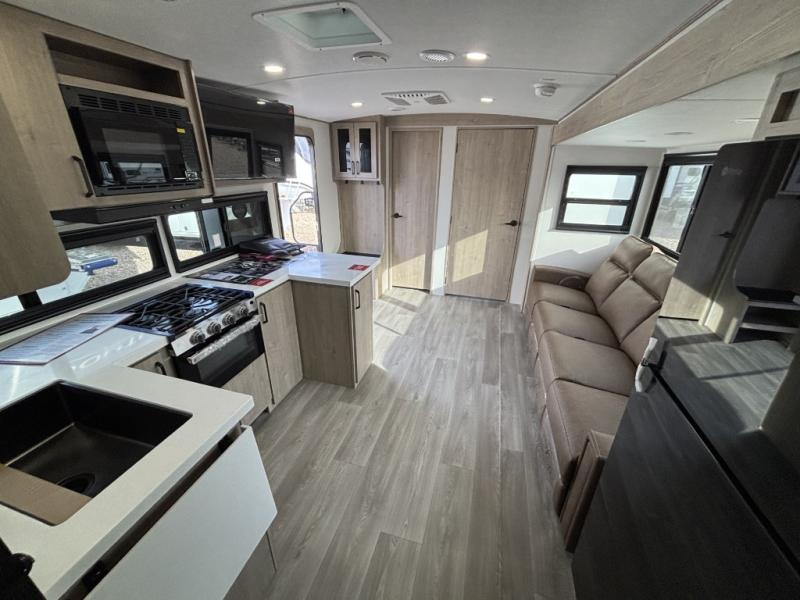 At the front of this 2810BH travel trailer, you’ll find a spacious full bedroom featuring a 60" x 80" queen bed, perfect for resting in comfort after a long day, along with dual wardrobes on each side to store your clothes and essentials. For added convenience, one of the two entry doors is located directly in the bedroom. Moving toward the center, the living area and kitchen create a welcoming space to relax and dine. The slide-out houses a quad theater seat, offering plenty of room to lounge, as well as a 10-cu. ft. refrigerator to keep your groceries fresh. Across from it, the U-shaped kitchen comes fully equipped with everything you need to cook comfortably, including a stainless-steel sink, three-burner range with oven, microwave, and solid surface countertops for meal prep. A bar top with stools provides a cozy dining spot, while a pull-out pantry keeps snacks organized. At the rear, the corner bathroom includes a 30" x 36" residential walk-in shower with skylight and a mirrored medicine cabinet, so you can skip the campsite facilities. Adjacent to it, the bunkhouse accommodates guests with a 36" flip-top bunk, tri-fold sofa, and even a flip-up desk, perfect for studying or remote work while on the road.