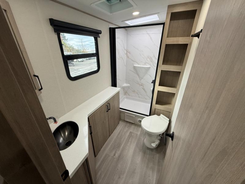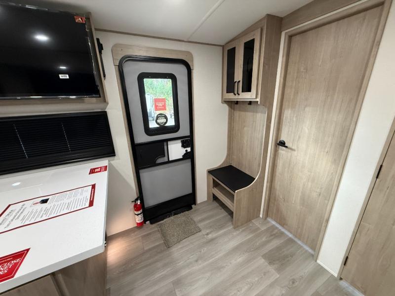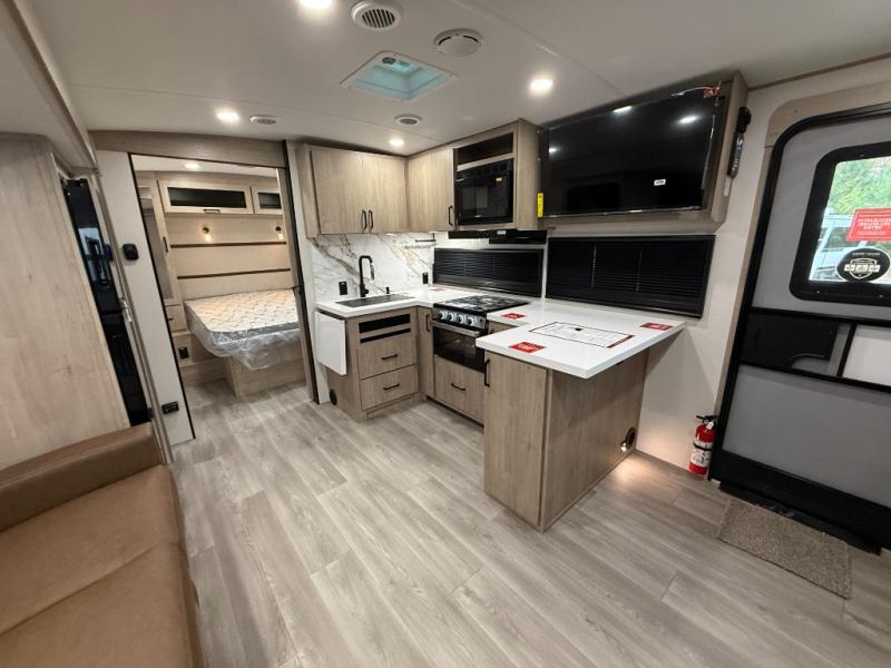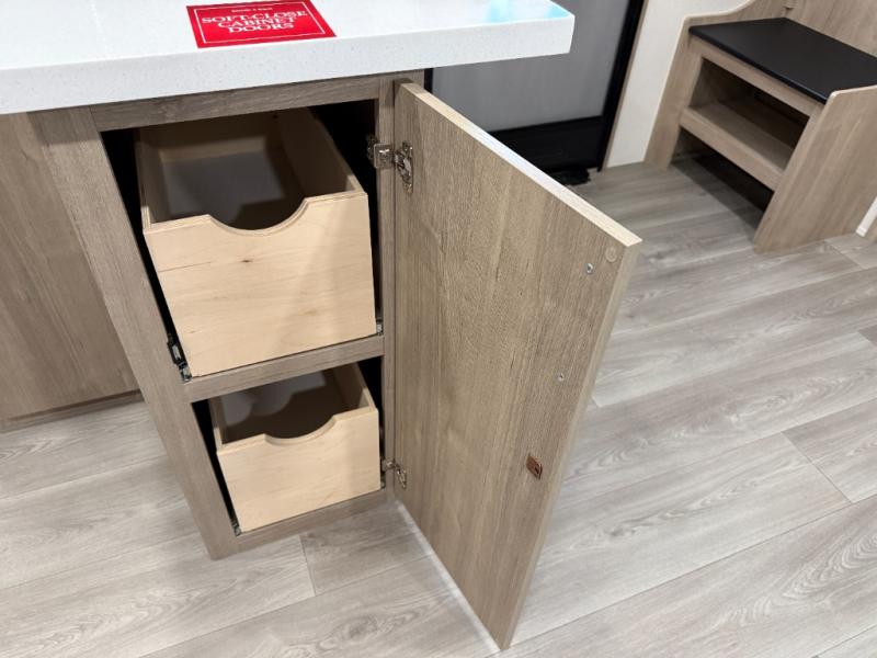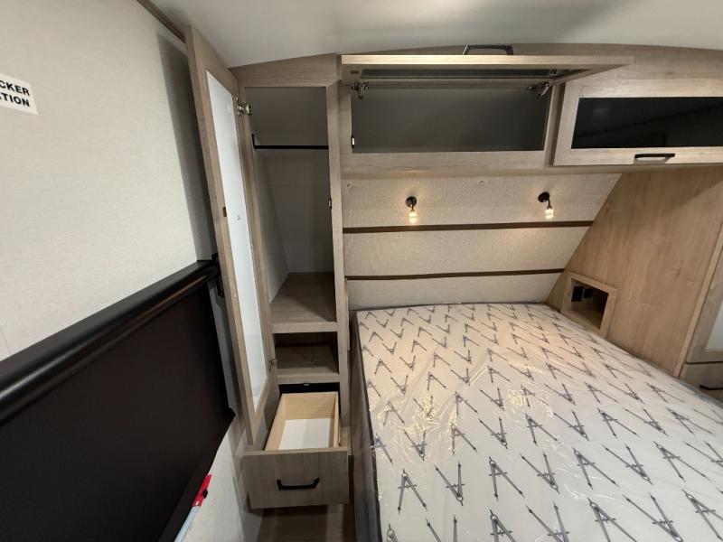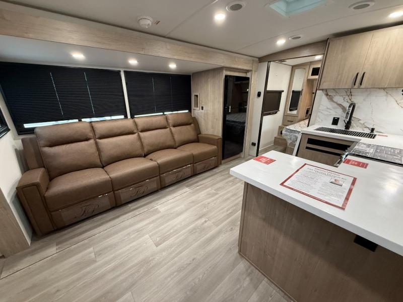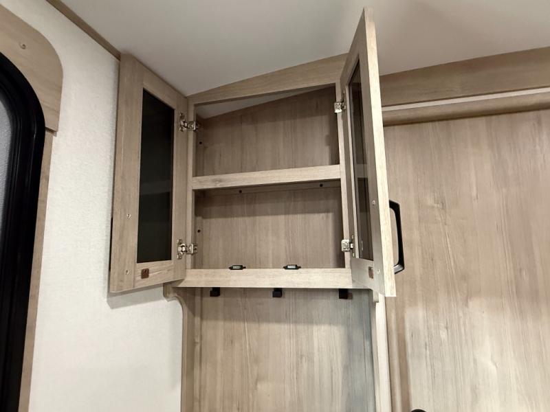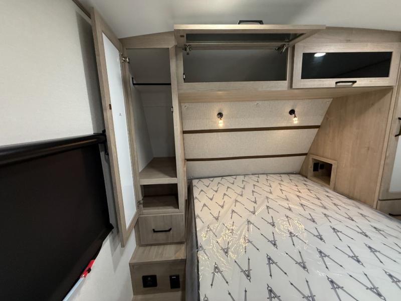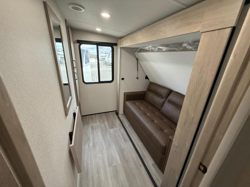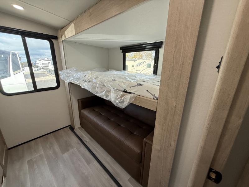 At the front of this 2810BH travel trailer, you’ll find a spacious full bedroom featuring a 60" x 80" queen bed, perfect for resting in comfort after a long day, along with dual wardrobes on each side to store your clothes and essentials. For added convenience, one of the two entry doors is located directly in the bedroom. Moving toward the center, the living area and kitchen create a welcoming space to relax and dine. The slide-out houses a quad theater seat, offering plenty of room to lounge, as well as a 10-cu. ft. refrigerator to keep your groceries fresh. Across from it, the U-shaped kitchen comes fully equipped with everything you need to cook comfortably, including a stainless-steel sink, three-burner range with oven, microwave, and solid surface countertops for meal prep. A bar top with stools provides a cozy dining spot, while a pull-out pantry keeps snacks organized. At the rear, the corner bathroom includes a 30" x 36" residential walk-in shower with skylight and a mirrored medicine cabinet, so you can skip the campsite facilities. Adjacent to it, the bunkhouse accommodates guests with a 36" flip-top bunk, tri-fold sofa, and even a flip-up desk, perfect for studying or remote work while on the road.
