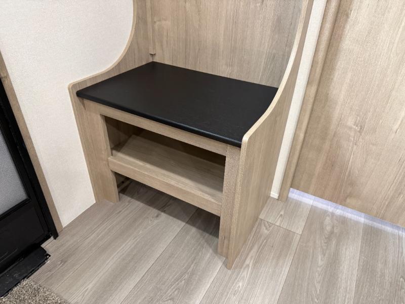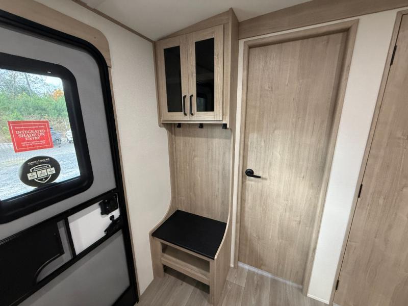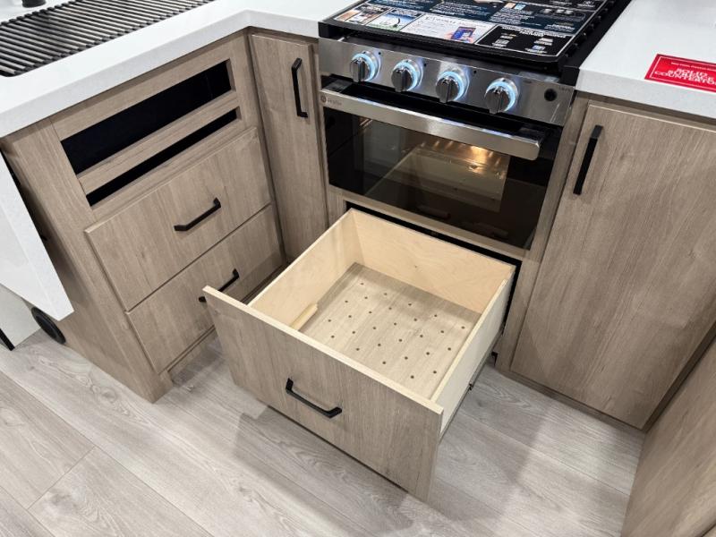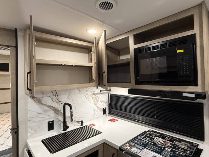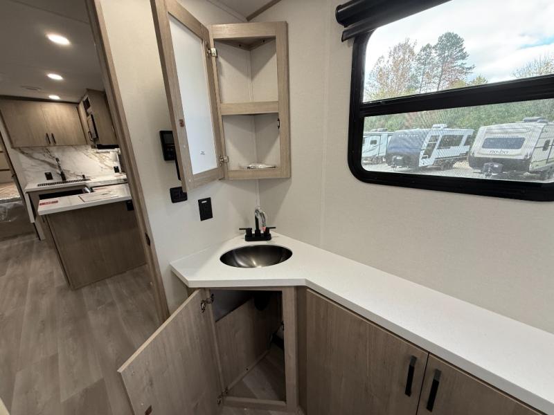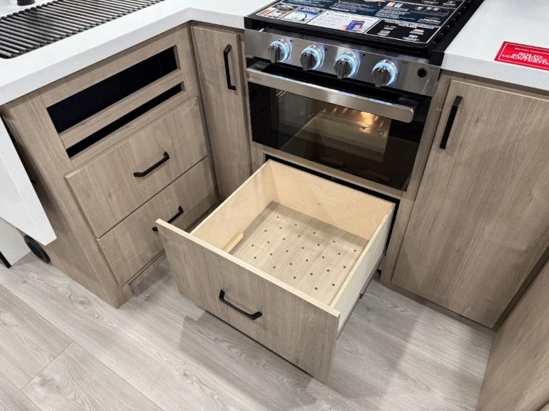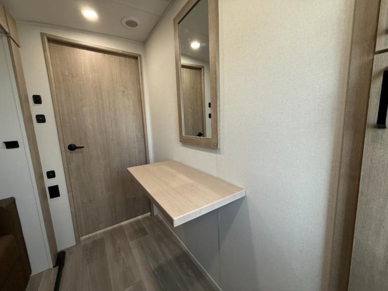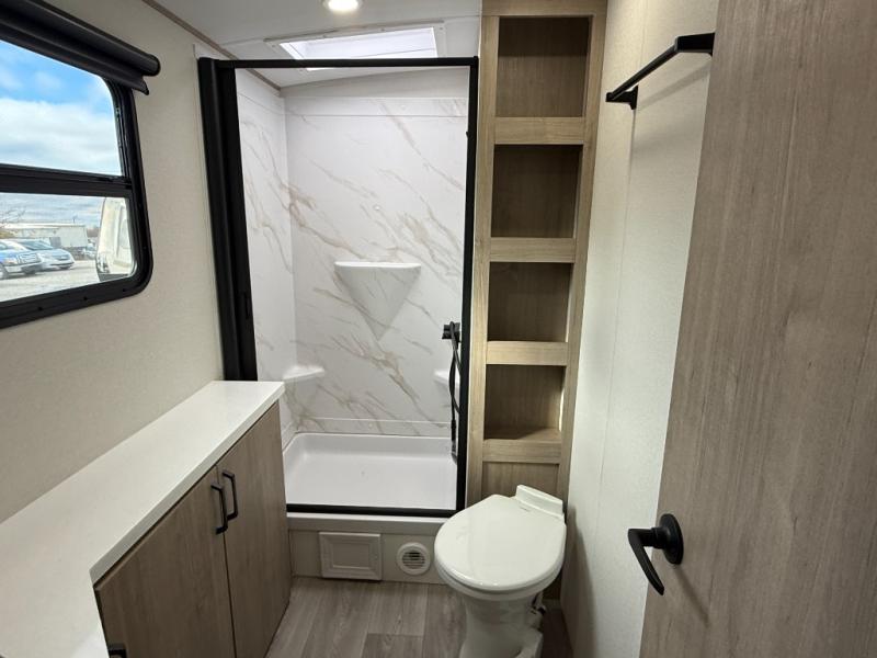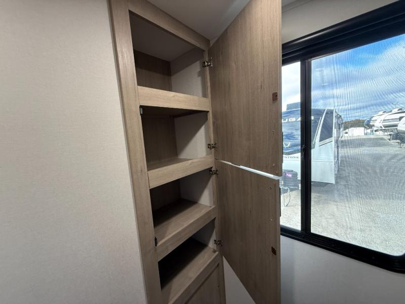 At the front of this 2810BH travel trailer, you’ll find a spacious full bedroom featuring a 60" x 80" queen bed, perfect for resting in comfort after a long day, along with dual wardrobes on each side to store your clothes and essentials. For added convenience, one of the two entry doors is located directly in the bedroom. Moving toward the center, the living area and kitchen create a welcoming space to relax and dine. The slide-out houses a quad theater seat, offering plenty of room to lounge, as well as a 10-cu. ft. refrigerator to keep your groceries fresh. Across from it, the U-shaped kitchen comes fully equipped with everything you need to cook comfortably, including a stainless-steel sink, three-burner range with oven, microwave, and solid surface countertops for meal prep. A bar top with stools provides a cozy dining spot, while a pull-out pantry keeps snacks organized. At the rear, the corner bathroom includes a 30" x 36" residential walk-in shower with skylight and a mirrored medicine cabinet, so you can skip the campsite facilities. Adjacent to it, the bunkhouse accommodates guests with a 36" flip-top bunk, tri-fold sofa, and even a flip-up desk, perfect for studying or remote work while on the road.
