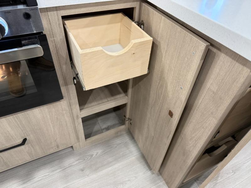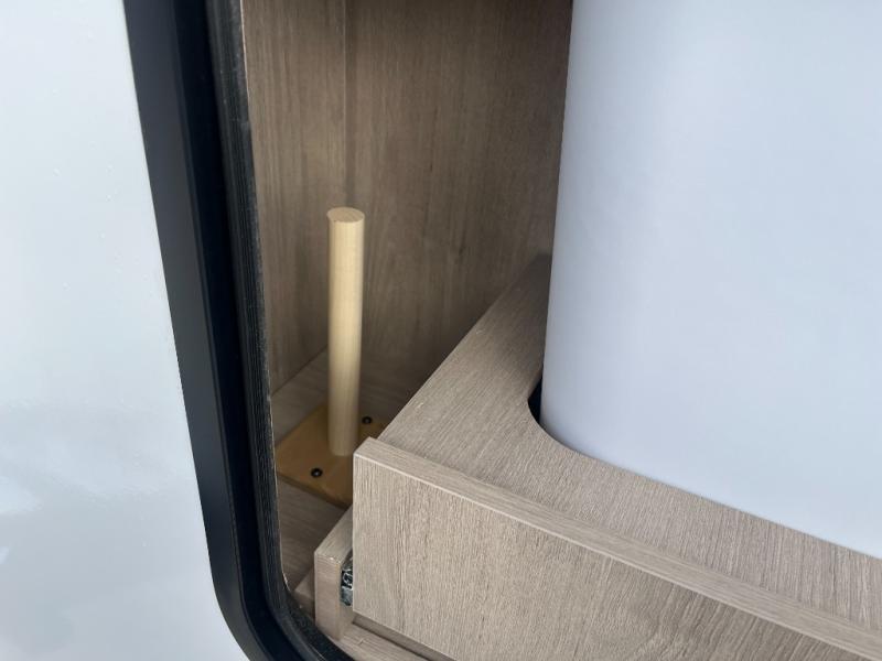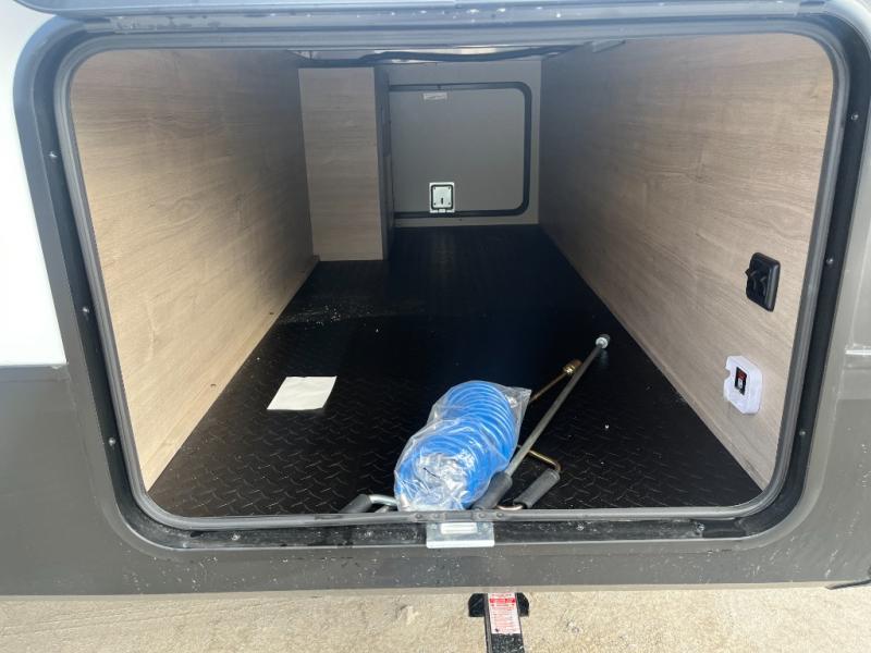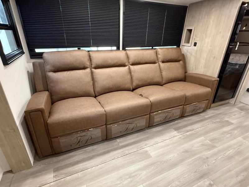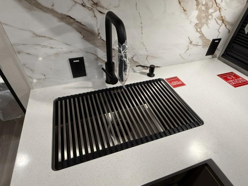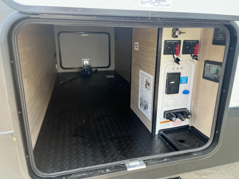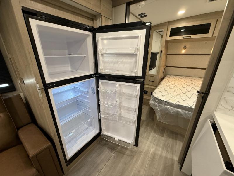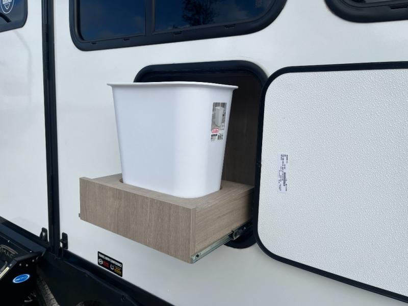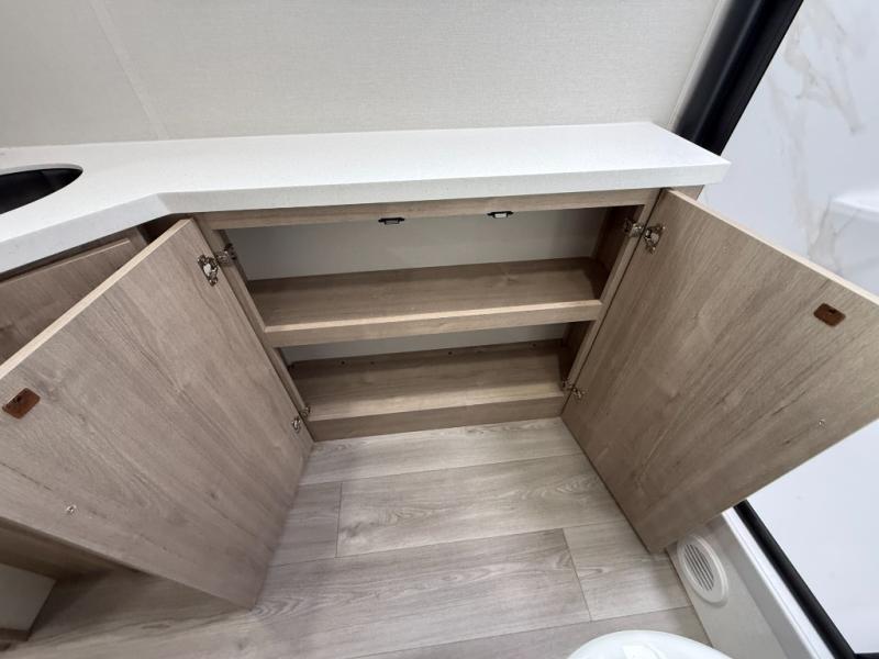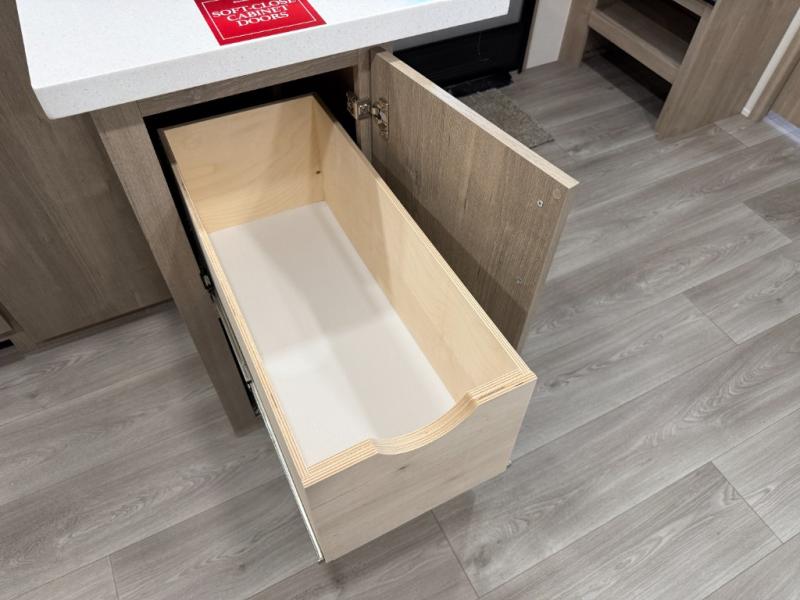 At the front of this 2810BH travel trailer, you’ll find a spacious full bedroom featuring a 60" x 80" queen bed, perfect for resting in comfort after a long day, along with dual wardrobes on each side to store your clothes and essentials. For added convenience, one of the two entry doors is located directly in the bedroom. Moving toward the center, the living area and kitchen create a welcoming space to relax and dine. The slide-out houses a quad theater seat, offering plenty of room to lounge, as well as a 10-cu. ft. refrigerator to keep your groceries fresh. Across from it, the U-shaped kitchen comes fully equipped with everything you need to cook comfortably, including a stainless-steel sink, three-burner range with oven, microwave, and solid surface countertops for meal prep. A bar top with stools provides a cozy dining spot, while a pull-out pantry keeps snacks organized. At the rear, the corner bathroom includes a 30" x 36" residential walk-in shower with skylight and a mirrored medicine cabinet, so you can skip the campsite facilities. Adjacent to it, the bunkhouse accommodates guests with a 36" flip-top bunk, tri-fold sofa, and even a flip-up desk, perfect for studying or remote work while on the road.