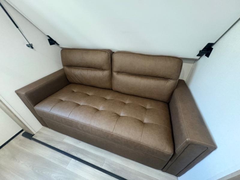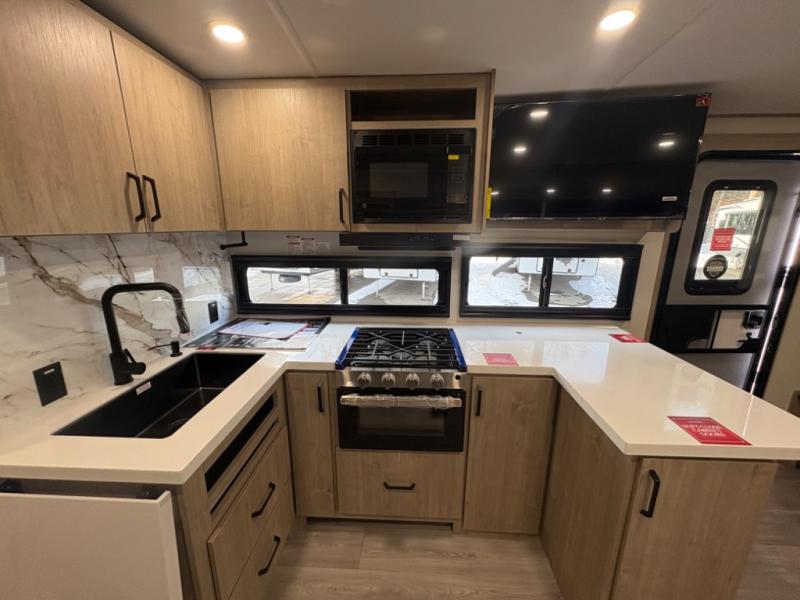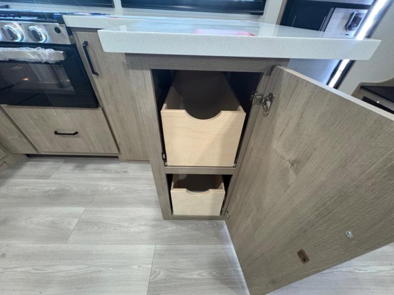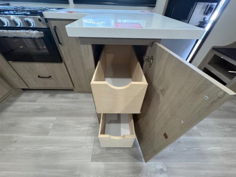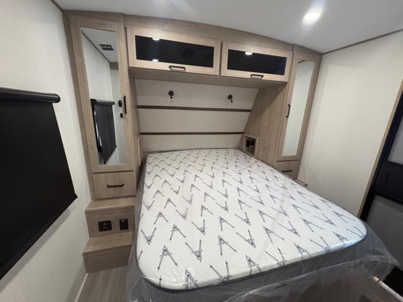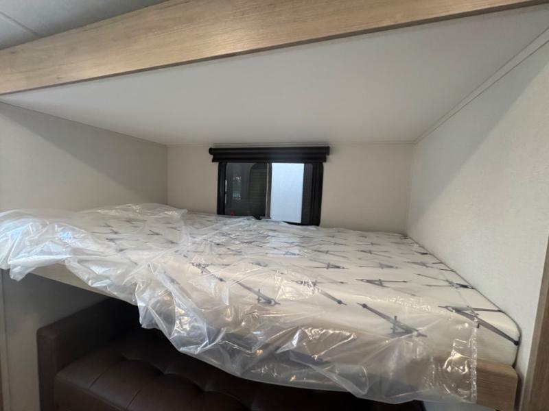At the front of this 2810BH travel trailer, you’ll find a spacious full bedroom featuring a 60" x 80" queen bed, perfect for resting in comfort after a long day, along with dual wardrobes on each side to store your clothes and essentials. For added convenience, one of the two entry doors is located directly in the bedroom. Moving toward the center, the living area and kitchen create a welcoming space to relax and dine. The slide-out houses a quad theater seat, offering plenty of room to lounge, as well as a 10-cu. ft. refrigerator to keep your groceries fresh. Across from it, the U-shaped kitchen comes fully equipped with everything you need to cook comfortably, including a stainless-steel sink, three-burner range with oven, microwave, and solid surface countertops for meal prep. A bar top with stools provides a cozy dining spot, while a pull-out pantry keeps snacks organized. At the rear, the corner bathroom includes a 30" x 36" residential walk-in shower with skylight and a mirrored medicine cabinet, so you can skip the campsite facilities. Adjacent to it, the bunkhouse accommodates guests with a 36" flip-top bunk, tri-fold sofa, and even a flip-up desk, perfect for studying or remote work while on the road.