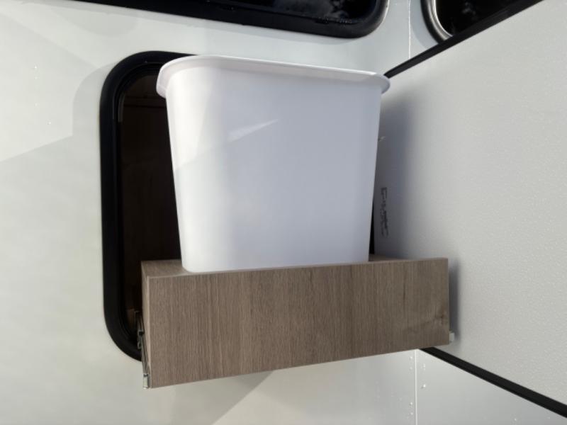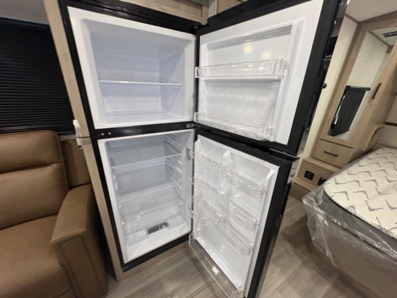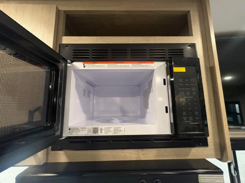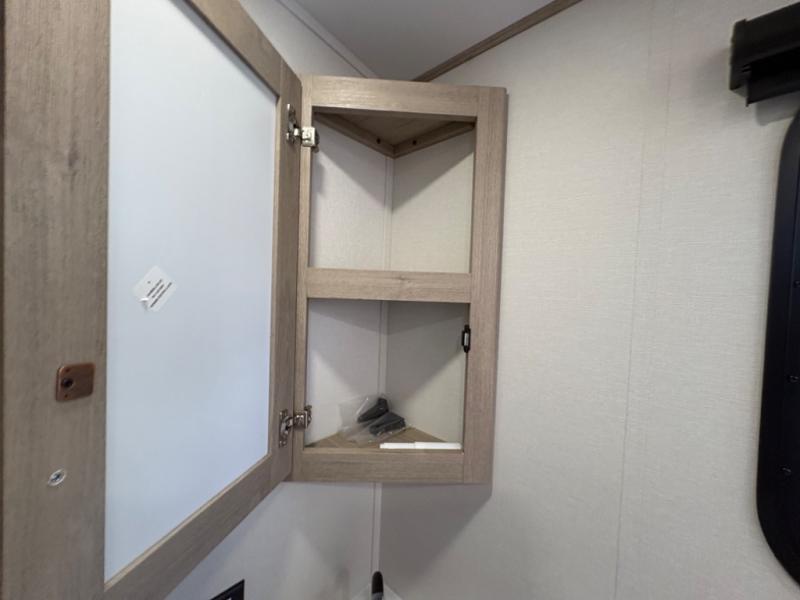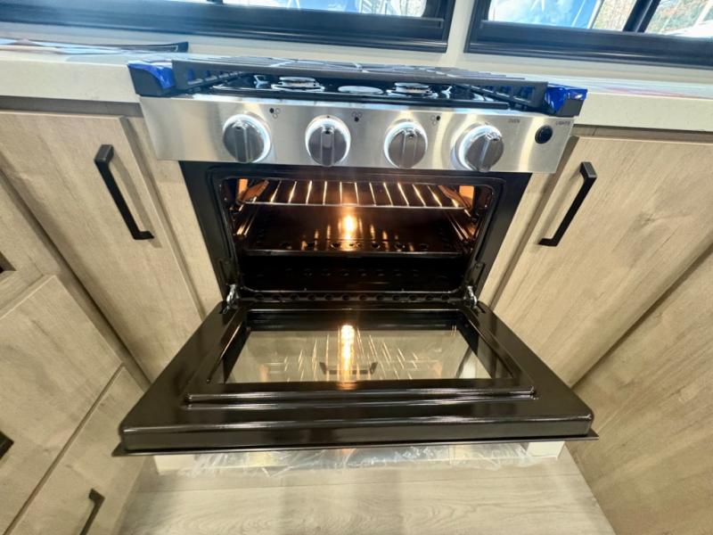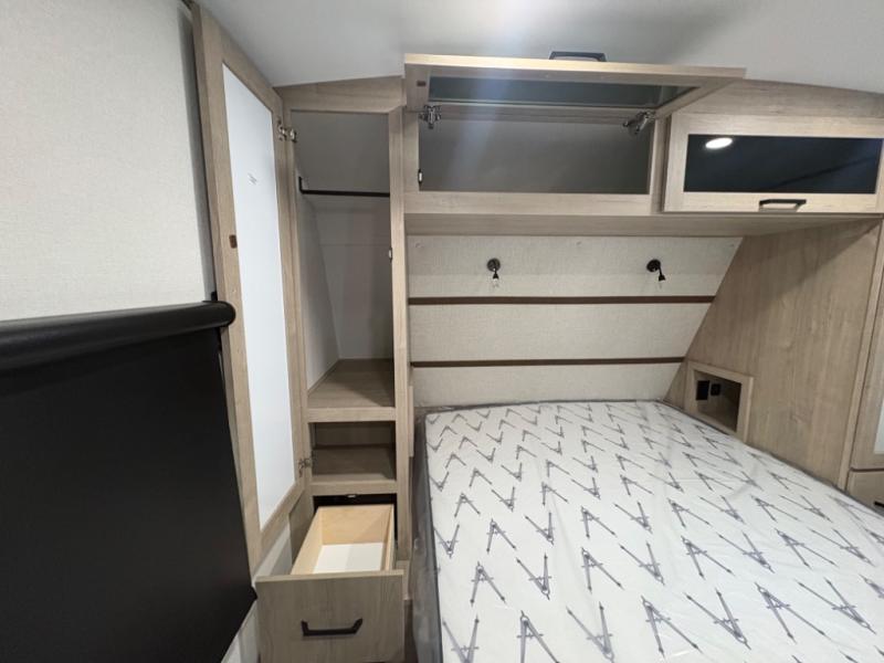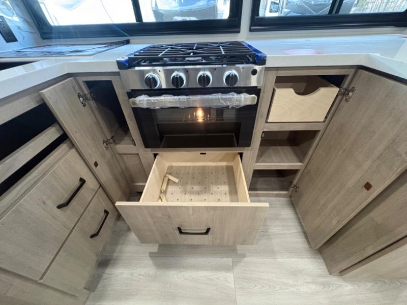At the front of this 2810BH travel trailer, you’ll find a spacious full bedroom featuring a 60" x 80" queen bed, perfect for resting in comfort after a long day, along with dual wardrobes on each side to store your clothes and essentials. For added convenience, one of the two entry doors is located directly in the bedroom. Moving toward the center, the living area and kitchen create a welcoming space to relax and dine. The slide-out houses a quad theater seat, offering plenty of room to lounge, as well as a 10-cu. ft. refrigerator to keep your groceries fresh. Across from it, the U-shaped kitchen comes fully equipped with everything you need to cook comfortably, including a stainless-steel sink, three-burner range with oven, microwave, and solid surface countertops for meal prep. A bar top with stools provides a cozy dining spot, while a pull-out pantry keeps snacks organized. At the rear, the corner bathroom includes a 30" x 36" residential walk-in shower with skylight and a mirrored medicine cabinet, so you can skip the campsite facilities. Adjacent to it, the bunkhouse accommodates guests with a 36" flip-top bunk, tri-fold sofa, and even a flip-up desk, perfect for studying or remote work while on the road.