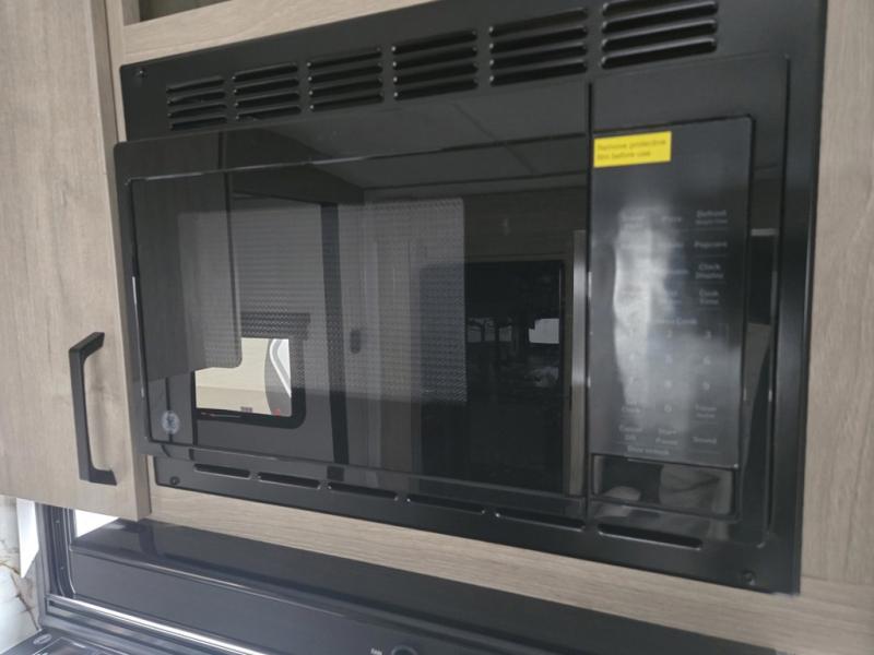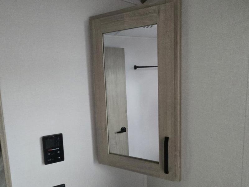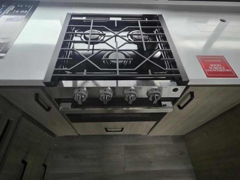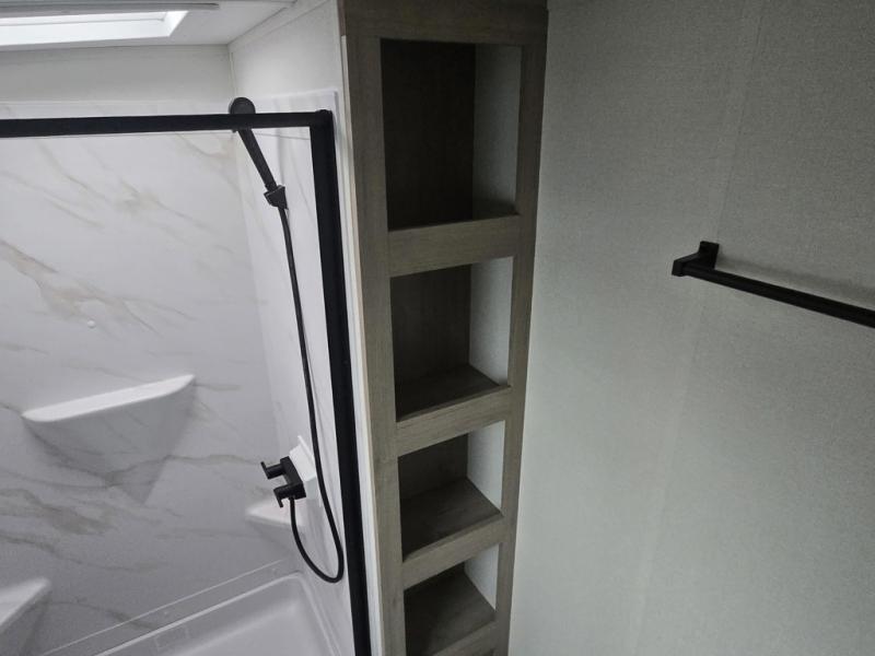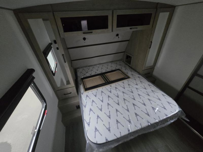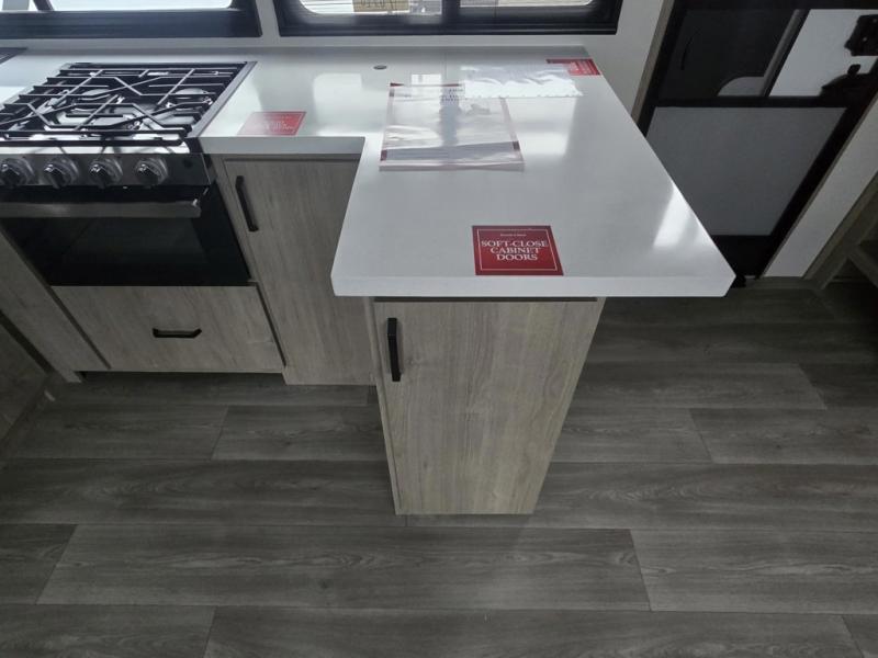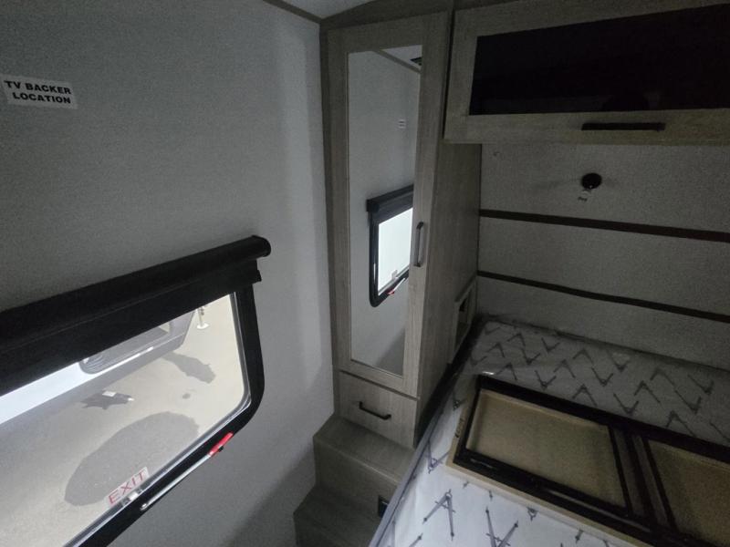 At the front of this 2810BH travel trailer, you’ll find a spacious full bedroom featuring a 60" x 80" queen bed, perfect for resting in comfort after a long day, along with dual wardrobes on each side to store your clothes and essentials. For added convenience, one of the two entry doors is located directly in the bedroom. Moving toward the center, the living area and kitchen create a welcoming space to relax and dine. The slide-out houses a quad theater seat, offering plenty of room to lounge, as well as a 10-cu. ft. refrigerator to keep your groceries fresh. Across from it, the U-shaped kitchen comes fully equipped with everything you need to cook comfortably, including a stainless-steel sink, three-burner range with oven, microwave, and solid surface countertops for meal prep. A bar top with stools provides a cozy dining spot, while a pull-out pantry keeps snacks organized. At the rear, the corner bathroom includes a 30" x 36" residential walk-in shower with skylight and a mirrored medicine cabinet, so you can skip the campsite facilities. Adjacent to it, the bunkhouse accommodates guests with a 36" flip-top bunk, tri-fold sofa, and even a flip-up desk, perfect for studying or remote work while on the road.
