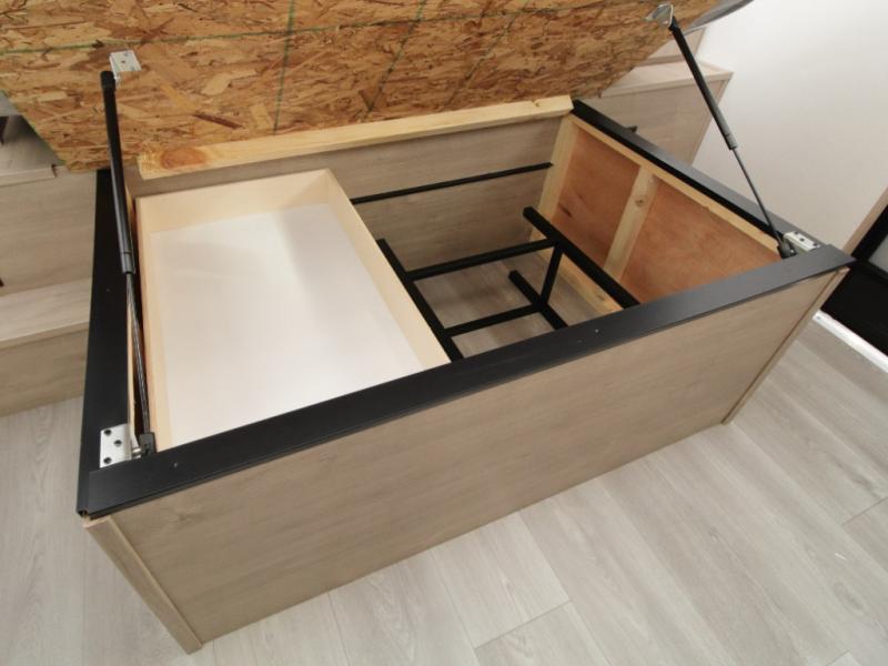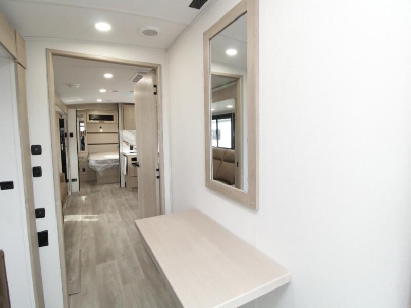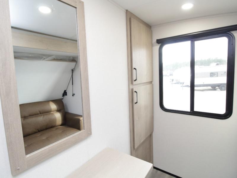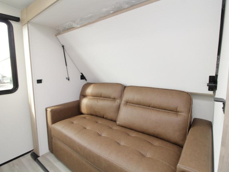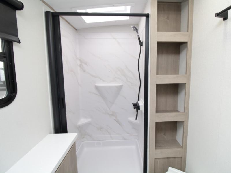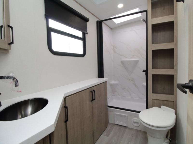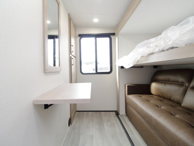 At the rear, the corner bathroom features a residential-style 30" x 36" walk-in shower with skylight and a mirrored medicine cabinet, allowing you to enjoy full bath convenience without relying on campground facilities. Next to the bath, the corner bunkhouse is ideal for kids or guests and includes a 36" flip-top bunk, tri-fold sofa, and a flip-up desk—perfect for homework, remote work, or creative space on the road.
