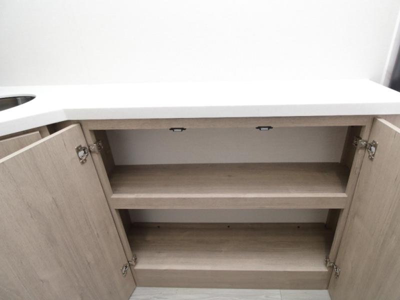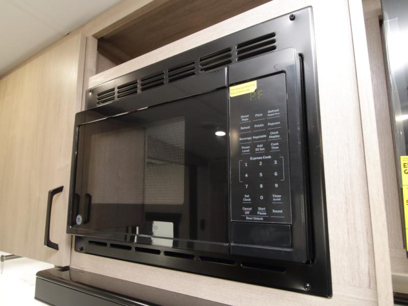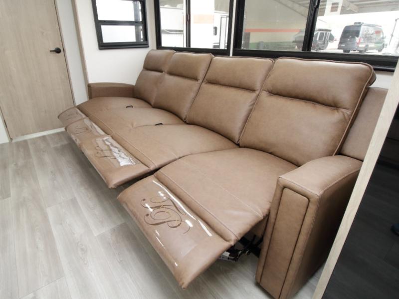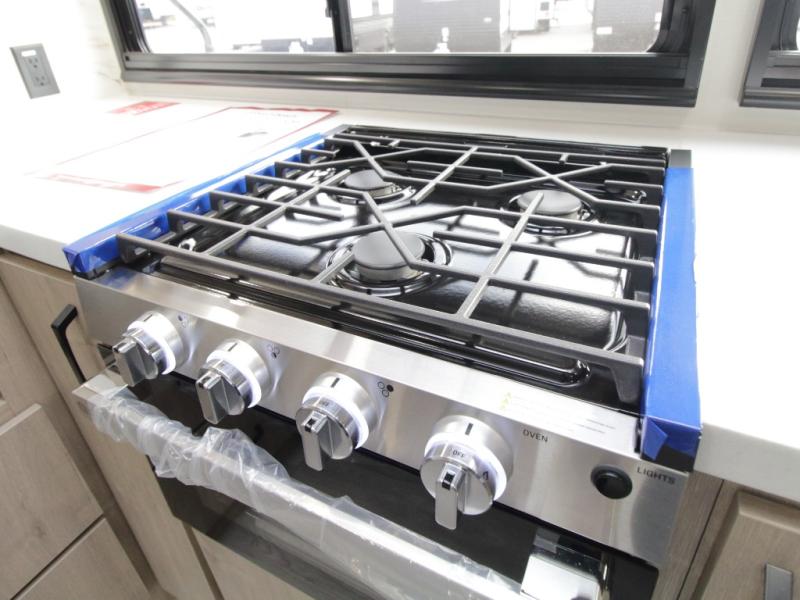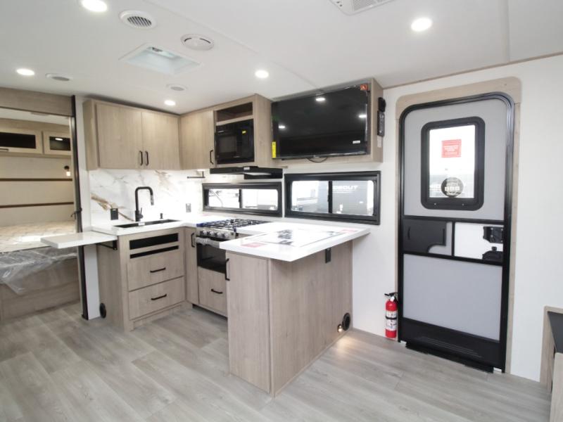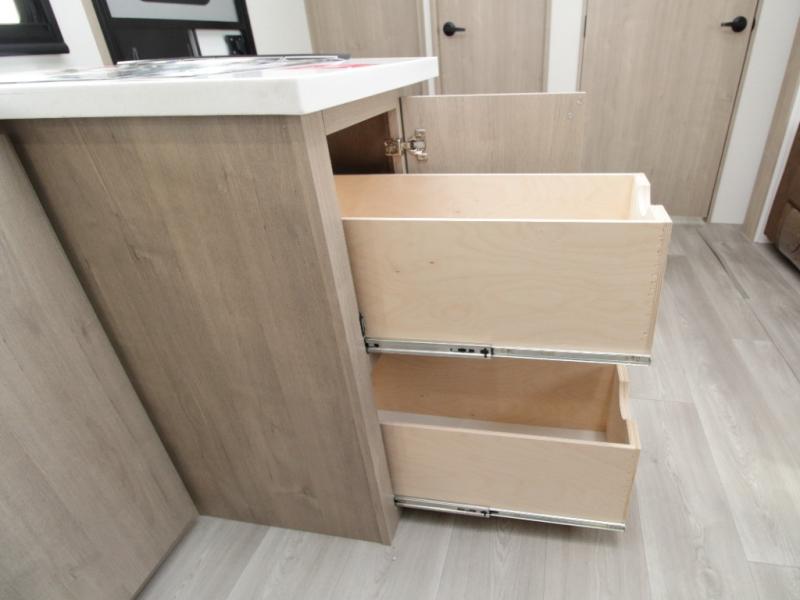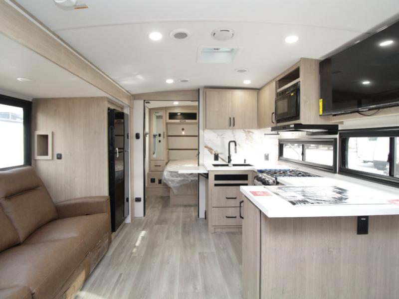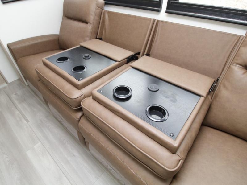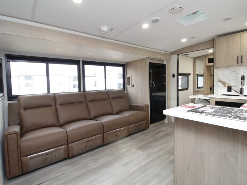 The central living and kitchen area offers a welcoming space to relax, entertain, and dine. A slide-out with quad theater seating provides generous lounge space, while the 10 cu. ft. refrigerator keeps food and beverages cold for extended stays. Across from the seating area, the U-shaped kitchen is fully equipped with a stainless-steel sink, three-burner range with oven, microwave, and solid surface countertops. A bar-top counter with stools creates a comfortable dining area, and the pull-out pantry keeps everything organized.