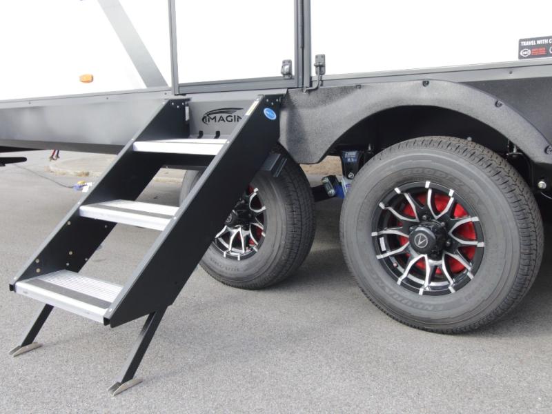 The Grand Design Imagine series is engineered for extended-season camping with a high-capacity furnace, heated and enclosed underbelly with suspended tanks, dedicated heat ducting to the subfloor, and high-density roof insulation with attic venting. A large panoramic window fills the interior with natural light, while the adjustable power awning with LED lighting extends your living space outdoors.