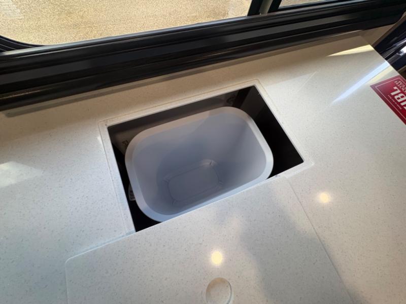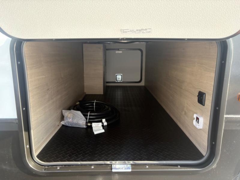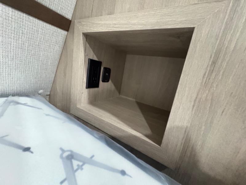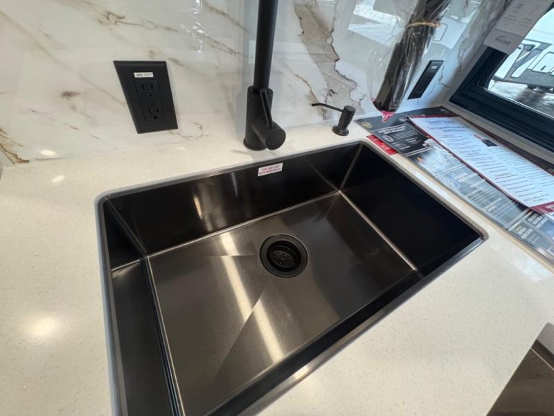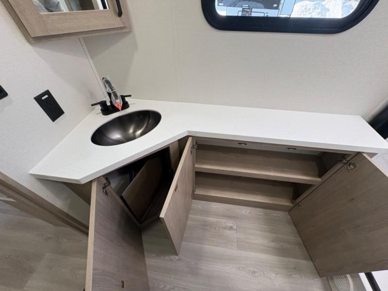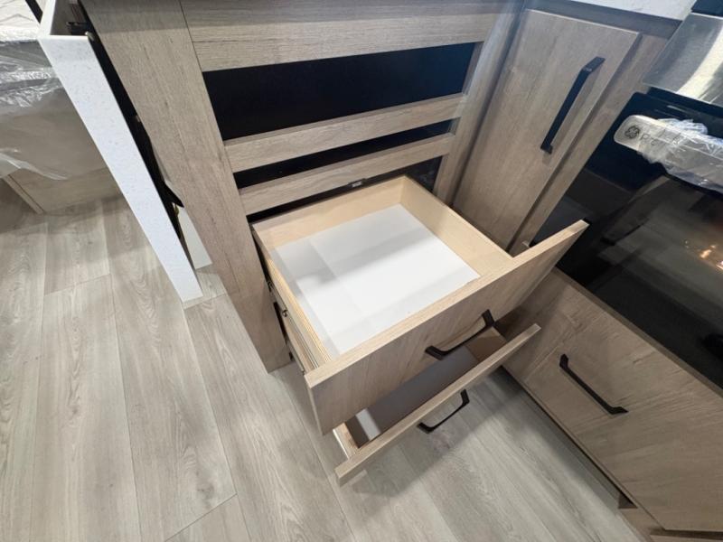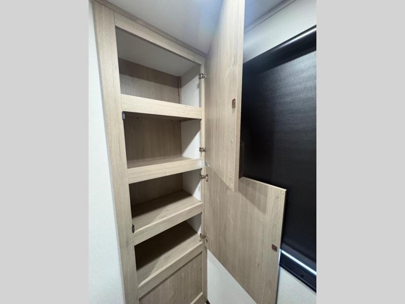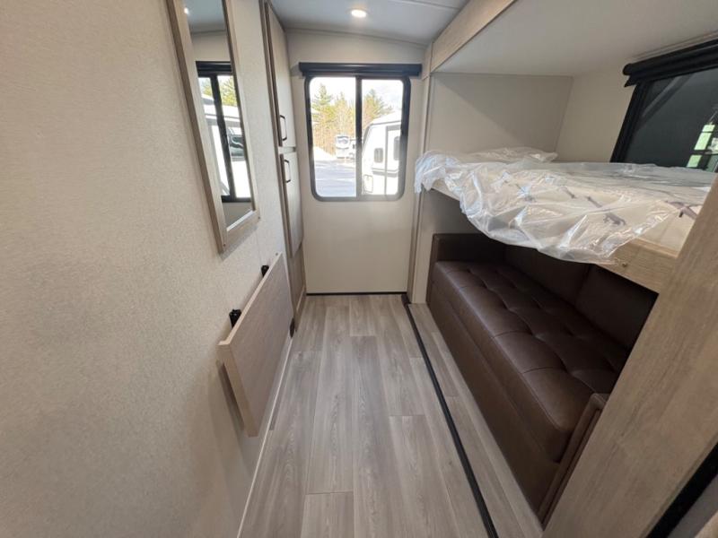 At the front of this 2810BH travel trailer, you’ll find a spacious full bedroom featuring a 60" x 80" queen bed, perfect for resting in comfort after a long day, along with dual wardrobes on each side to store your clothes and essentials. For added convenience, one of the two entry doors is located directly in the bedroom. Moving toward the center, the living area and kitchen create a welcoming space to relax and dine. The slide-out houses a quad theater seat, offering plenty of room to lounge, as well as a 10-cu. ft. refrigerator to keep your groceries fresh. Across from it, the U-shaped kitchen comes fully equipped with everything you need to cook comfortably, including a stainless-steel sink, three-burner range with oven, microwave, and solid surface countertops for meal prep. A bar top with stools provides a cozy dining spot, while a pull-out pantry keeps snacks organized. At the rear, the corner bathroom includes a 30" x 36" residential walk-in shower with skylight and a mirrored medicine cabinet, so you can skip the campsite facilities. Adjacent to it, the bunkhouse accommodates guests with a 36" flip-top bunk, tri-fold sofa, and even a flip-up desk, perfect for studying or remote work while on the road.
