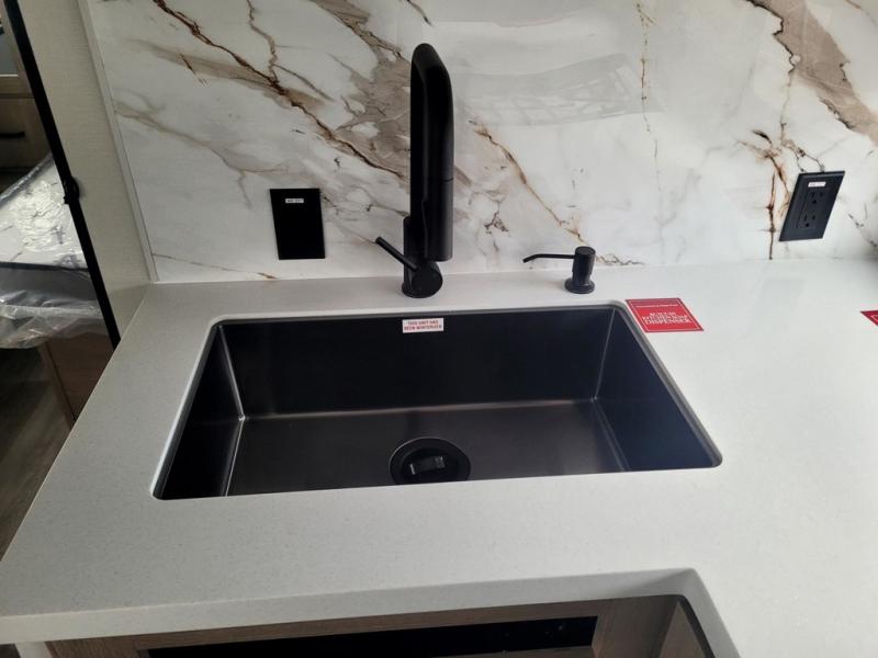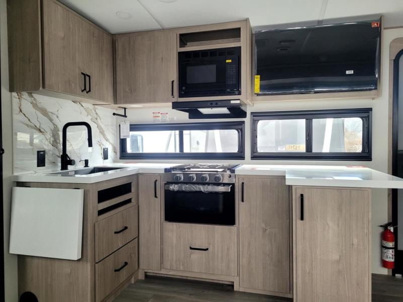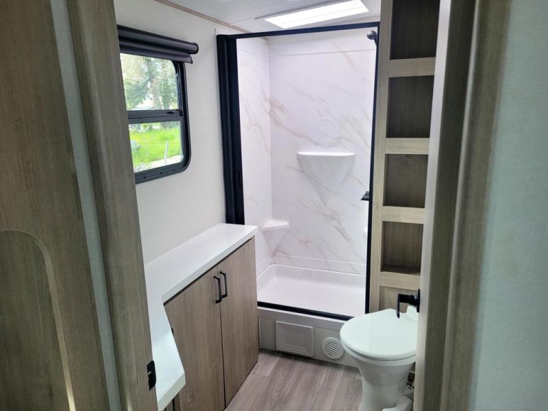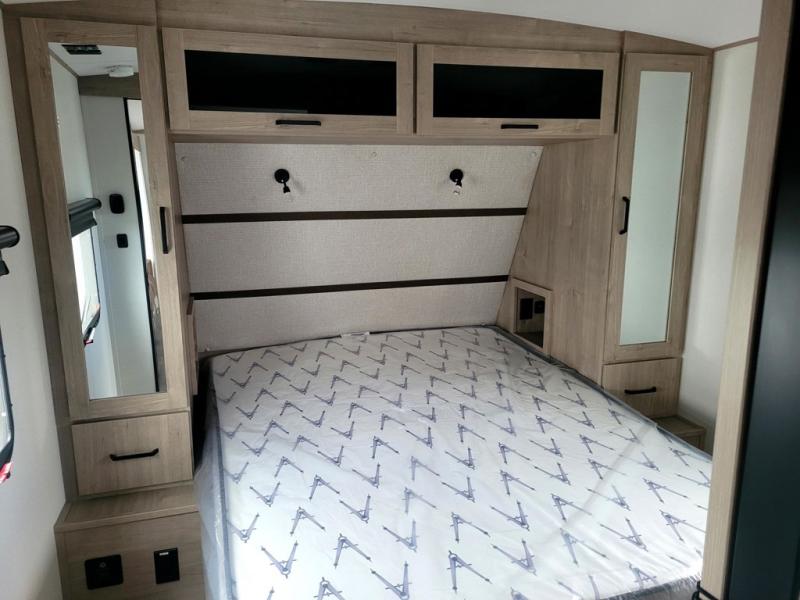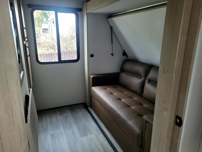At the front of this 2810BH travel trailer, you’ll find a spacious full bedroom featuring a 60" x 80" queen bed, perfect for resting in comfort after a long day, along with dual wardrobes on each side to store your clothes and essentials. For added convenience, one of the two entry doors is located directly in the bedroom. Moving toward the center, the living area and kitchen create a welcoming space to relax and dine. The slide-out houses a quad theater seat, offering plenty of room to lounge, as well as a 10-cu. ft. refrigerator to keep your groceries fresh. Across from it, the U-shaped kitchen comes fully equipped with everything you need to cook comfortably, including a stainless-steel sink, three-burner range with oven, microwave, and solid surface countertops for meal prep. A bar top with stools provides a cozy dining spot, while a pull-out pantry keeps snacks organized. At the rear, the corner bathroom includes a 30" x 36" residential walk-in shower with skylight and a mirrored medicine cabinet, so you can skip the campsite facilities. Adjacent to it, the bunkhouse accommodates guests with a 36" flip-top bunk, tri-fold sofa, and even a flip-up desk, perfect for studying or remote work while on the road.