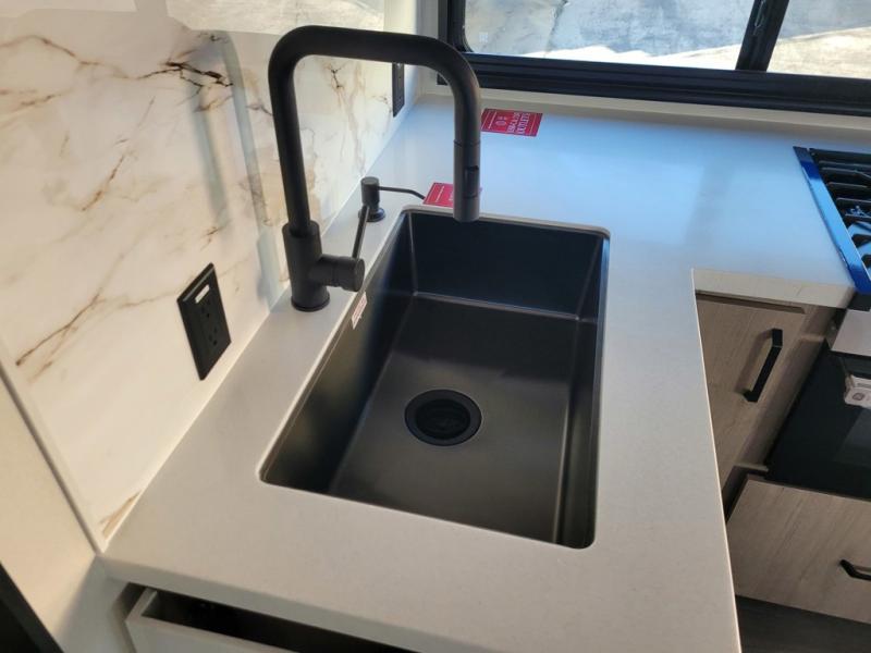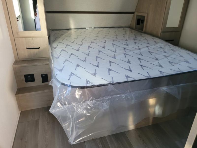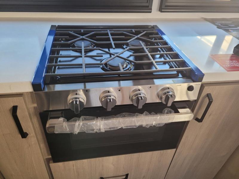 At the front of this 2810BH travel trailer, you’ll find a spacious full bedroom featuring a 60" x 80" queen bed, perfect for resting in comfort after a long day, along with dual wardrobes on each side to store your clothes and essentials. For added convenience, one of the two entry doors is located directly in the bedroom. Moving toward the center, the living area and kitchen create a welcoming space to relax and dine. The slide-out houses a quad theater seat, offering plenty of room to lounge, as well as a 10-cu. ft. refrigerator to keep your groceries fresh. Across from it, the U-shaped kitchen comes fully equipped with everything you need to cook comfortably, including a stainless-steel sink, three-burner range with oven, microwave, and solid surface countertops for meal prep. A bar top with stools provides a cozy dining spot, while a pull-out pantry keeps snacks organized. At the rear, the corner bathroom includes a 30" x 36" residential walk-in shower with skylight and a mirrored medicine cabinet, so you can skip the campsite facilities. Adjacent to it, the bunkhouse accommodates guests with a 36" flip-top bunk, tri-fold sofa, and even a flip-up desk, perfect for studying or remote work while on the road.