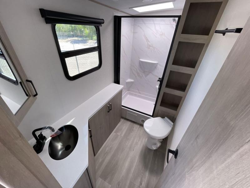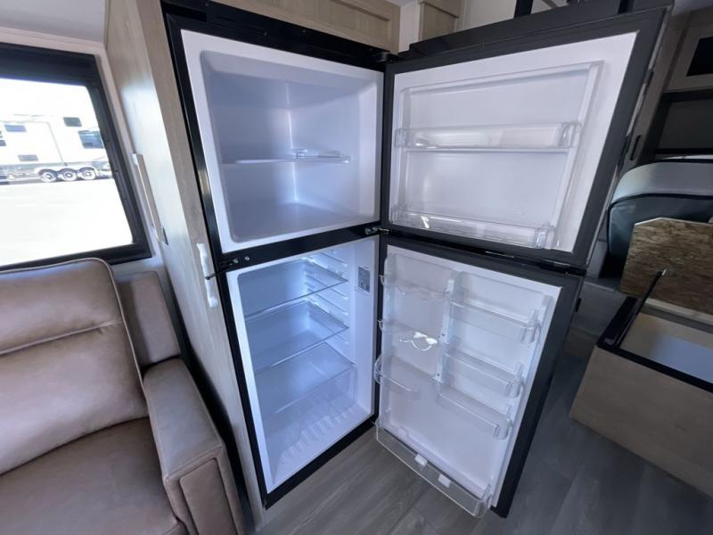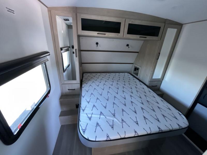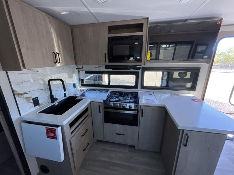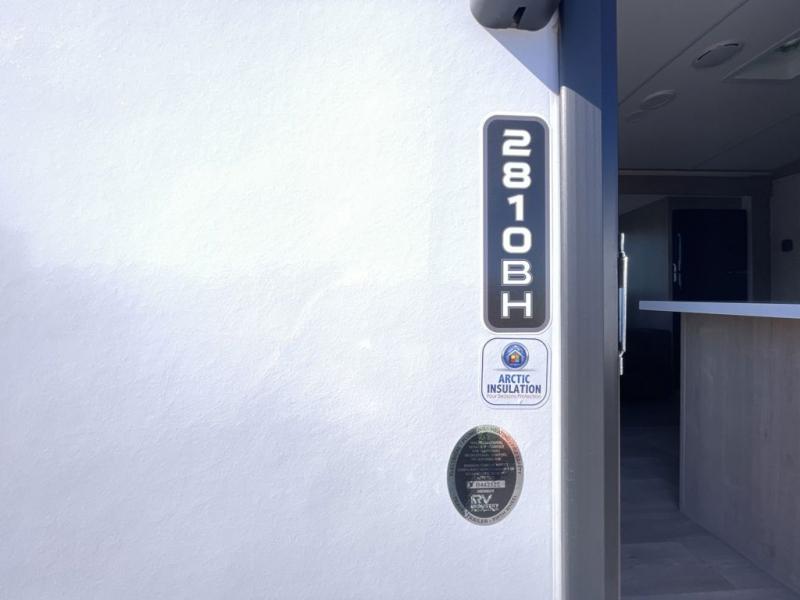 At the front of this 2810BH travel trailer, you’ll find a spacious full bedroom featuring a 60" x 80" queen bed, perfect for resting in comfort after a long day, along with dual wardrobes on each side to store your clothes and essentials. For added convenience, one of the two entry doors is located directly in the bedroom. Moving toward the center, the living area and kitchen create a welcoming space to relax and dine. The slide-out houses a quad theater seat, offering plenty of room to lounge, as well as a 10-cu. ft. refrigerator to keep your groceries fresh. Across from it, the U-shaped kitchen comes fully equipped with everything you need to cook comfortably, including a stainless-steel sink, three-burner range with oven, microwave, and solid surface countertops for meal prep. A bar top with stools provides a cozy dining spot, while a pull-out pantry keeps snacks organized. At the rear, the corner bathroom includes a 30" x 36" residential walk-in shower with skylight and a mirrored medicine cabinet, so you can skip the campsite facilities. Adjacent to it, the bunkhouse accommodates guests with a 36" flip-top bunk, tri-fold sofa, and even a flip-up desk, perfect for studying or remote work while on the road.