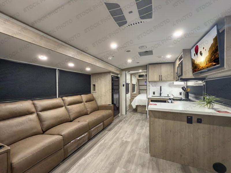 At the front of this 2810BH travel trailer, you’ll find a spacious full bedroom featuring a 60" x 80" queen bed, perfect for resting in comfort after a long day, along with dual wardrobes on each side to store your clothes and essentials. For added convenience, one of the two entry doors is located directly in the bedroom. Moving toward the center, the living area and kitchen create a welcoming space to relax and dine. The slide-out houses a quad theater seat, offering plenty of room to lounge, as well as a 10-cu. ft. refrigerator to keep your groceries fresh. Across from it, the U-shaped kitchen comes fully equipped with everything you need to cook comfortably, including a stainless-steel sink, three-burner range with oven, microwave, and solid surface countertops for meal prep. A bar top with stools provides a cozy dining spot, while a pull-out pantry keeps snacks organized. At the rear, the corner bathroom includes a 30" x 36" residential walk-in shower with skylight and a mirrored medicine cabinet, so you can skip the campsite facilities. Adjacent to it, the bunkhouse accommodates guests with a 36" flip-top bunk, tri-fold sofa, and even a flip-up desk, perfect for studying or remote work while on the road.
