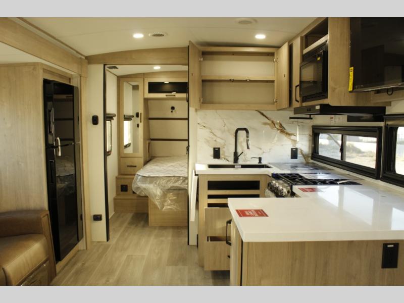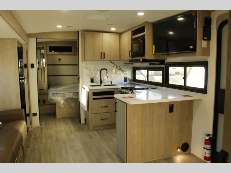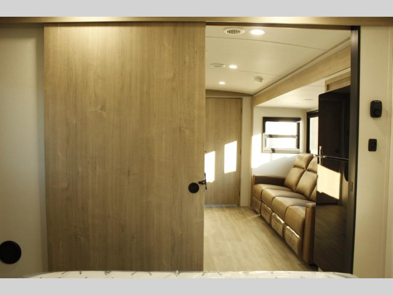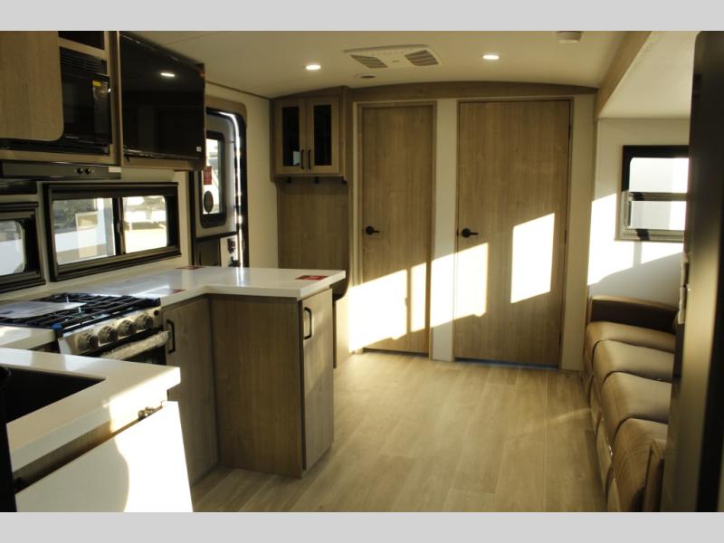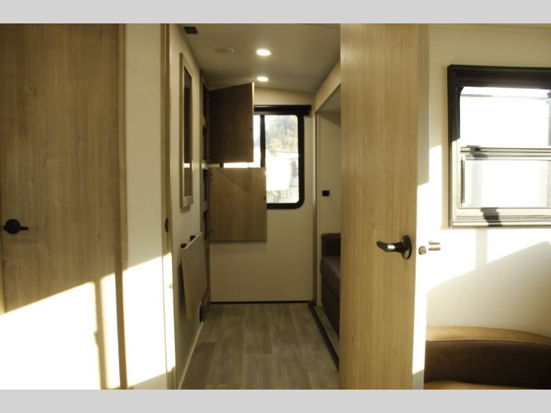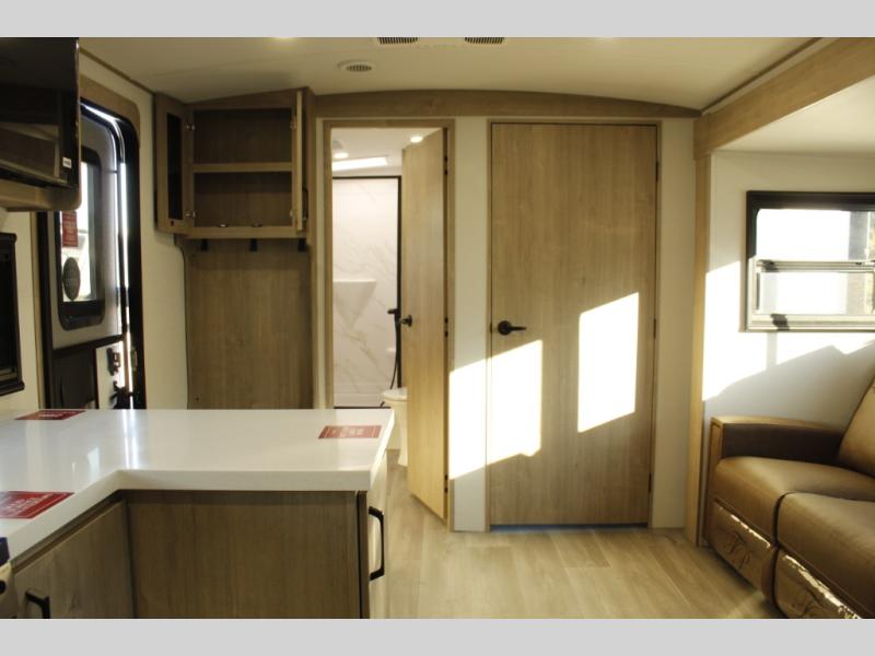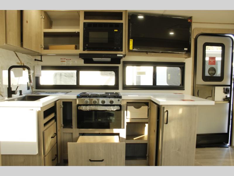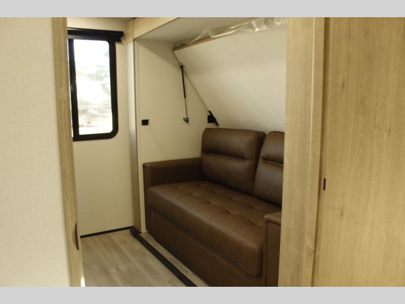 At the front of this 2810BH travel trailer, you’ll find a spacious full bedroom featuring a 60" x 80" queen bed, perfect for resting in comfort after a long day, along with dual wardrobes on each side to store your clothes and essentials. For added convenience, one of the two entry doors is located directly in the bedroom. Moving toward the center, the living area and kitchen create a welcoming space to relax and dine. The slide-out houses a quad theater seat, offering plenty of room to lounge, as well as a 10-cu. ft. refrigerator to keep your groceries fresh. Across from it, the U-shaped kitchen comes fully equipped with everything you need to cook comfortably, including a stainless-steel sink, three-burner range with oven, microwave, and solid surface countertops for meal prep. A bar top with stools provides a cozy dining spot, while a pull-out pantry keeps snacks organized. At the rear, the corner bathroom includes a 30" x 36" residential walk-in shower with skylight and a mirrored medicine cabinet, so you can skip the campsite facilities. Adjacent to it, the bunkhouse accommodates guests with a 36" flip-top bunk, tri-fold sofa, and even a flip-up desk, perfect for studying or remote work while on the road.