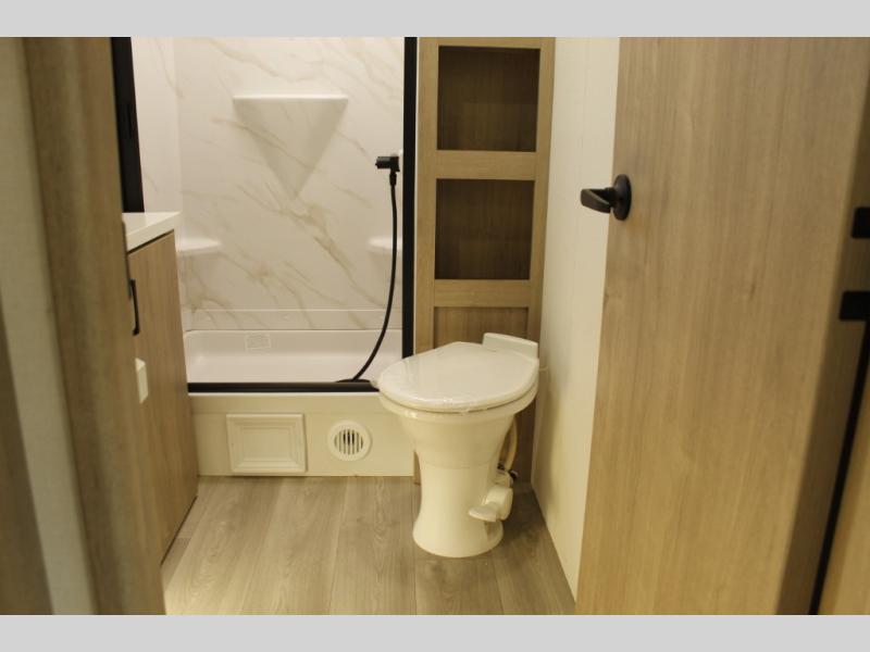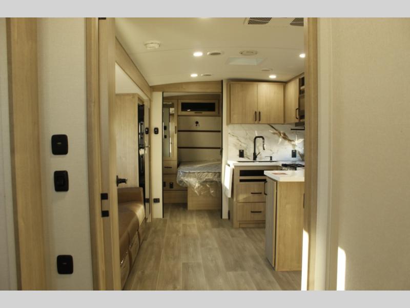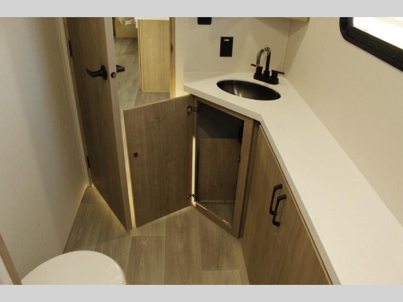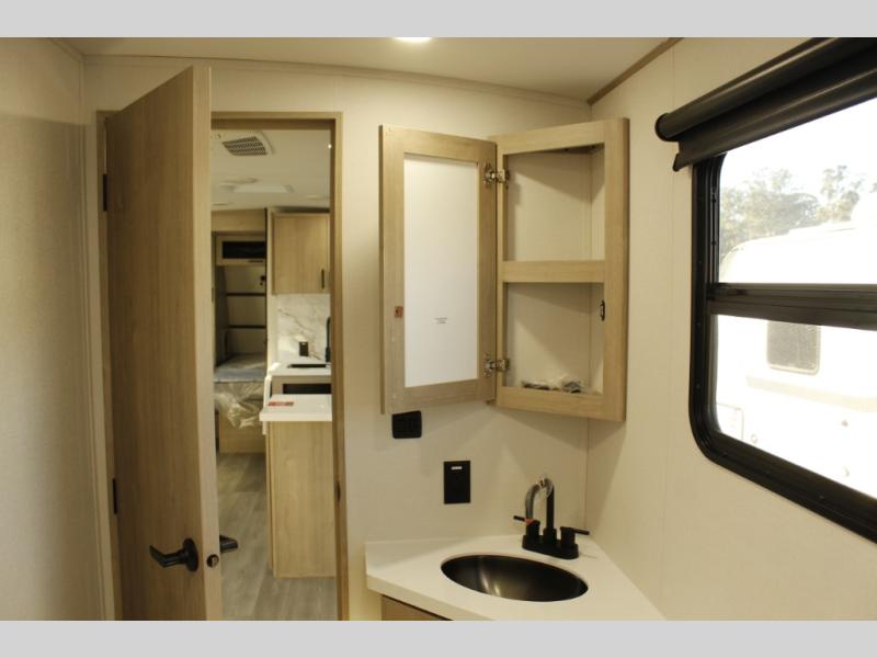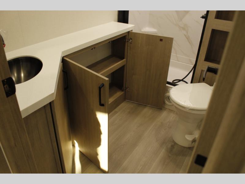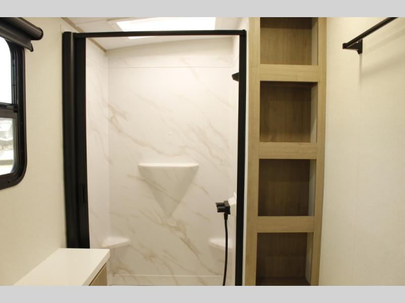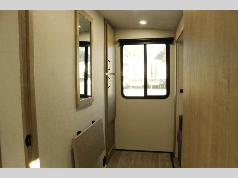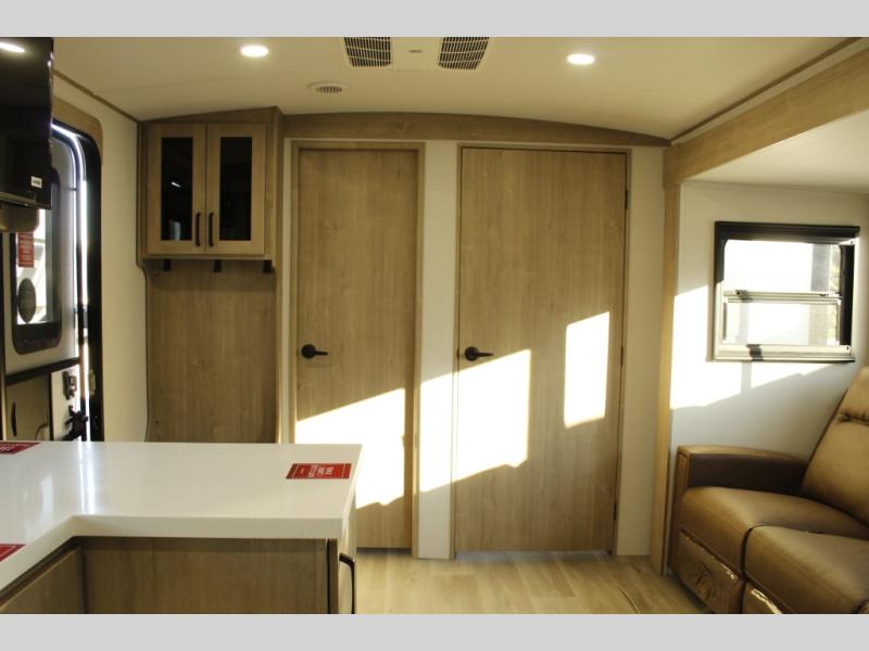 At the front of this 2810BH travel trailer, you’ll find a spacious full bedroom featuring a 60" x 80" queen bed, perfect for resting in comfort after a long day, along with dual wardrobes on each side to store your clothes and essentials. For added convenience, one of the two entry doors is located directly in the bedroom. Moving toward the center, the living area and kitchen create a welcoming space to relax and dine. The slide-out houses a quad theater seat, offering plenty of room to lounge, as well as a 10-cu. ft. refrigerator to keep your groceries fresh. Across from it, the U-shaped kitchen comes fully equipped with everything you need to cook comfortably, including a stainless-steel sink, three-burner range with oven, microwave, and solid surface countertops for meal prep. A bar top with stools provides a cozy dining spot, while a pull-out pantry keeps snacks organized. At the rear, the corner bathroom includes a 30" x 36" residential walk-in shower with skylight and a mirrored medicine cabinet, so you can skip the campsite facilities. Adjacent to it, the bunkhouse accommodates guests with a 36" flip-top bunk, tri-fold sofa, and even a flip-up desk, perfect for studying or remote work while on the road.