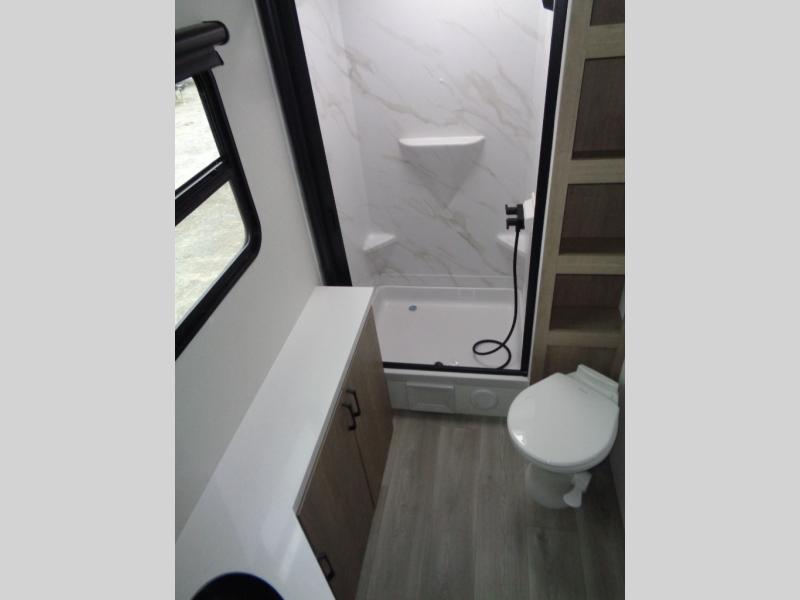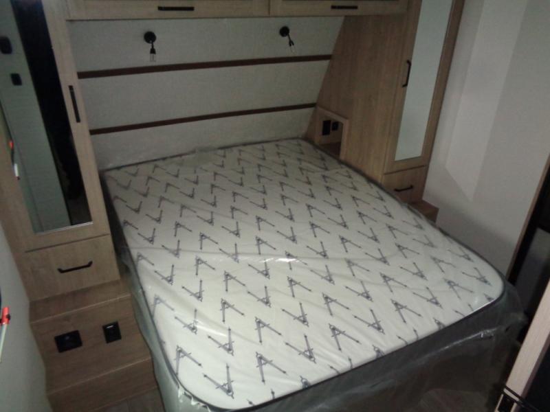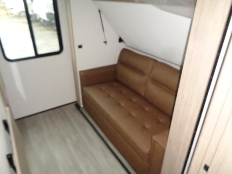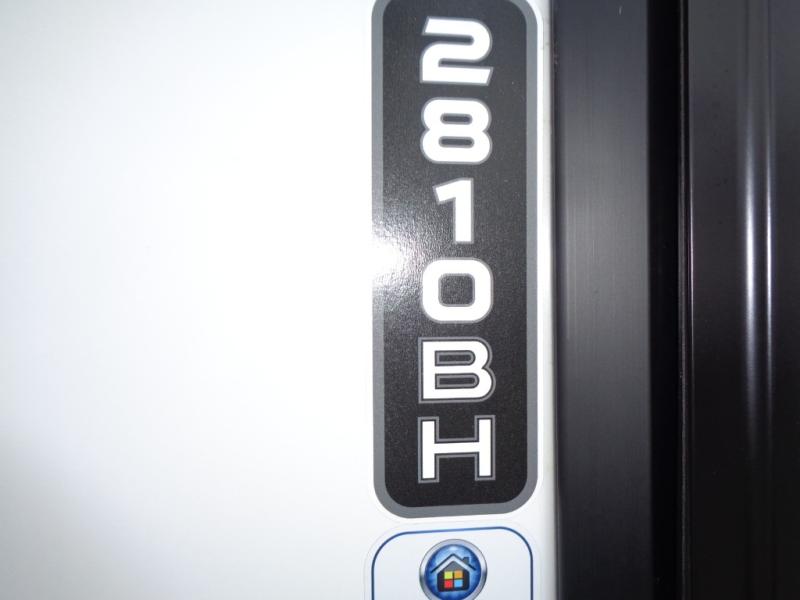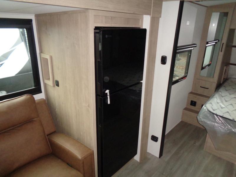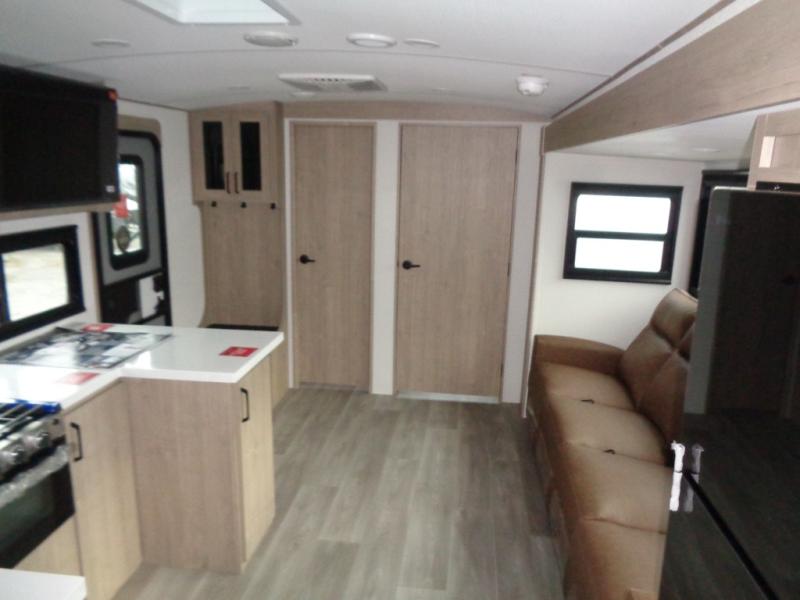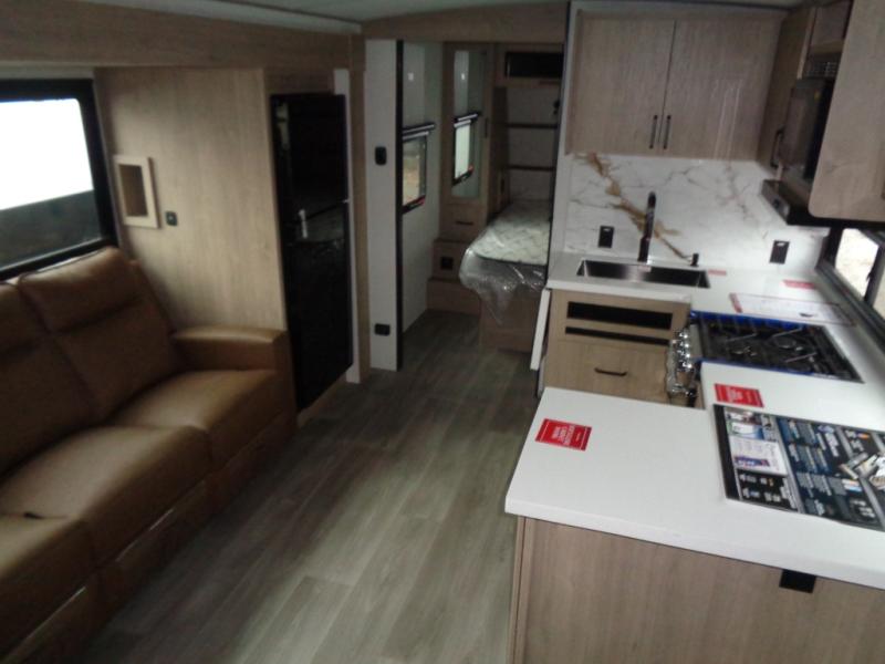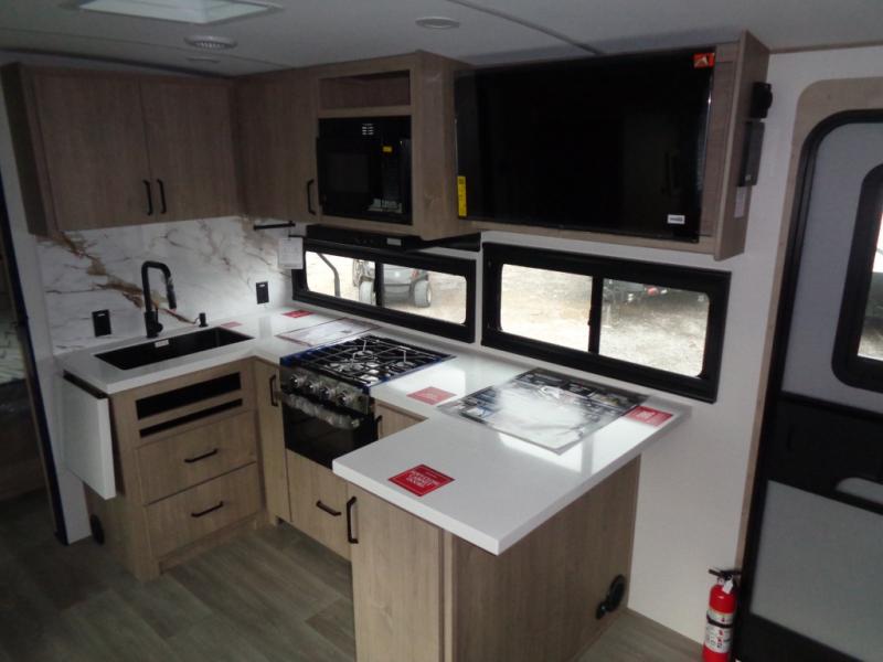 At the front of this 2810BH travel trailer, you’ll find a spacious full bedroom featuring a 60" x 80" queen bed, perfect for resting in comfort after a long day, along with dual wardrobes on each side to store your clothes and essentials. For added convenience, one of the two entry doors is located directly in the bedroom. Moving toward the center, the living area and kitchen create a welcoming space to relax and dine. The slide-out houses a quad theater seat, offering plenty of room to lounge, as well as a 10-cu. ft. refrigerator to keep your groceries fresh. Across from it, the U-shaped kitchen comes fully equipped with everything you need to cook comfortably, including a stainless-steel sink, three-burner range with oven, microwave, and solid surface countertops for meal prep. A bar top with stools provides a cozy dining spot, while a pull-out pantry keeps snacks organized. At the rear, the corner bathroom includes a 30" x 36" residential walk-in shower with skylight and a mirrored medicine cabinet, so you can skip the campsite facilities. Adjacent to it, the bunkhouse accommodates guests with a 36" flip-top bunk, tri-fold sofa, and even a flip-up desk, perfect for studying or remote work while on the road.
