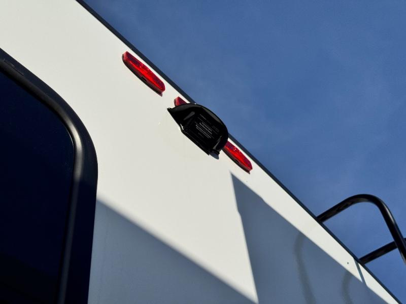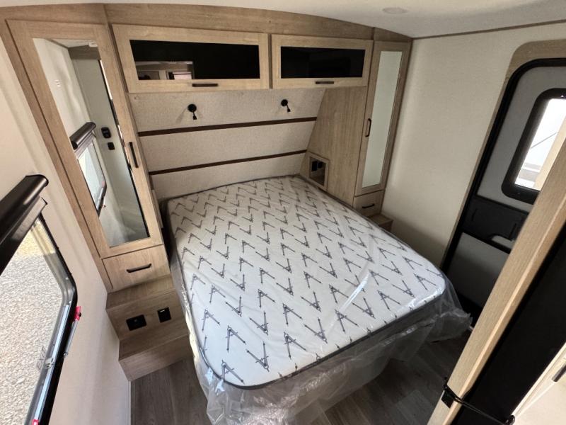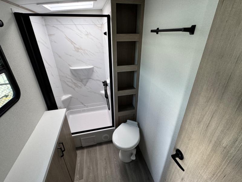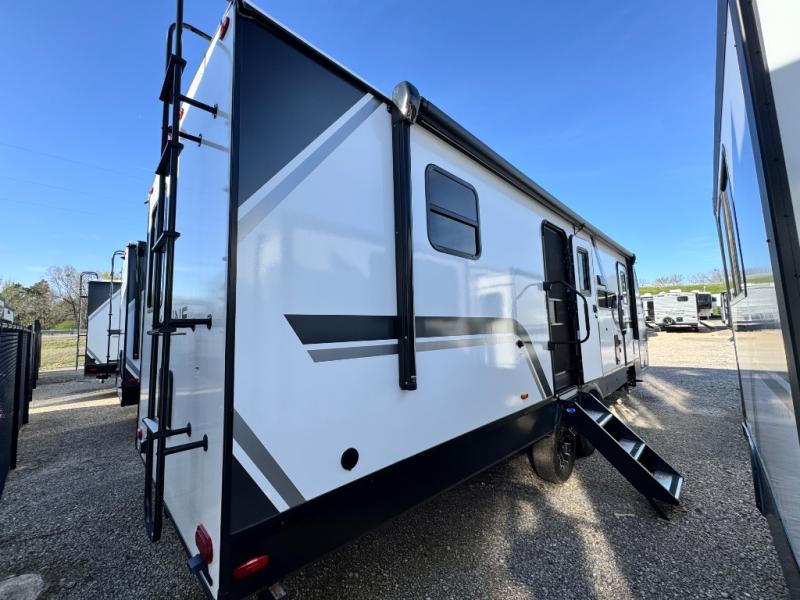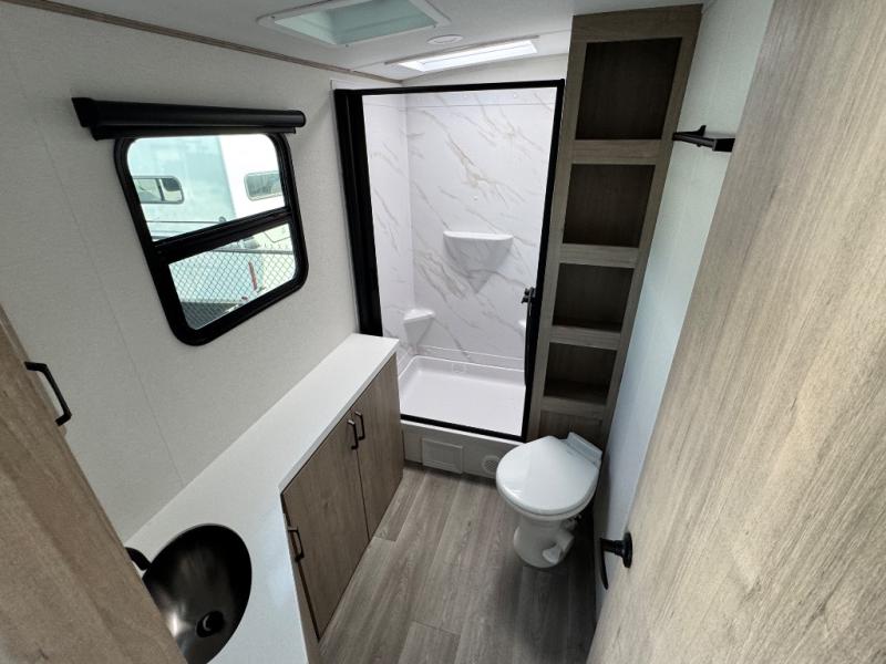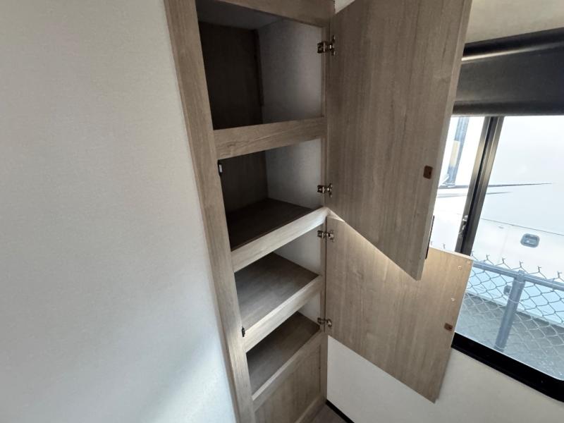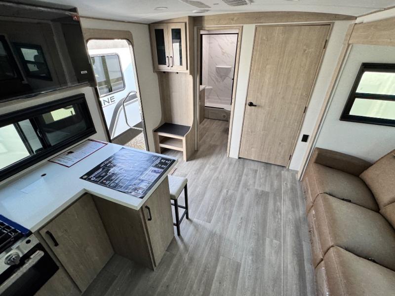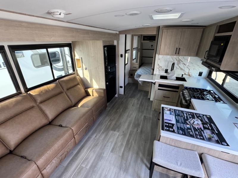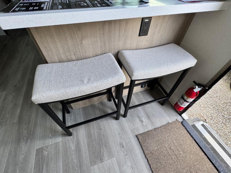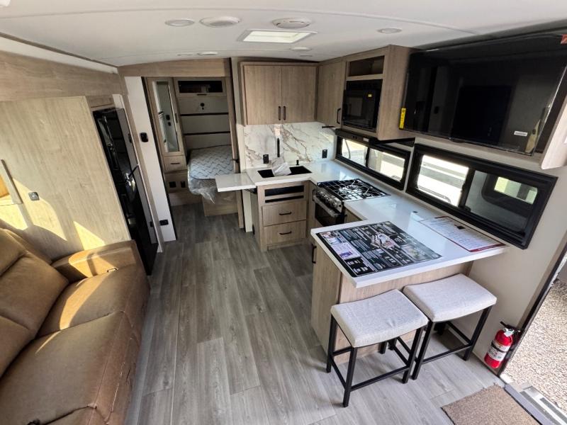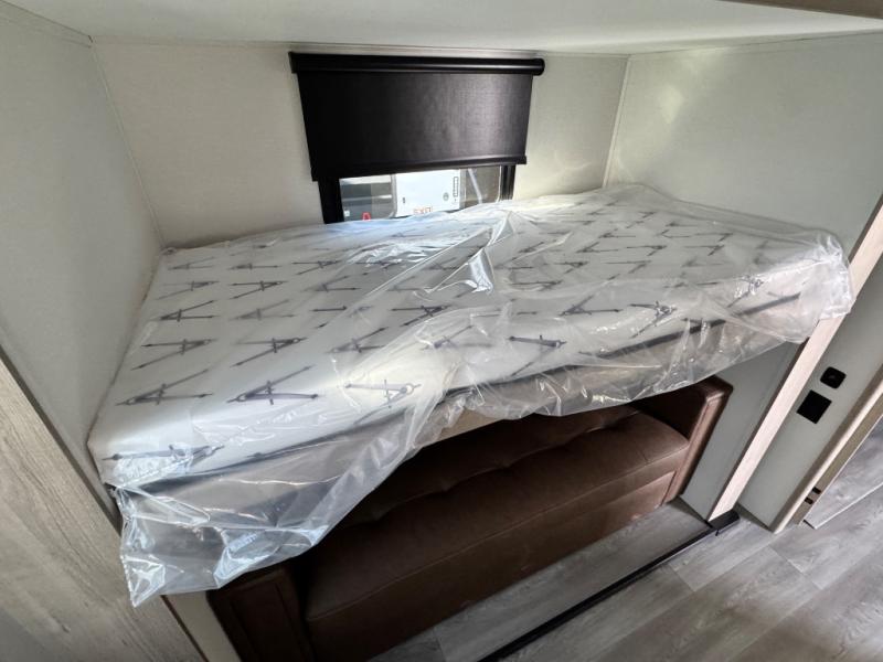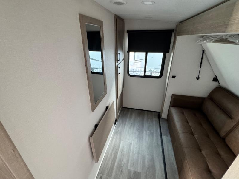 At the front of this 2810BH travel trailer, you’ll find a spacious full bedroom featuring a 60" x 80" queen bed, perfect for resting in comfort after a long day, along with dual wardrobes on each side to store your clothes and essentials. For added convenience, one of the two entry doors is located directly in the bedroom. Moving toward the center, the living area and kitchen create a welcoming space to relax and dine. The slide-out houses a quad theater seat, offering plenty of room to lounge, as well as a 10-cu. ft. refrigerator to keep your groceries fresh. Across from it, the U-shaped kitchen comes fully equipped with everything you need to cook comfortably, including a stainless-steel sink, three-burner range with oven, microwave, and solid surface countertops for meal prep. A bar top with stools provides a cozy dining spot, while a pull-out pantry keeps snacks organized. At the rear, the corner bathroom includes a 30" x 36" residential walk-in shower with skylight and a mirrored medicine cabinet, so you can skip the campsite facilities. Adjacent to it, the bunkhouse accommodates guests with a 36" flip-top bunk, tri-fold sofa, and even a flip-up desk, perfect for studying or remote work while on the road.