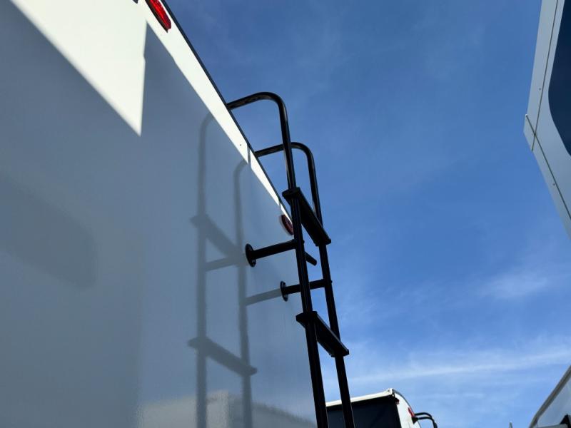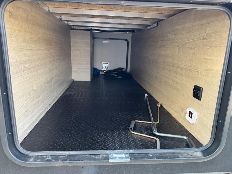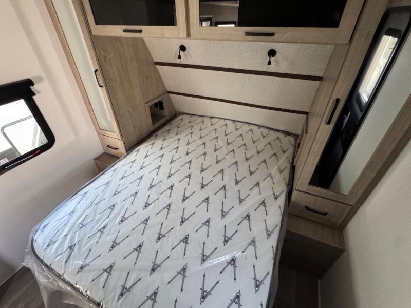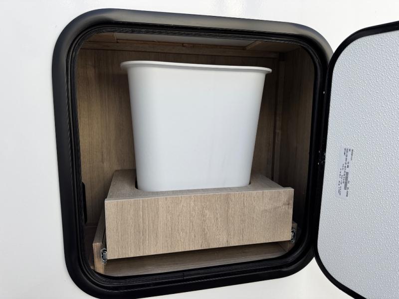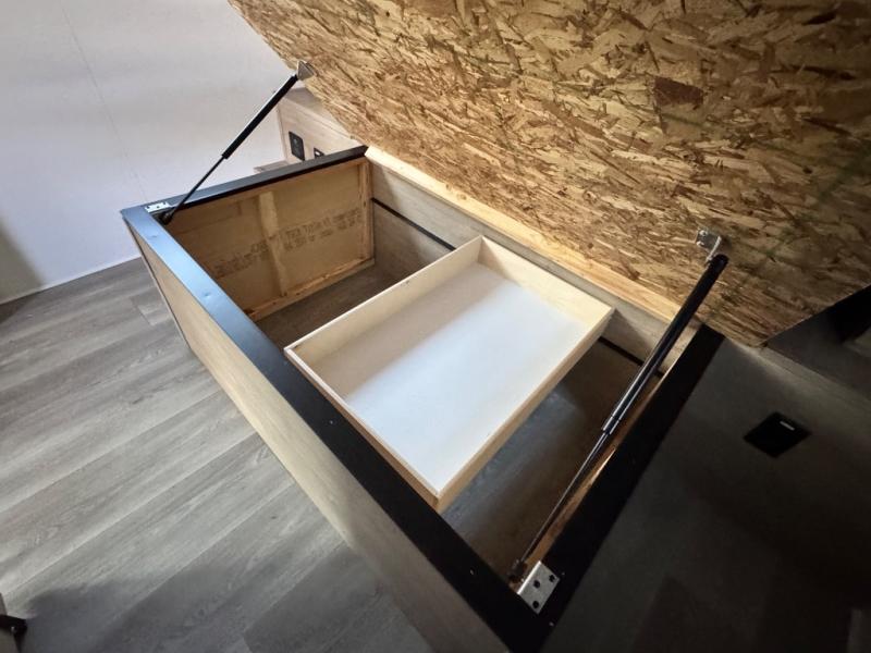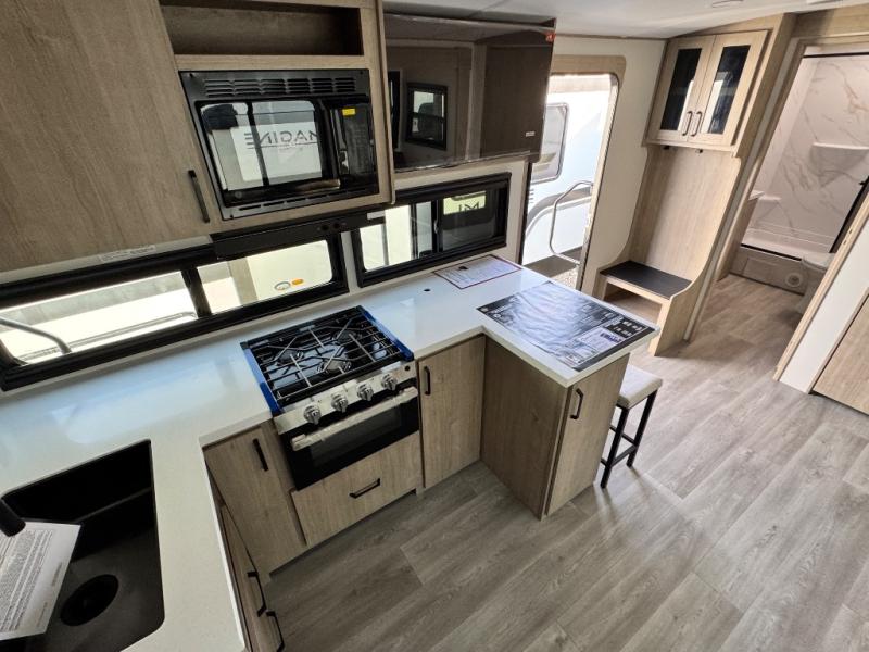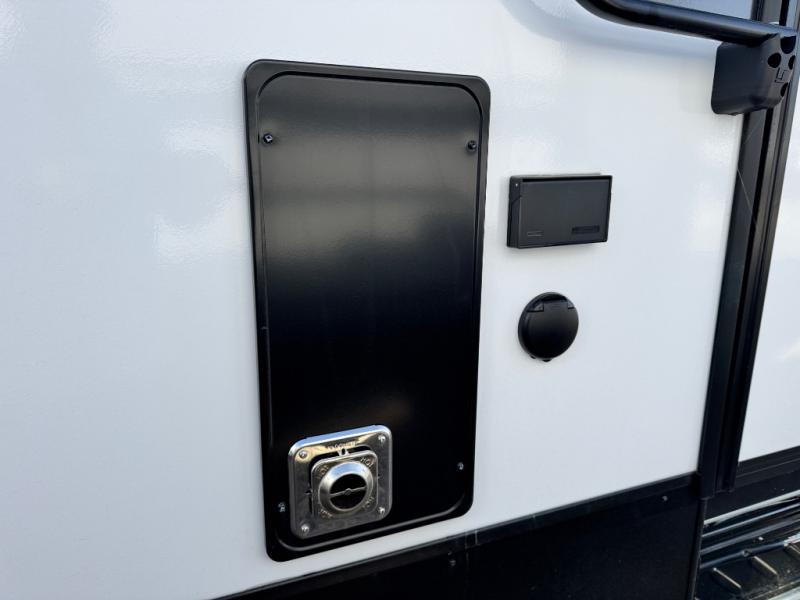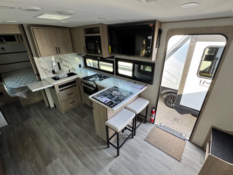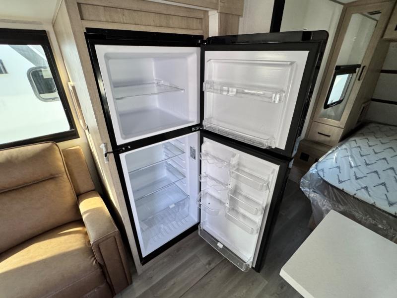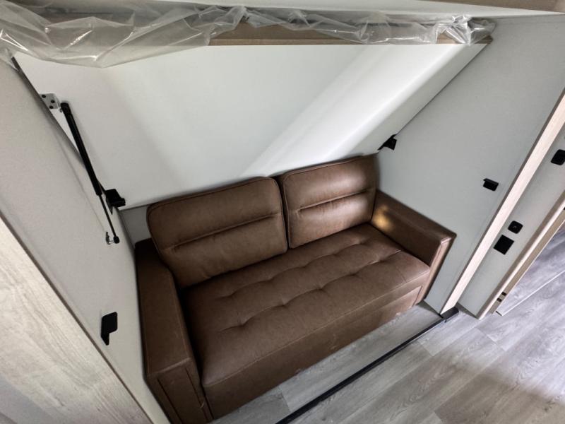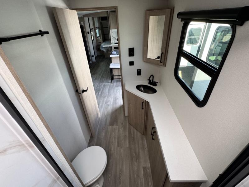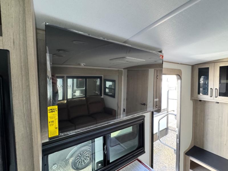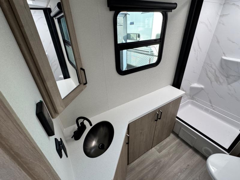 At the front of this 2810BH travel trailer, you’ll find a spacious full bedroom featuring a 60" x 80" queen bed, perfect for resting in comfort after a long day, along with dual wardrobes on each side to store your clothes and essentials. For added convenience, one of the two entry doors is located directly in the bedroom. Moving toward the center, the living area and kitchen create a welcoming space to relax and dine. The slide-out houses a quad theater seat, offering plenty of room to lounge, as well as a 10-cu. ft. refrigerator to keep your groceries fresh. Across from it, the U-shaped kitchen comes fully equipped with everything you need to cook comfortably, including a stainless-steel sink, three-burner range with oven, microwave, and solid surface countertops for meal prep. A bar top with stools provides a cozy dining spot, while a pull-out pantry keeps snacks organized. At the rear, the corner bathroom includes a 30" x 36" residential walk-in shower with skylight and a mirrored medicine cabinet, so you can skip the campsite facilities. Adjacent to it, the bunkhouse accommodates guests with a 36" flip-top bunk, tri-fold sofa, and even a flip-up desk, perfect for studying or remote work while on the road.