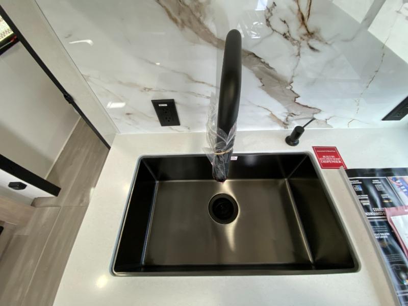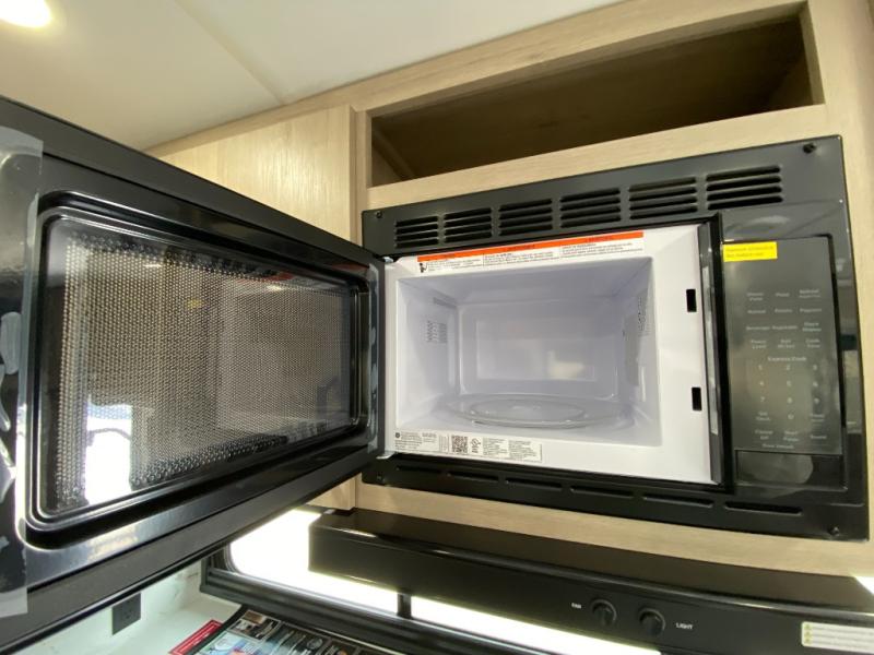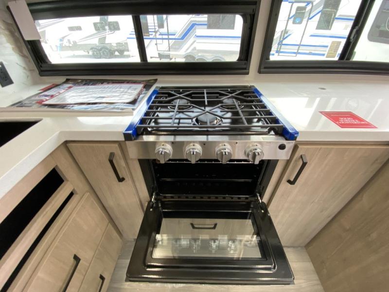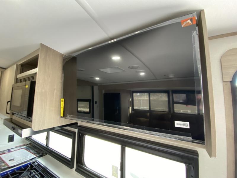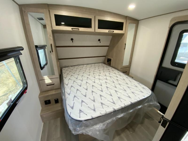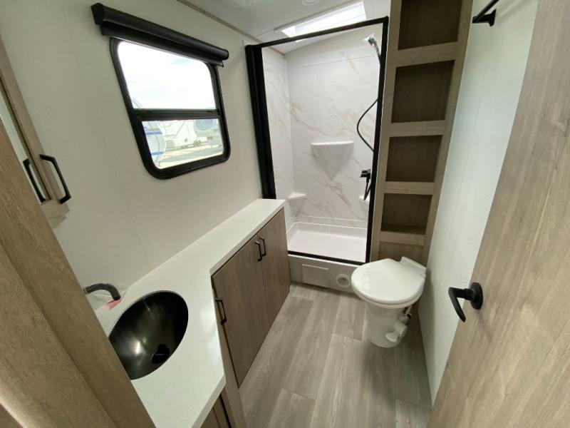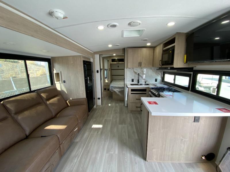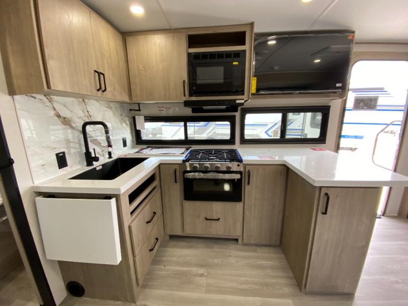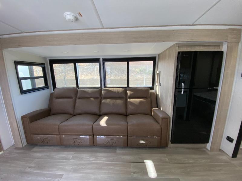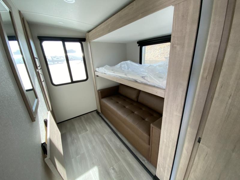 At the front of this 2810BH travel trailer, you’ll find a spacious full bedroom featuring a 60" x 80" queen bed, perfect for resting in comfort after a long day, along with dual wardrobes on each side to store your clothes and essentials. For added convenience, one of the two entry doors is located directly in the bedroom. Moving toward the center, the living area and kitchen create a welcoming space to relax and dine. The slide-out houses a quad theater seat, offering plenty of room to lounge, as well as a 10-cu. ft. refrigerator to keep your groceries fresh. Across from it, the U-shaped kitchen comes fully equipped with everything you need to cook comfortably, including a stainless-steel sink, three-burner range with oven, microwave, and solid surface countertops for meal prep. A bar top with stools provides a cozy dining spot, while a pull-out pantry keeps snacks organized. At the rear, the corner bathroom includes a 30" x 36" residential walk-in shower with skylight and a mirrored medicine cabinet, so you can skip the campsite facilities. Adjacent to it, the bunkhouse accommodates guests with a 36" flip-top bunk, tri-fold sofa, and even a flip-up desk, perfect for studying or remote work while on the road.