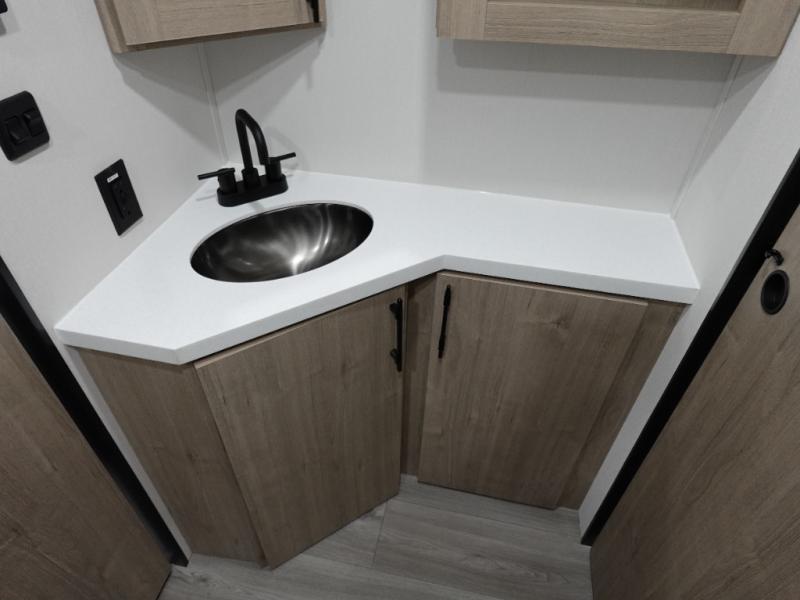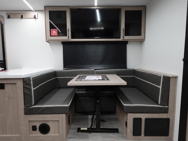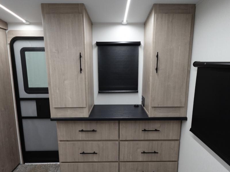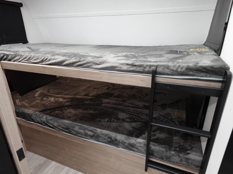 You will love this family bunkhouse trailer with dual entry/exit doors with one door leading directly into your rear private bedroom featuring a slide out queen bed, desk, and storage! A walk-through bath is also nearby for convenience and offers plenty of space being stretched across the width of the trailer. The second entry, closest to the front, leads directly into your spacious combined kitchen and living area. Here you will enjoy counter prep space for cooking, a three burner range and oven, plus overhead storage and drawers for all of your necessities. This unit has a U-shaped dinette which can seat all occupants easily. In front, a private bunkhouse with a 42" x 93" top bunk and 52" x 93" bottom bunk easily sleeping three. On the outside, a spray port to rinse off feet or your furry pal, LP quick connect, and a 21' awning to provide added living space to enjoy outdoors!