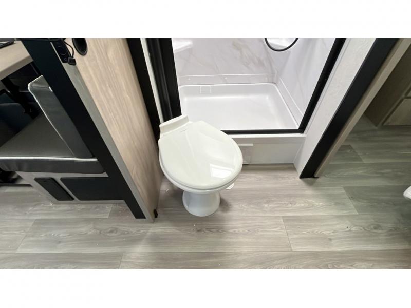 You will love this family bunkhouse trailer with dual entry/exit doors with one door leading directly into your rear private bedroom featuring a slide out queen bed, desk, and storage! A walk-through bath is also nearby for convenience and offers plenty of space being stretched across the width of the trailer. The second entry, closest to the front, leads directly into your spacious combined kitchen and living area. Here you will enjoy counter prep space for cooking, a three burner range and oven, plus overhead storage and drawers for all of your necessities. Your refrigerator is within the large slide that also houses theater seating for relaxing, or you could choose the optional tri-fold sofa if you are used to having overnight guests. This unit has a U-shaped dinette which can seat all occupants easily. In front, a private bunkhouse with a 42" x 93" top bunk and 52" x 93" bottom bunk easily sleeping three. On the outside, a spray port to rinse off feet or your furry pal, LP quick connect, and a 21' awning to provide added living space to enjoy outdoors!