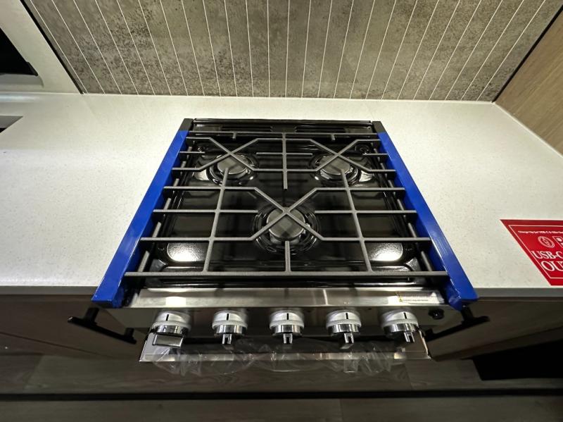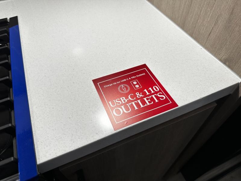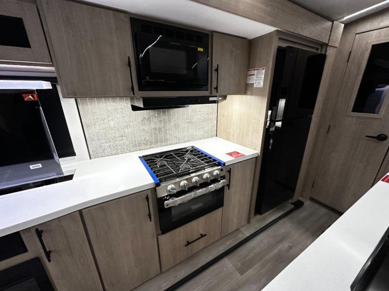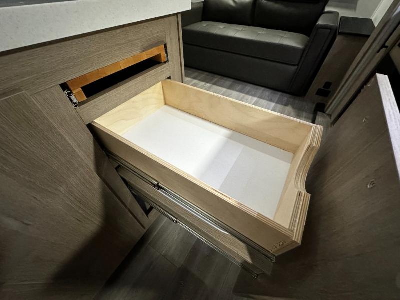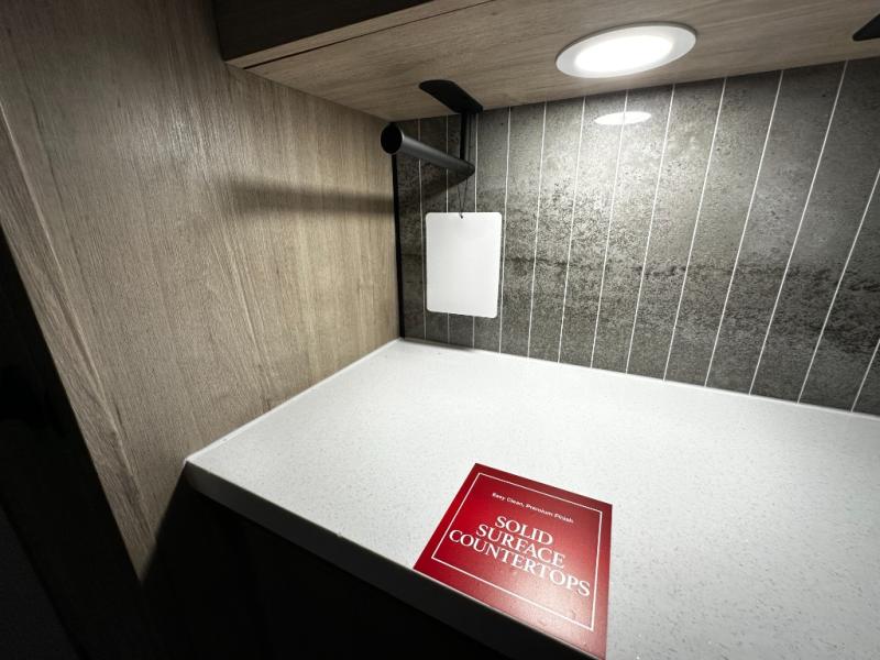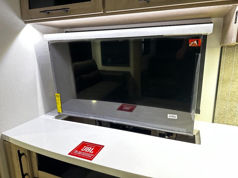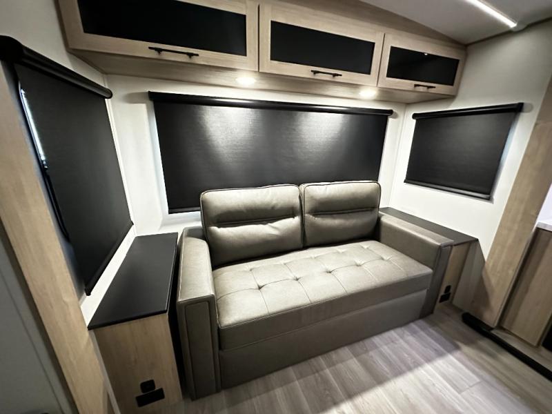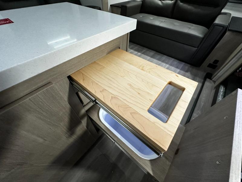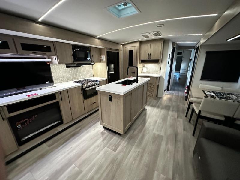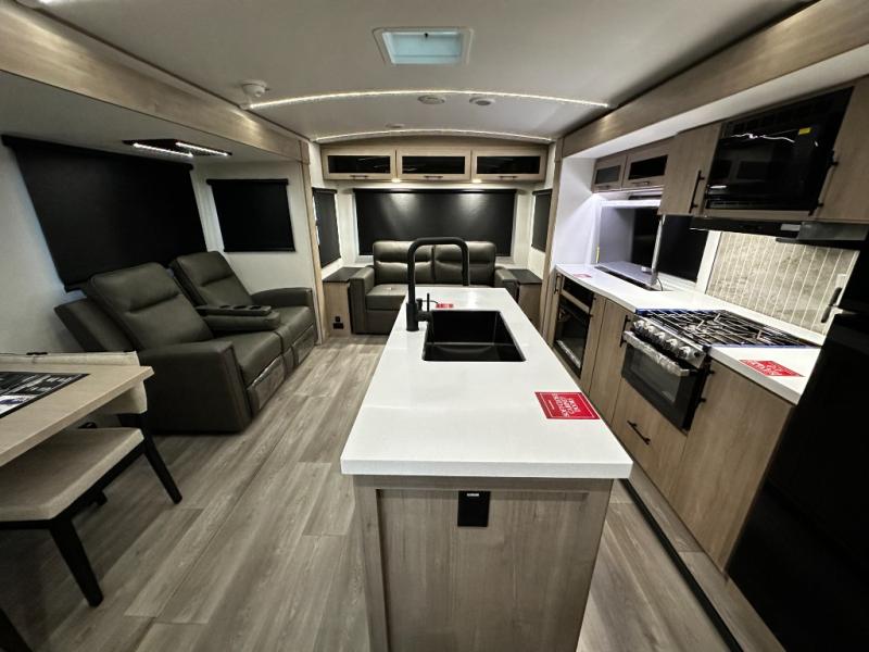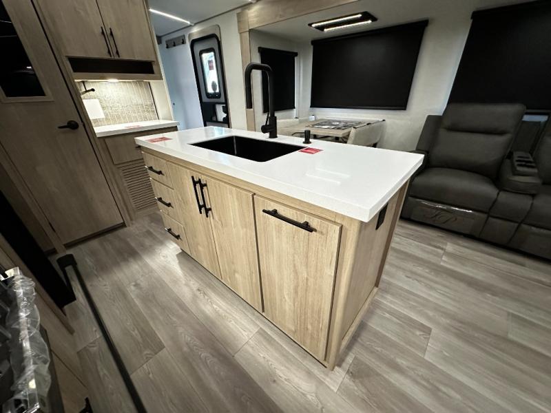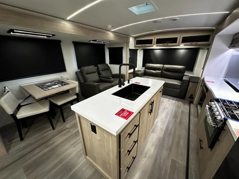 Step inside and enjoy the expansive dual opposing slides that open the living area into a true great room. The rear lounge layout features a plush tri-fold sofa, theater seating with premium recliners, and a beautifully centralized entertainment center complete with a large TV and an electric fireplace. Whether you’re relaxing after a full day outdoors or hosting friends at the campsite, this space feels open, bright, and welcoming.