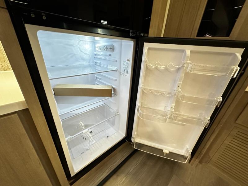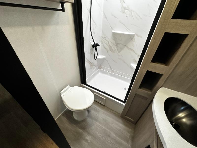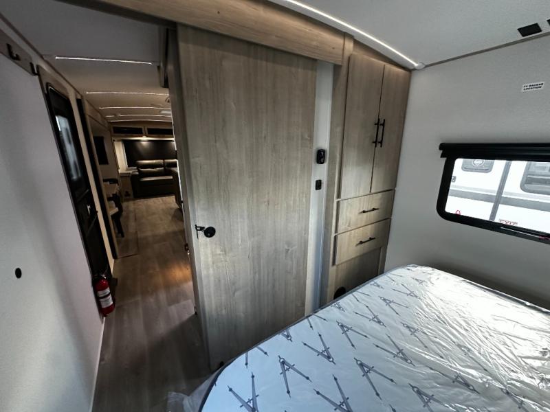 The private front bedroom offers a peaceful retreat with a walk-around queen bed, dual wardrobes, overhead cabinets, and under-bed storage. Solid sliding doors add privacy, making the bedroom feel like a dedicated sanctuary. Just outside, the walk-through bathroom provides a large shower, linen storage, and a well-organized layout for daily comfort.
