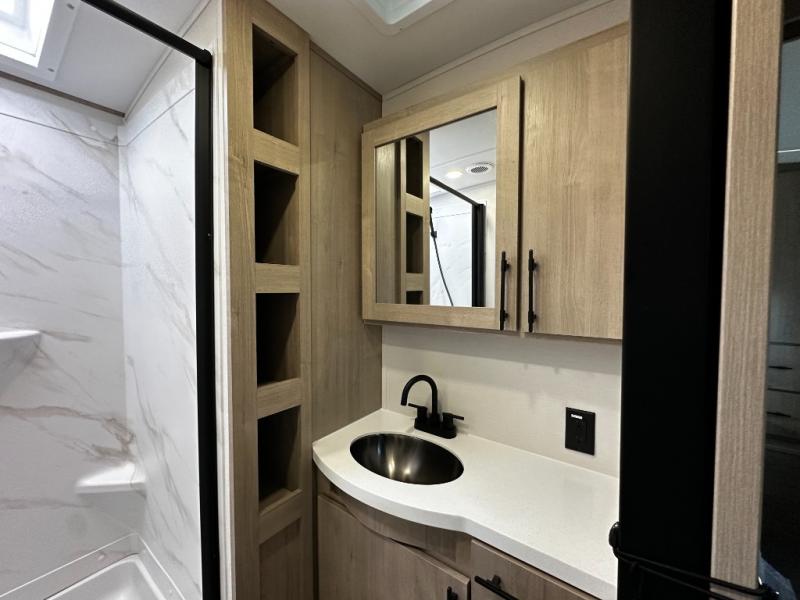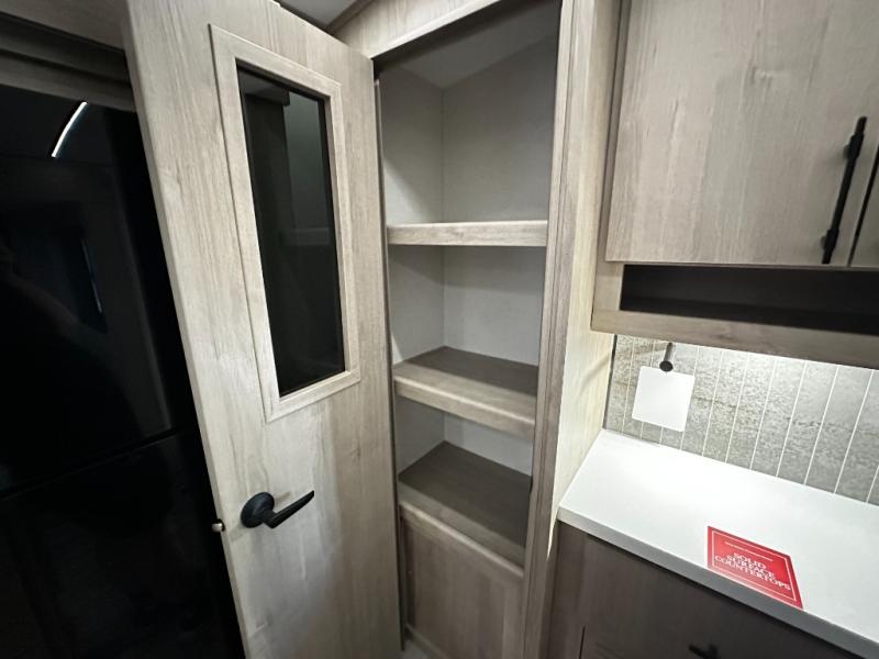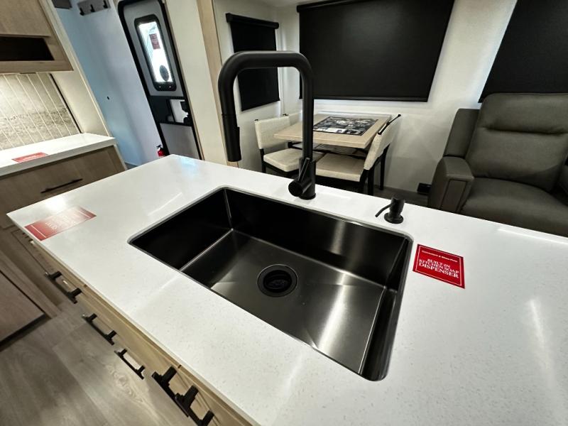The kitchen in the Imagine 2970RL is built for travelers who love to cook. Boasting a large kitchen island, deep stainless-steel sink, spacious countertops, residential appliances, and a generous pantry, it gives you all the room you need to prepare meals with ease. Opposite the kitchen sits a comfortable booth dinette or optional free-standing table and chairs, perfect for dining, game nights, or remote work.