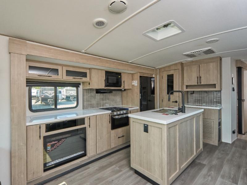 Enjoy movie nights in front of the fireplace and LED HDTV, or gather around the booth dinette for meals and games. The theater seating and tri-fold sofa provide plush comfort, while the kitchen island and hutch offer ample space for cooking and storage. Outside, relax under two power awnings and take advantage of the LP quick connect and coax TV hookup for outdoor entertainment.