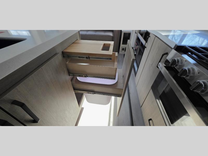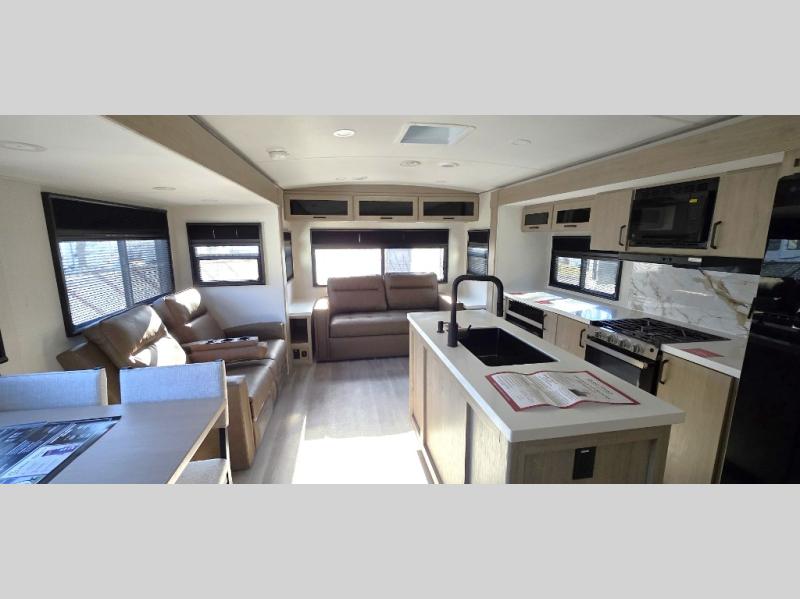 Cooking on the road is a joy with the Imagine 2970RL’s residential-style kitchen. A central island adds extra counter space and a deep stainless-steel sink for easy cleanup. The hutch and overhead cabinets provide additional storage, while solid-surface countertops and modern appliances—including a three-burner range, oven, microwave, and large refrigerator—make it easy to prepare everything from quick snacks to gourmet meals.
