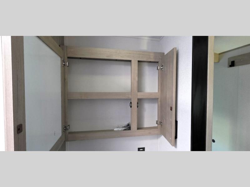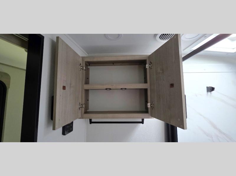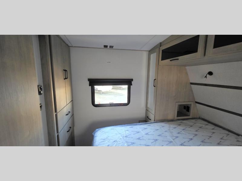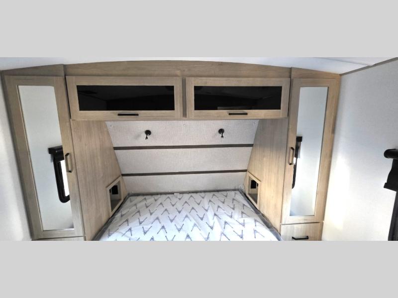 The private front bedroom offers a comfortable queen-size bed with wardrobes on both sides, overhead cabinets, and extra under-bed storage. A solid door separates the space for added privacy. The bathroom features a large shower with skylight, mirrored vanity, and linen storage—providing all the comforts of home wherever you go.