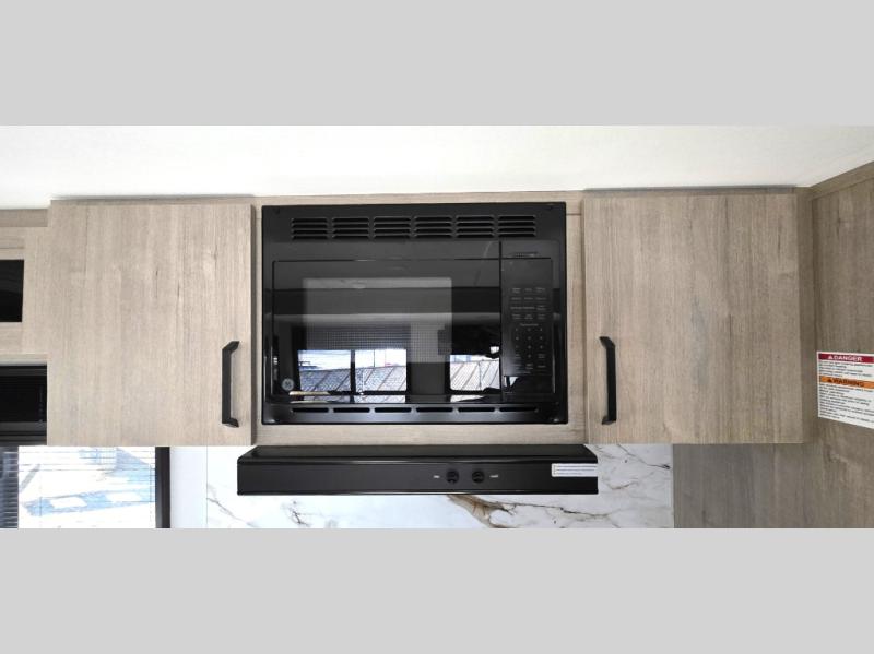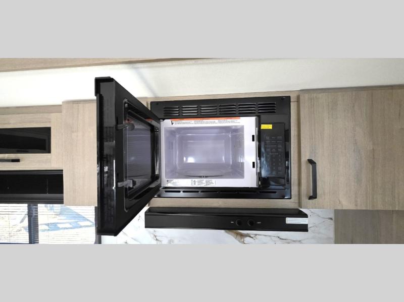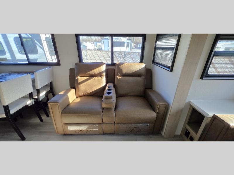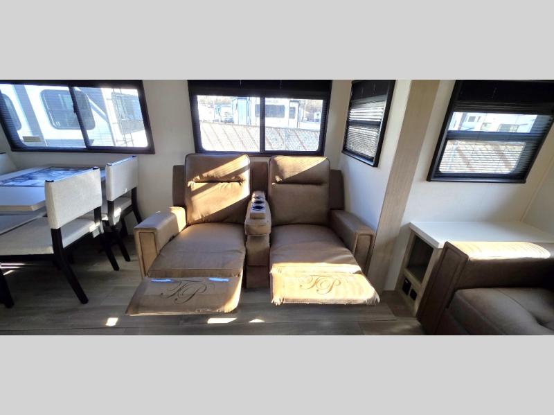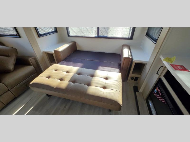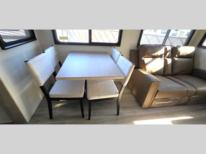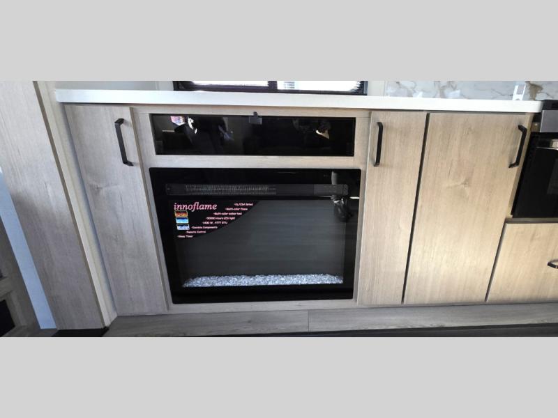 Step inside and you’ll immediately appreciate the wide-open feel created by dual opposing slides in the main living area. Relax in the plush theater seating or stretch out on the theater seating IPO of tri-fold sofa, both perfectly positioned to enjoy the entertainment center featuring a large LED HDTV and cozy fireplace. The table & chairs dinette offers a perfect spot for meals, card games, or planning your next adventure.