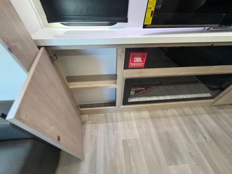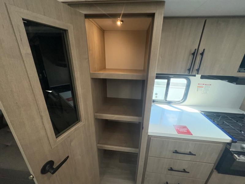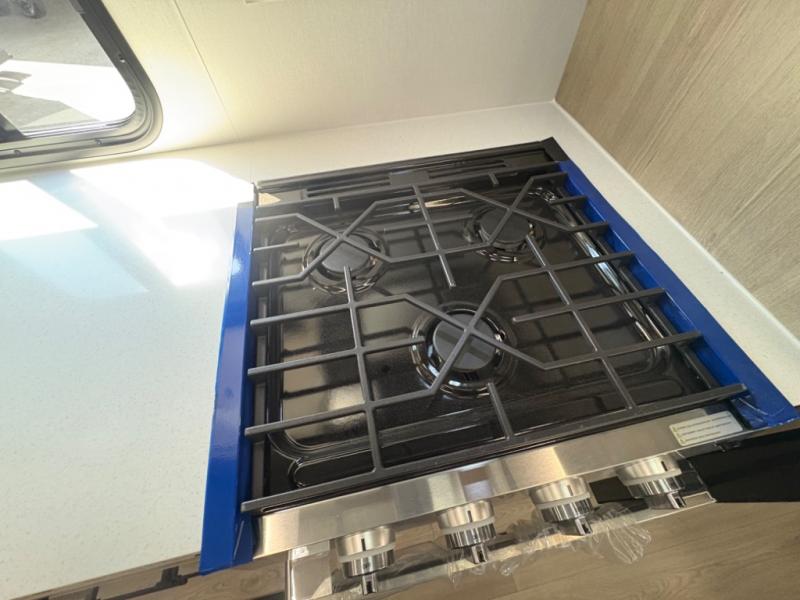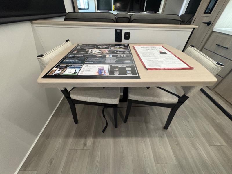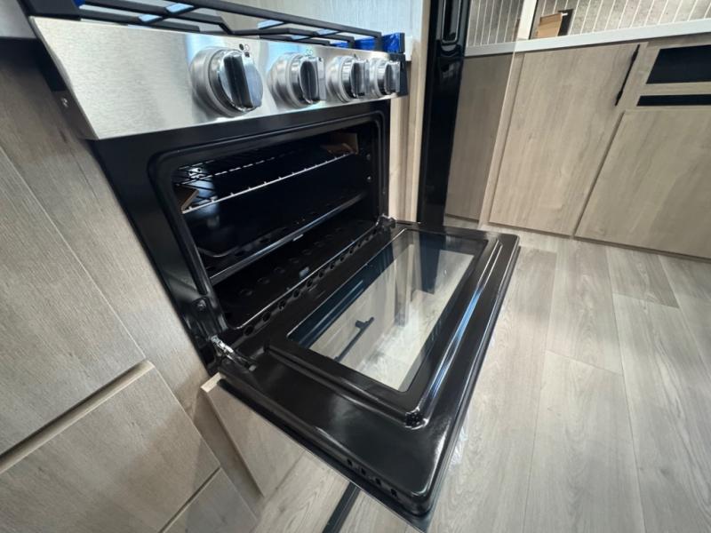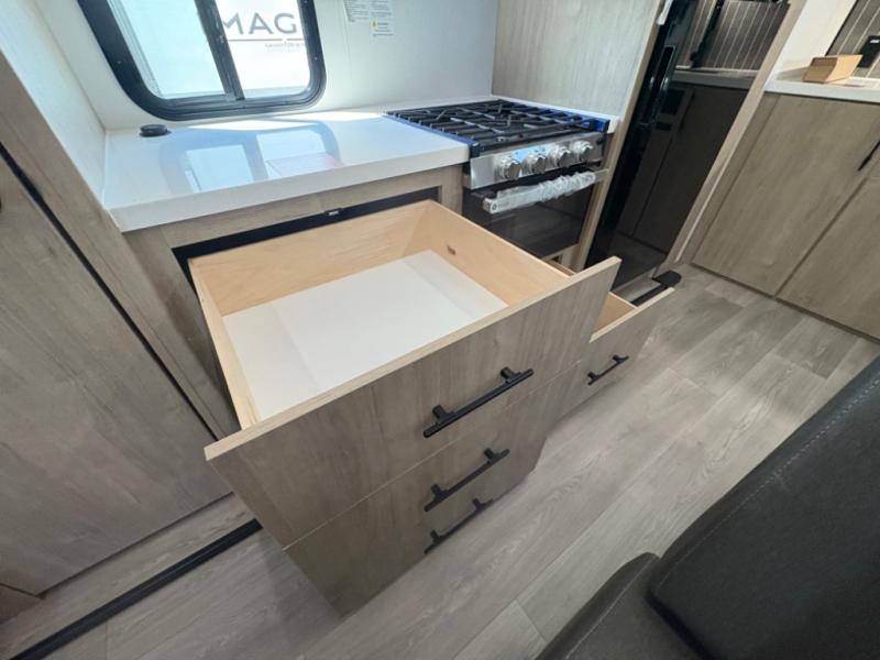 The rear living room on this Imagine travel trailer is just what you'll want when you're looking for a little down time. This room has opposing tri-fold sofas within slides, theater seating, and a LED HDTV. Another place that you can sit down at is the free-standing adjustable dinette. You can sit here with a fresh cup of coffee in the afternoon as you map out your hike for tomorrow. The kitchen offers you a flip-up countertop extension, a microwave, a three-burner range with oven, a 10-cubic foot 12V refrigerator, and pantry to help you make meals, and there is a private bedroom with a 60" x 80" bed to rest on at the end of the day.