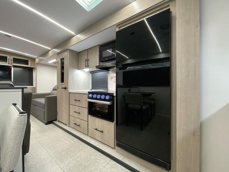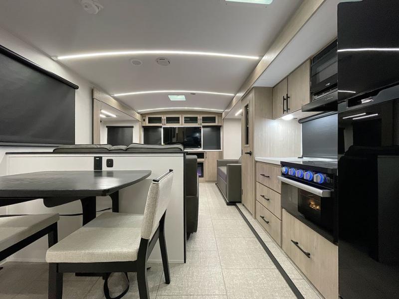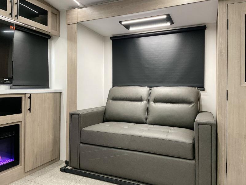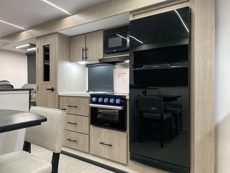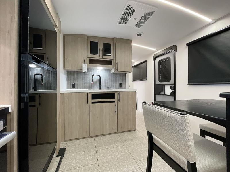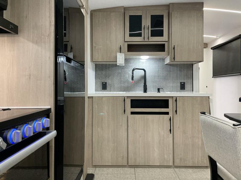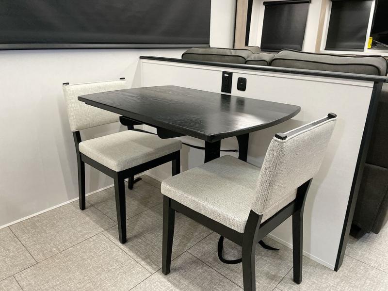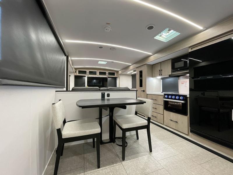 The rear living room on this Imagine travel trailer is just what you'll want when you're looking for a little down time. This room has opposing tri-fold sofas within slides, theater seating, and a LED HDTV. Another place that you can sit down at is the free-standing adjustable dinette. You can sit here with a fresh cup of coffee in the afternoon as you map out your hike for tomorrow. The kitchen offers you a flip-up countertop extension, a microwave, a three-burner range with oven, a 10-cubic foot 12V refrigerator, and pantry to help you make meals, and there is a private bedroom with a 60" x 80" bed to rest on at the end of the day.