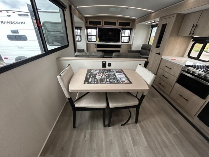 The rear living room on this Imagine travel trailer is just what you'll want when you're looking for a little down time. This room has opposing tri-fold sofas within slides, theater seating, and a LED HDTV. Another place that you can sit down at is the free-standing adjustable dinette. You can sit here with a fresh cup of coffee in the afternoon as you map out your hike for tomorrow. The kitchen offers you a flip-up countertop extension, a microwave, a three-burner range with oven, a 10-cubic foot 12V refrigerator, and pantry to help you make meals, and there is a private bedroom with a 60" x 80" bed to rest on at the end of the day.