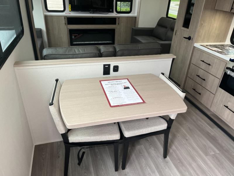 The rear living room on this Imagine travel trailer is just what you'll want when you're looking for a little down time. This room has opposing tri-fold sofas within slides, theater seating, and a LED HDTV. Another place that you can sit down at is the free-standing adjustable dinette. You can sit here with a fresh cup of coffee in the afternoon as you map out your hike for tomorrow. The kitchen offers you a flip-up countertop extension, a microwave, a three-burner range with oven, a 10-cubic foot 12V refrigerator, and pantry to help you make meals, and there is a private bedroom with a 60" x 80" bed to rest on at the end of the day.