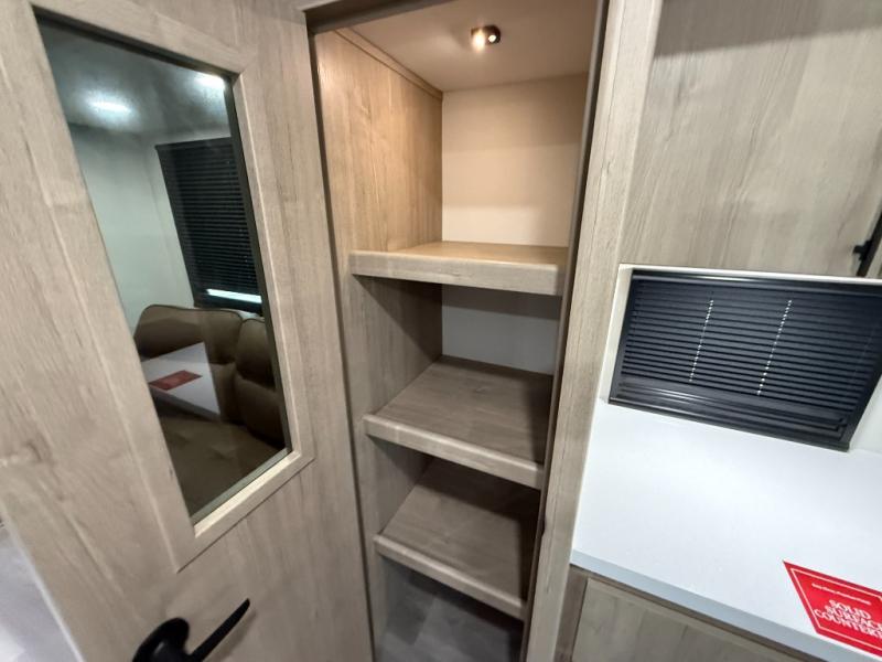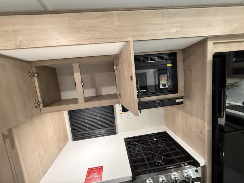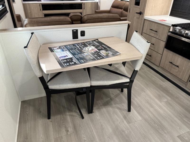 The rear living room on this Imagine travel trailer is just what you'll want when you're looking for a little down time. This room has opposing tri-fold sofas within slides, theater seating, and a LED HDTV. Another place that you can sit down at is the free-standing adjustable dinette. You can sit here with a fresh cup of coffee in the afternoon as you map out your hike for tomorrow. The kitchen offers you a flip-up countertop extension, a microwave, a three-burner range with oven, a 10-cubic foot 12V refrigerator, and pantry to help you make meals, and there is a private bedroom with a 60" x 80" bed to rest on at the end of the day.